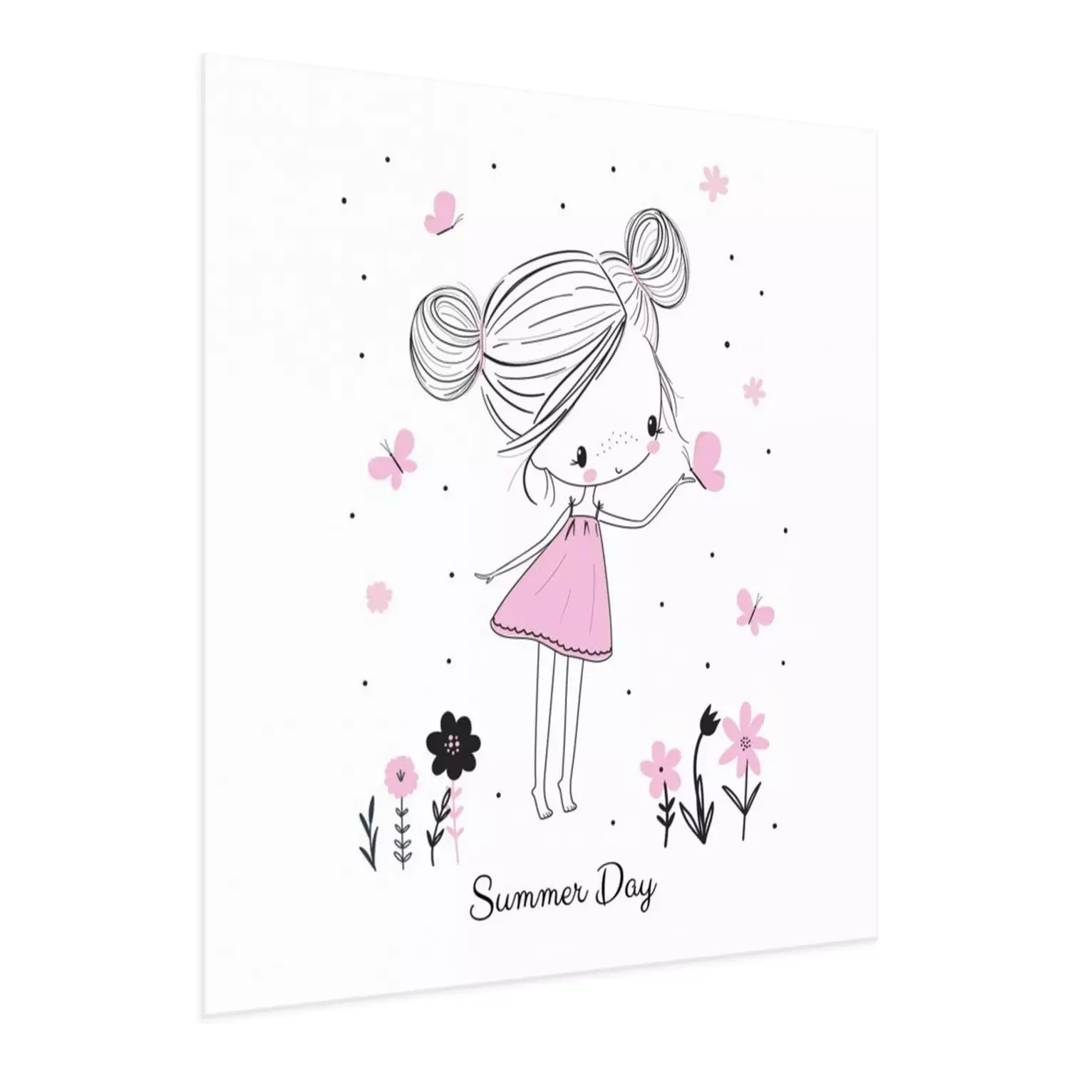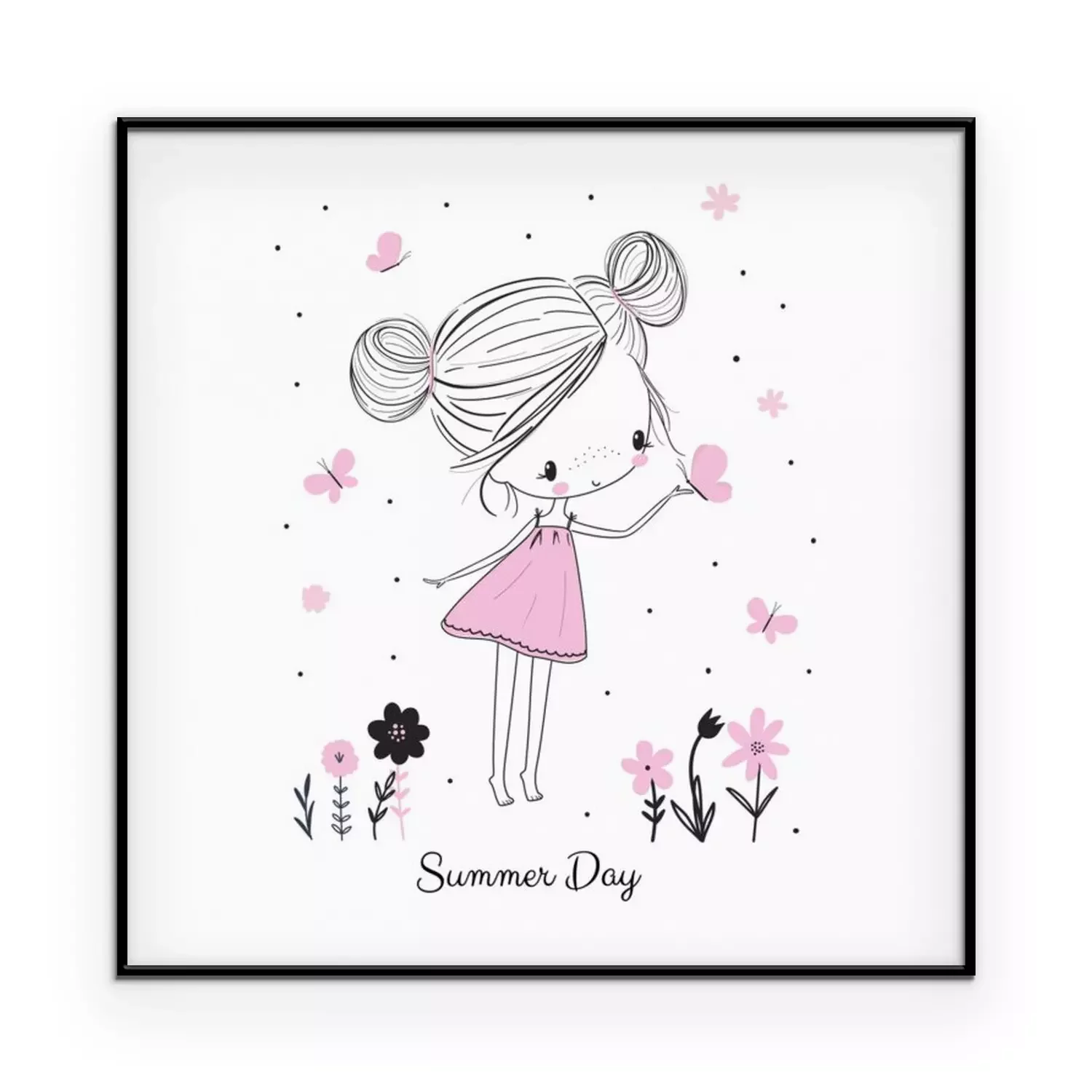 Poster : Une fille en robe rose et un papillon volant vers elle