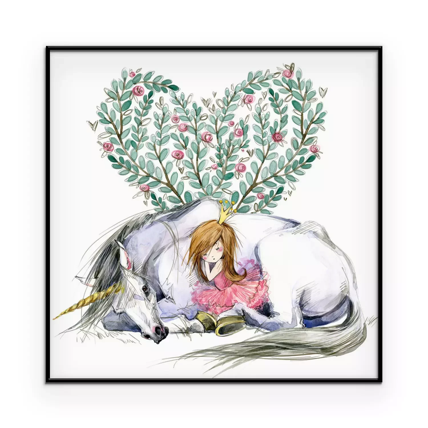 Poster : Une licorne allongée et une princesse qui dort dessus