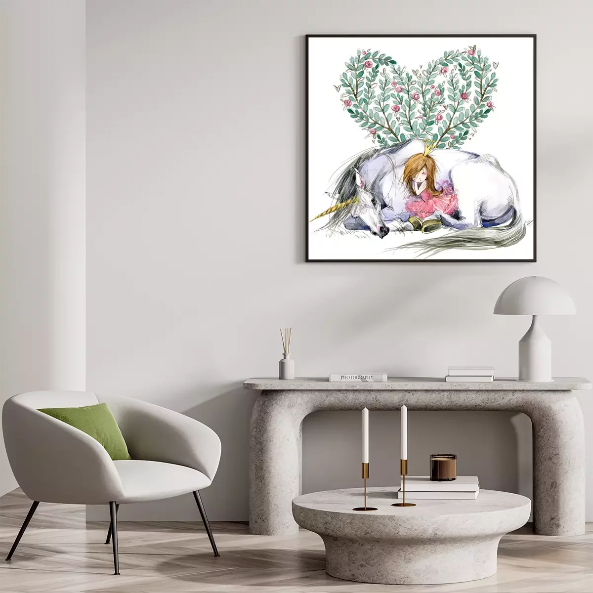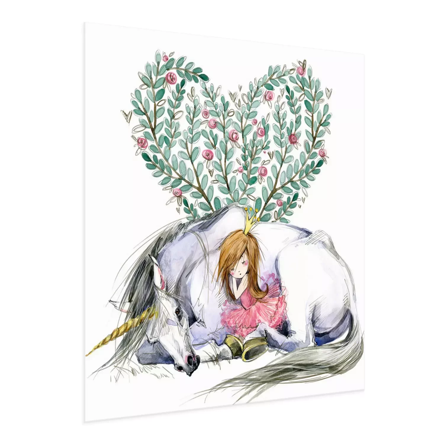 Poster  Une licorne allongée et une princesse qui dort dessus