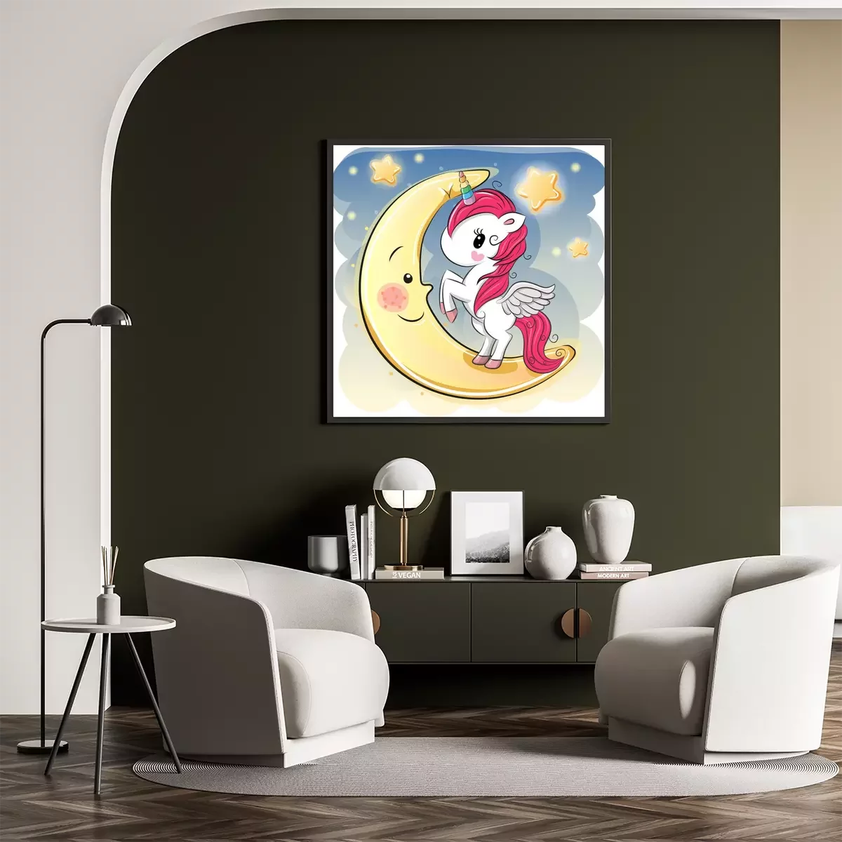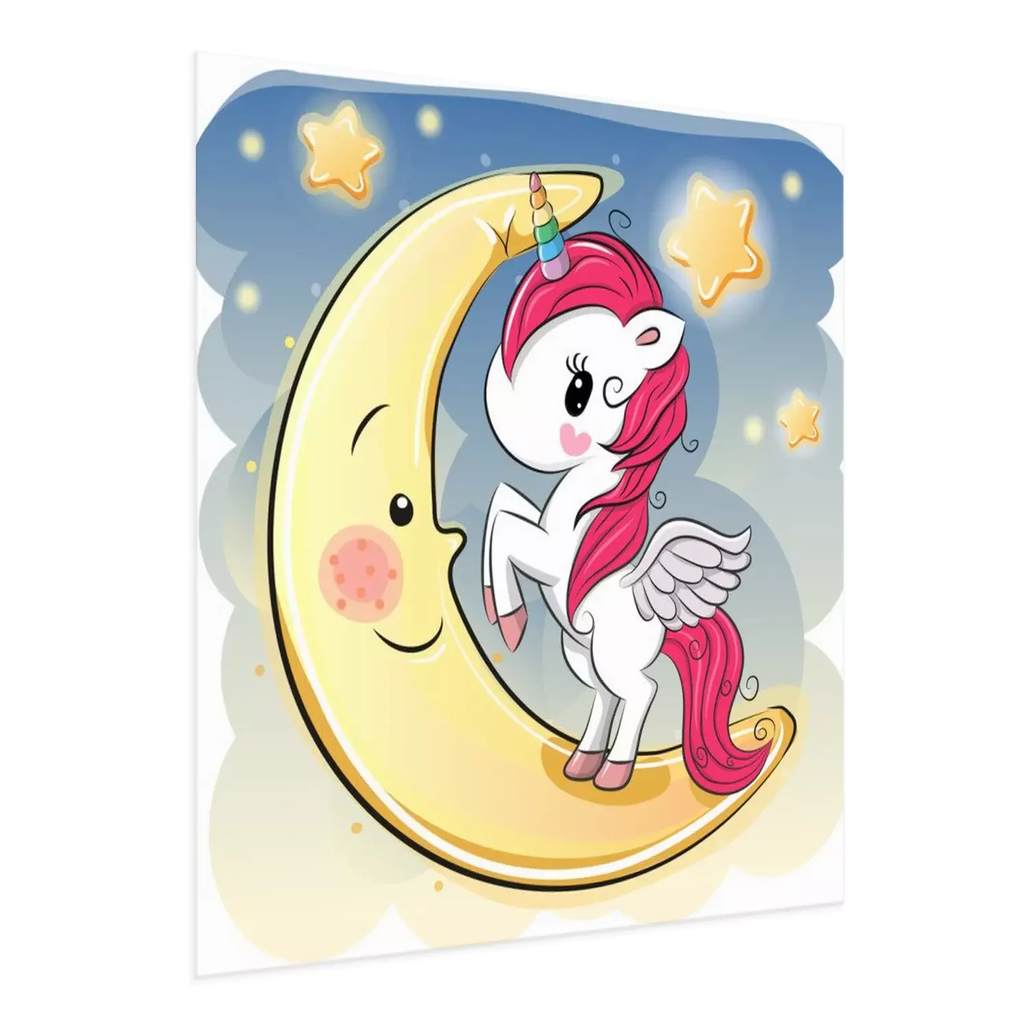 Poster : Une licorne debout sur une lune souriante