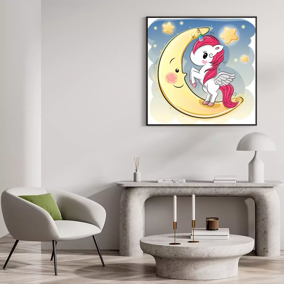 Poster  Une licorne debout sur une lune souriante