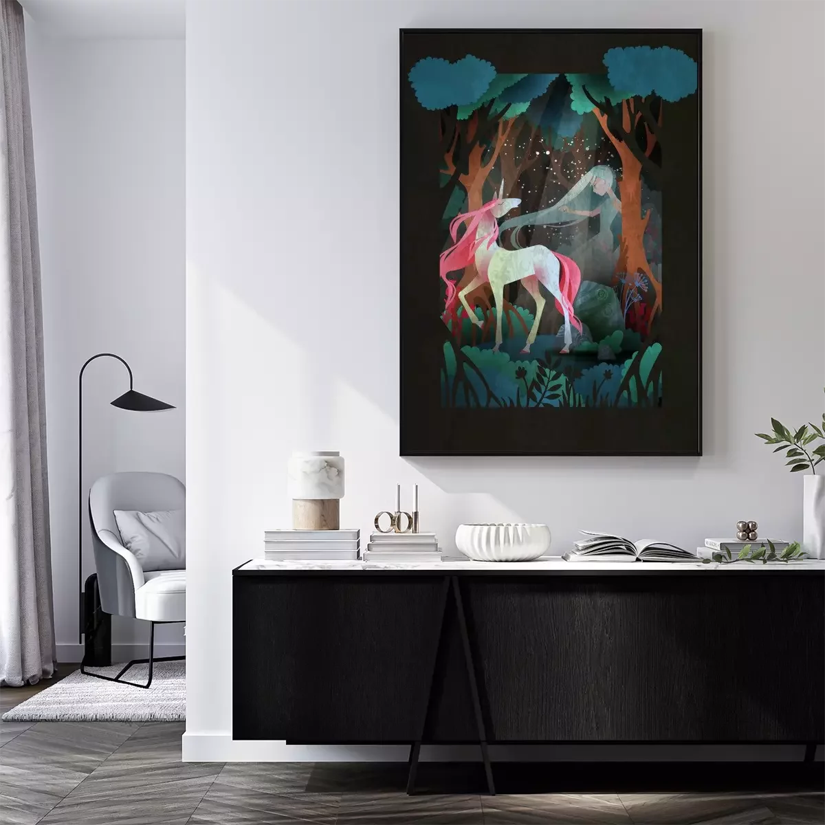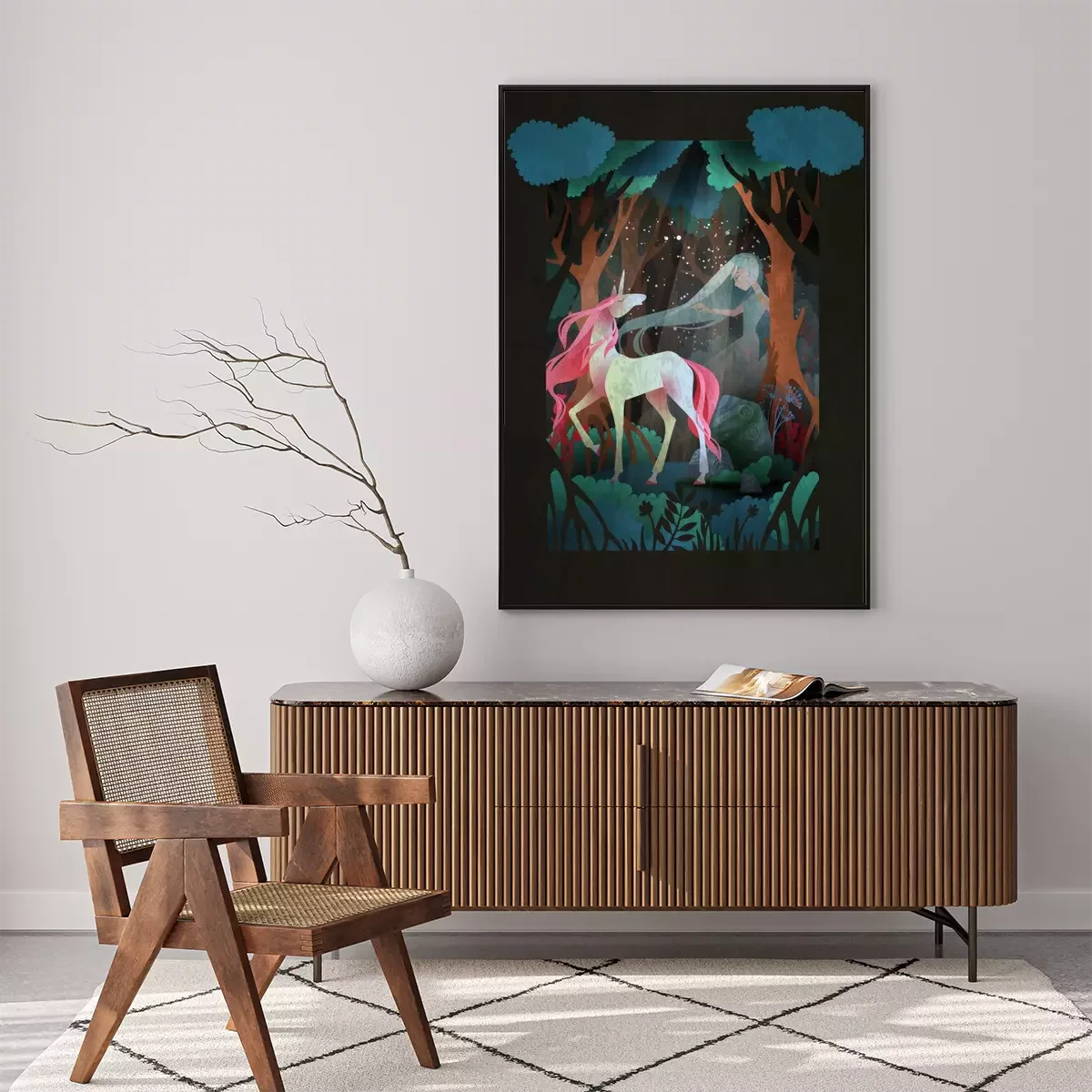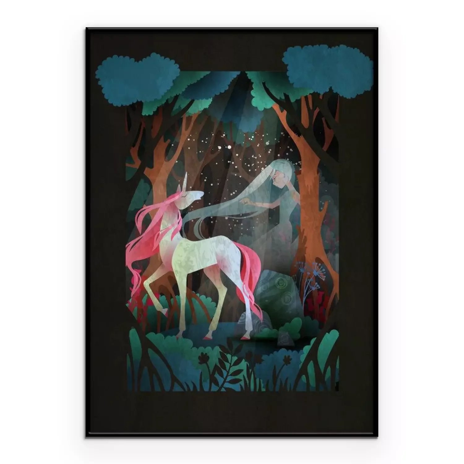 Poster : Une licorne et une nymphe de la forêt parmi les arbres