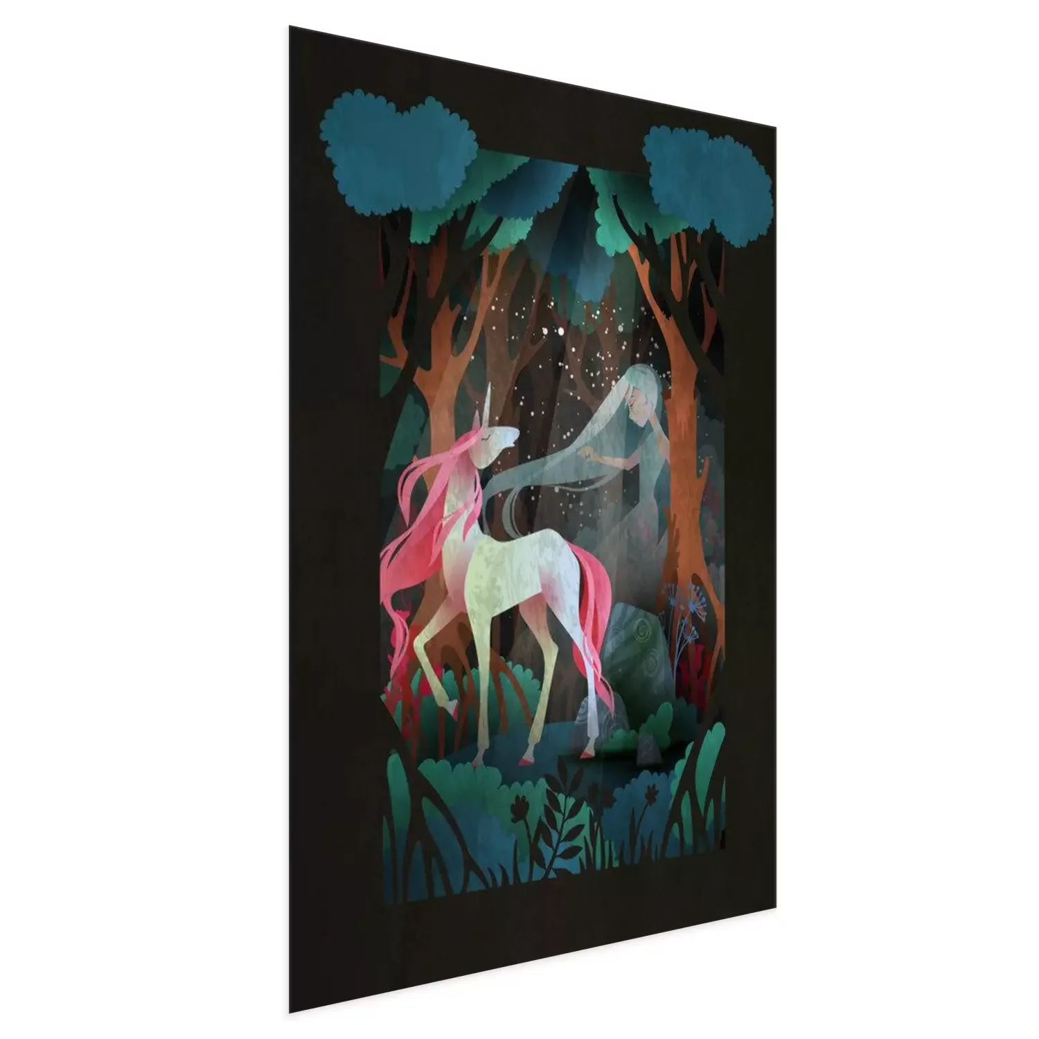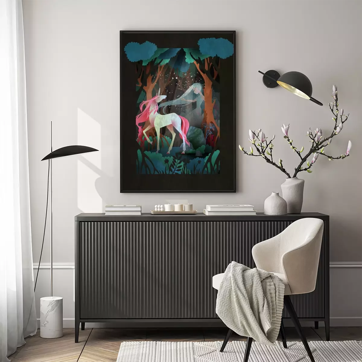 Poster  Une licorne et une nymphe de la forêt parmi les arbres