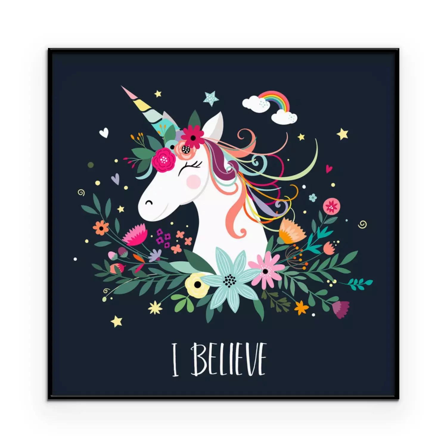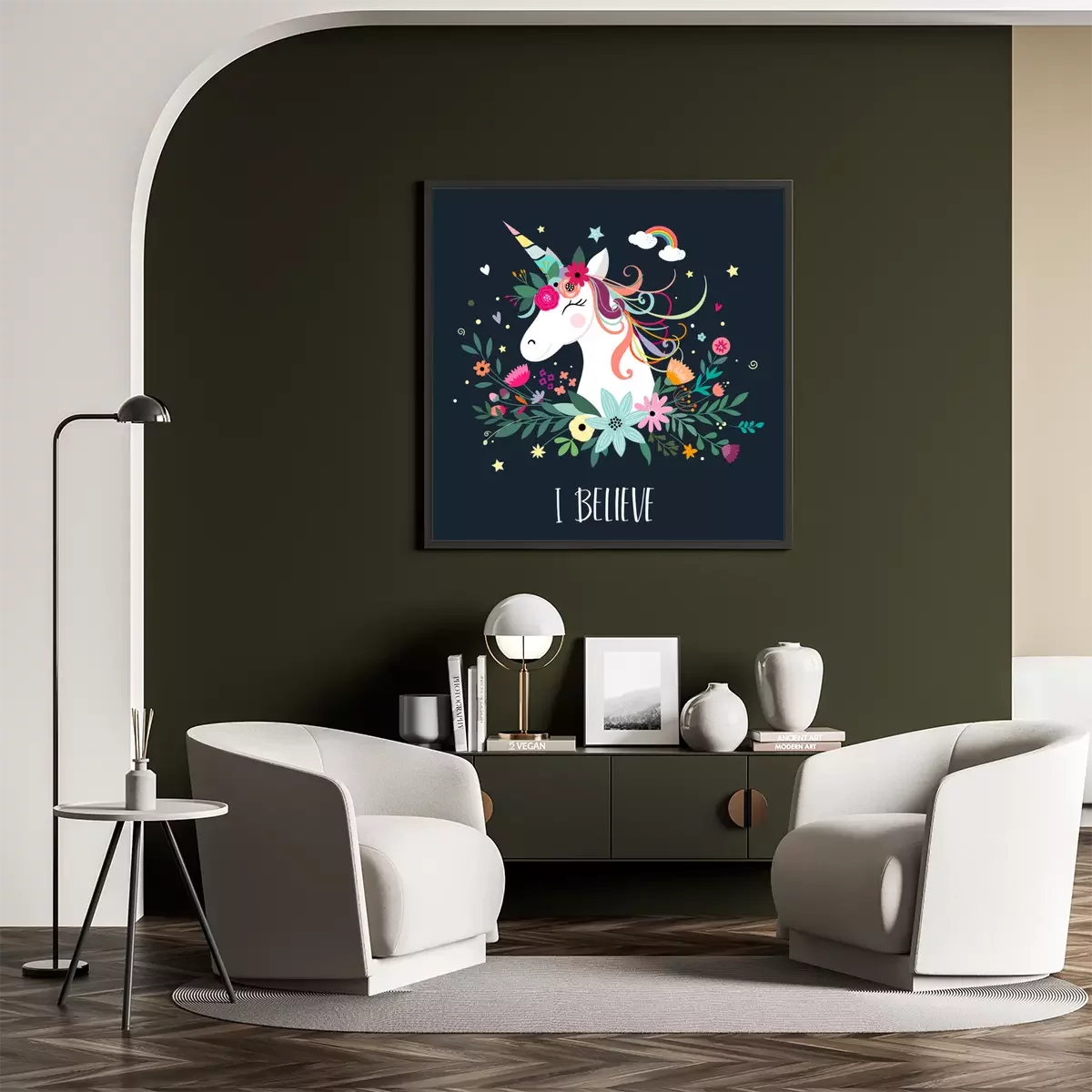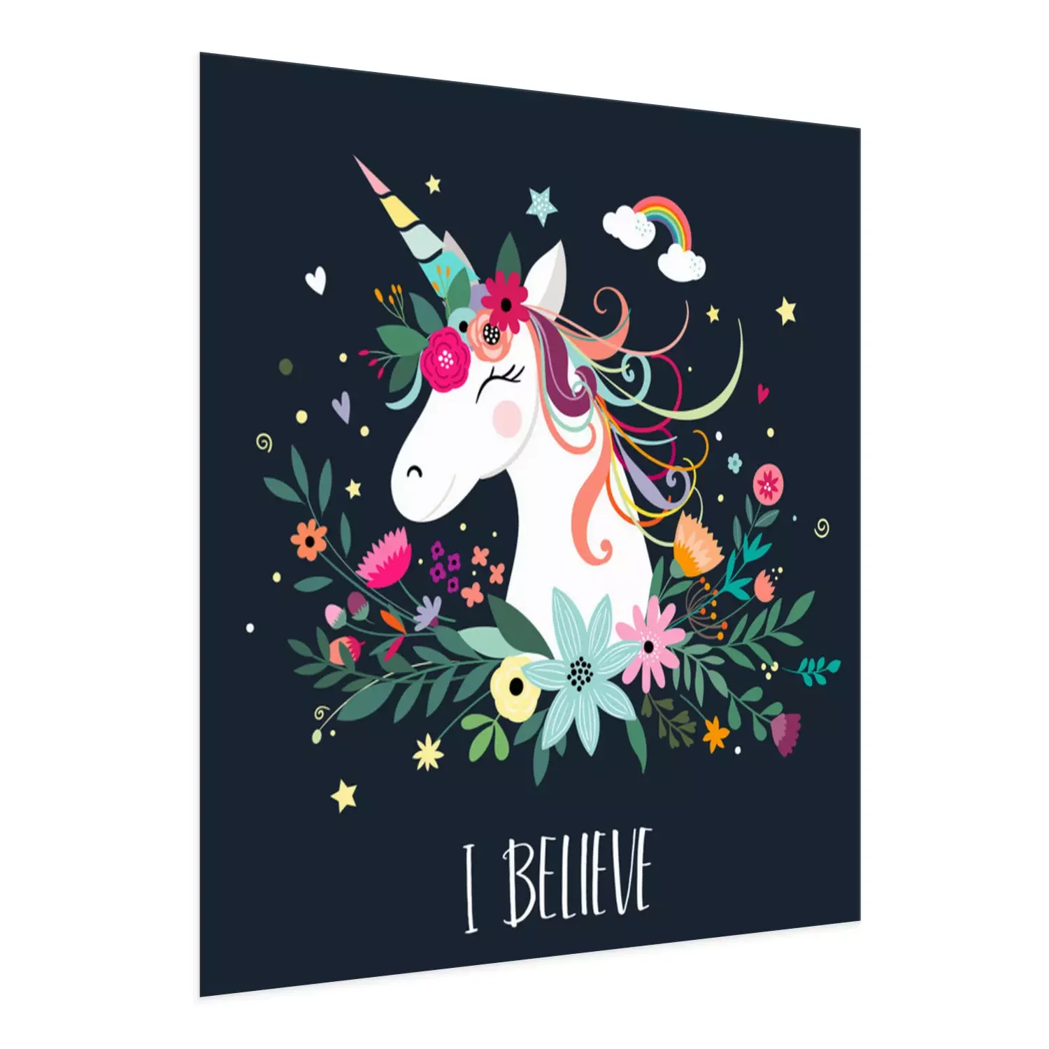 Poster  Une licorne jetant un coup d'œil derrière les fleurs