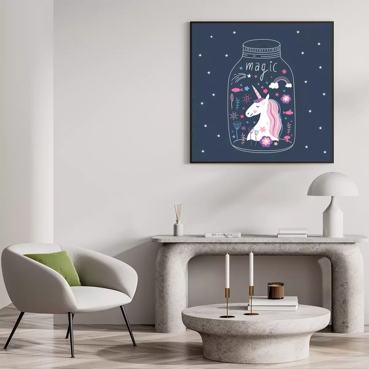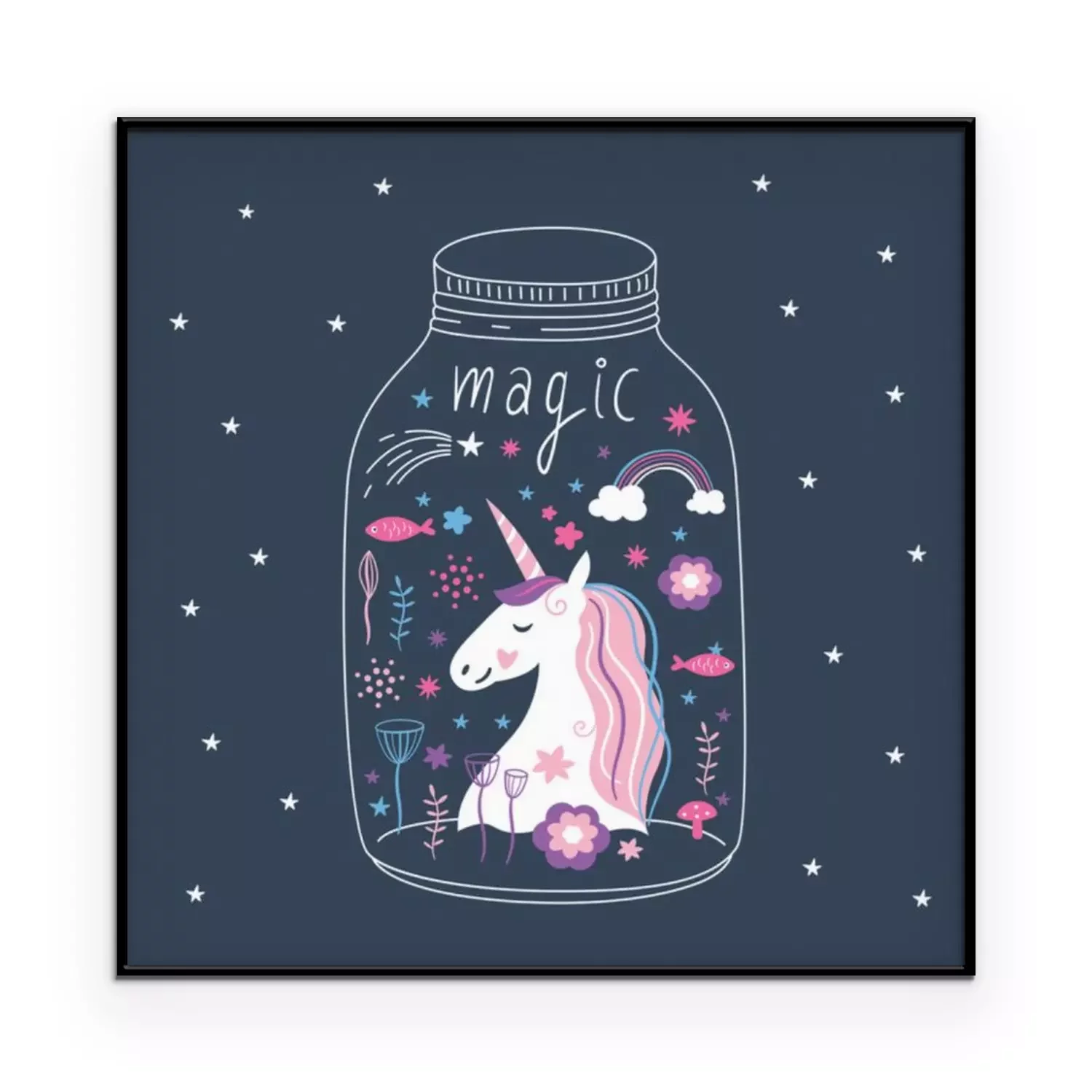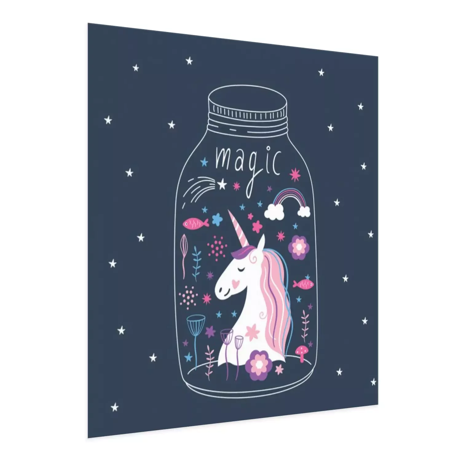 Poster : Une licorne souriante enfermée dans un bocal
