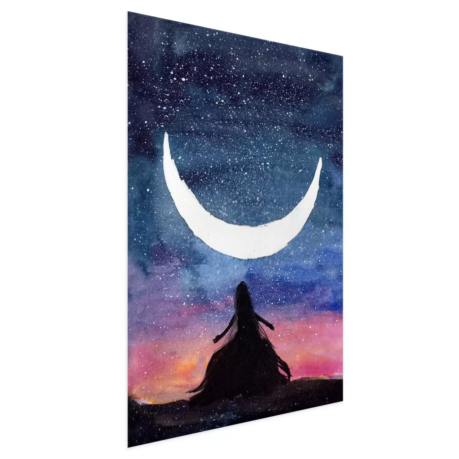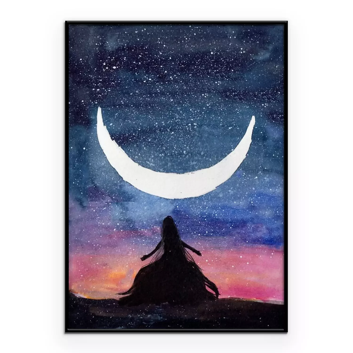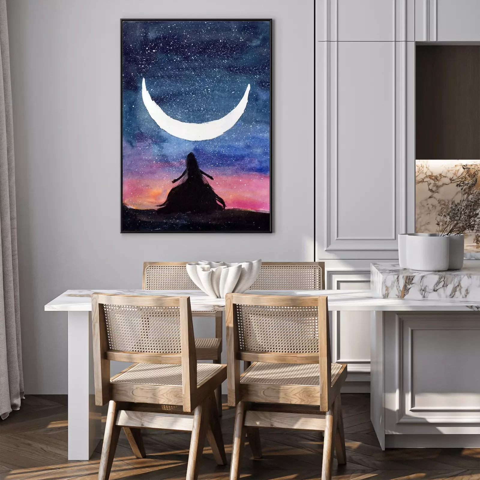 Poster : Une lune blanche parmi un million d'étoiles et une figure de femme