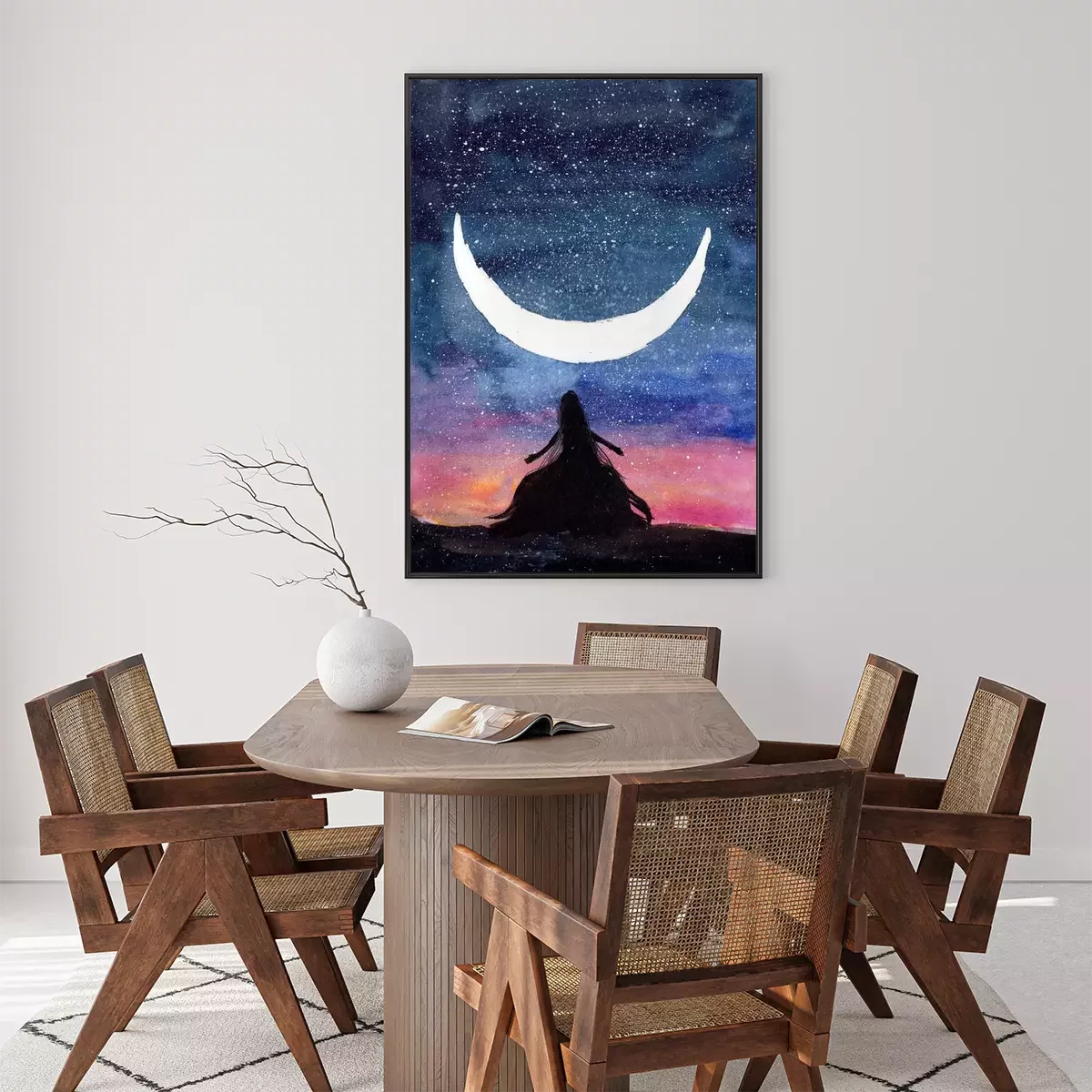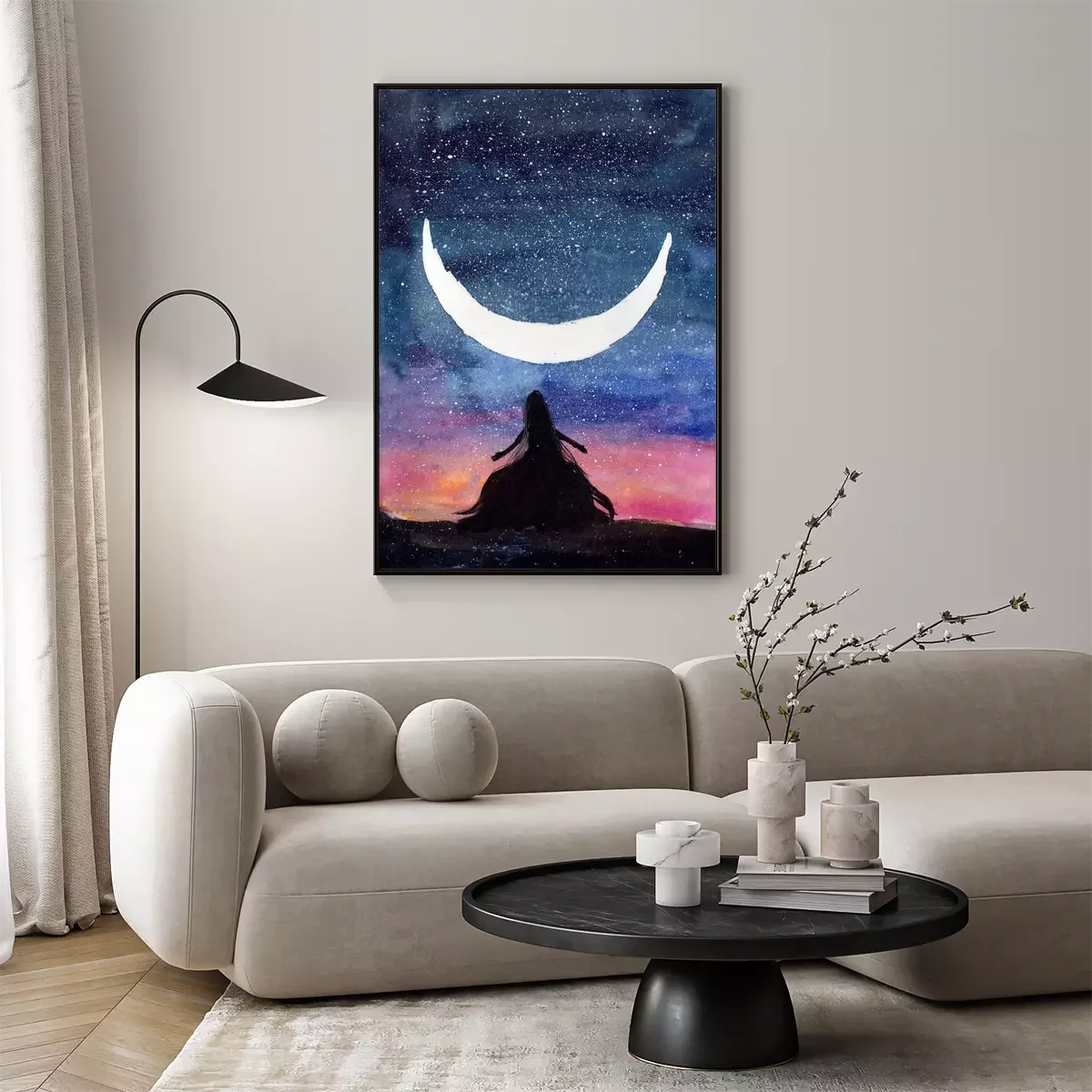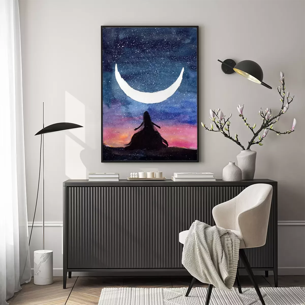 Poster : Une lune blanche parmi un million d'étoiles et une figure de femme