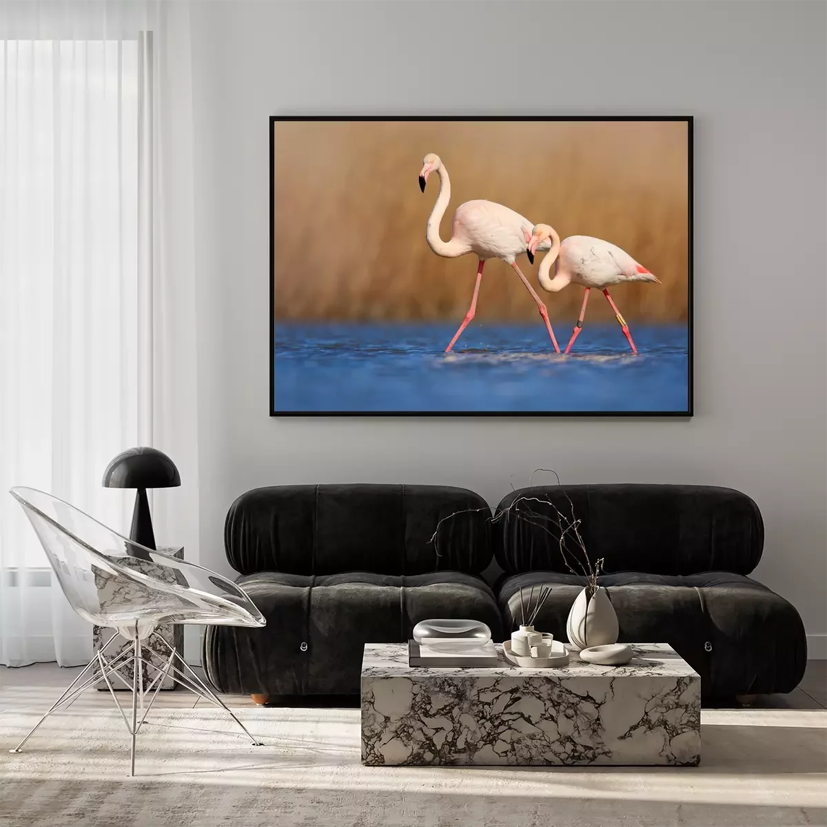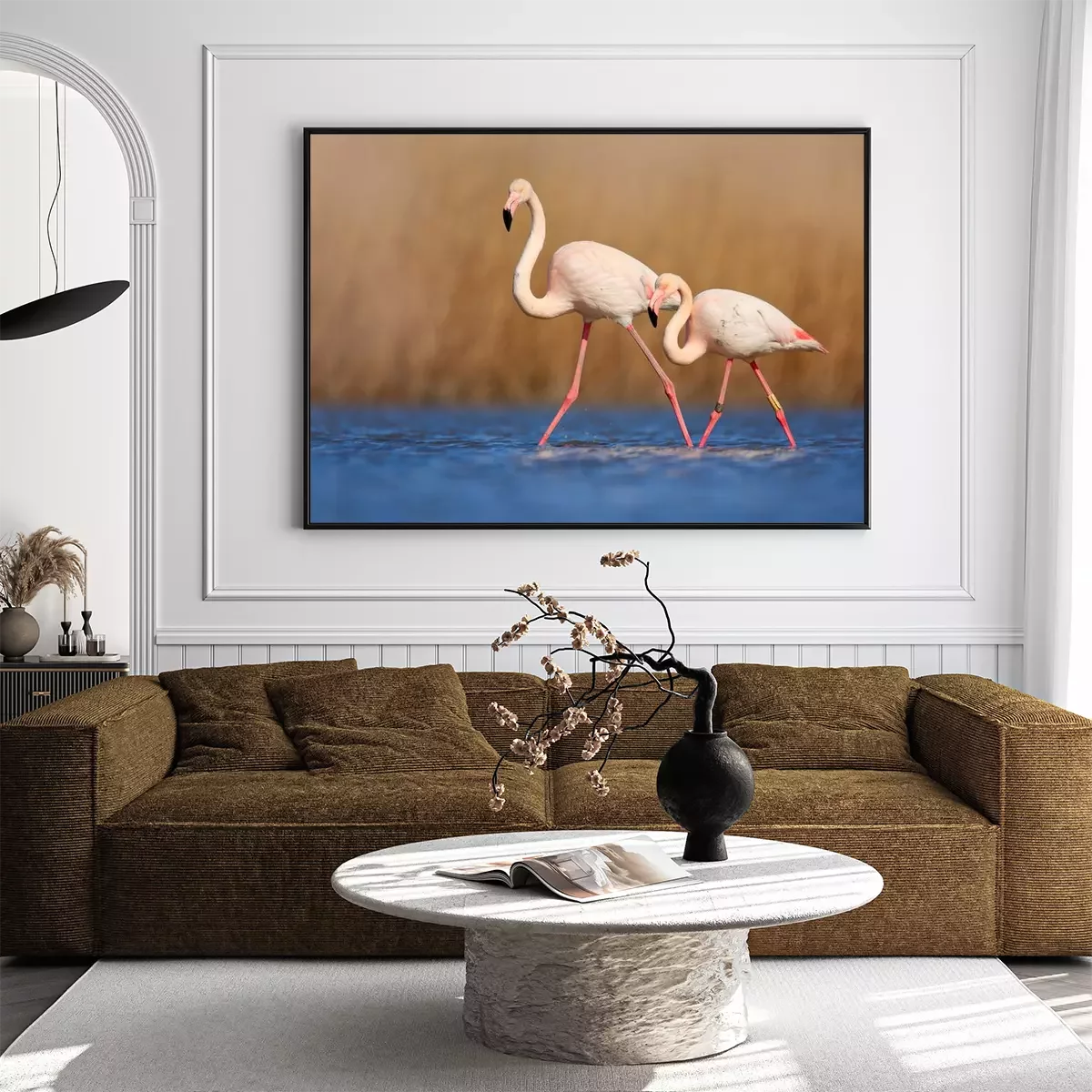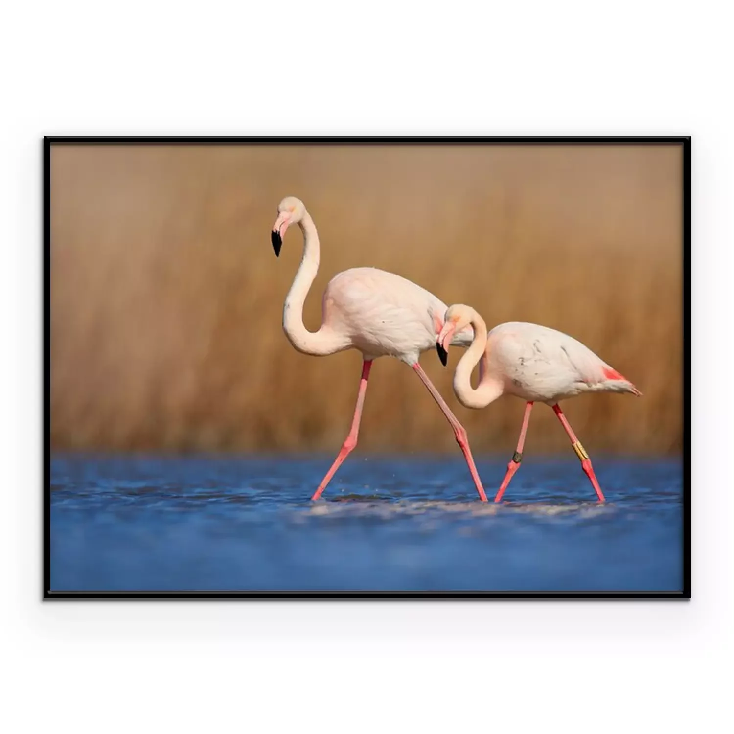 Poster  Une paire de flamants roses pataugeant dans l'eau
