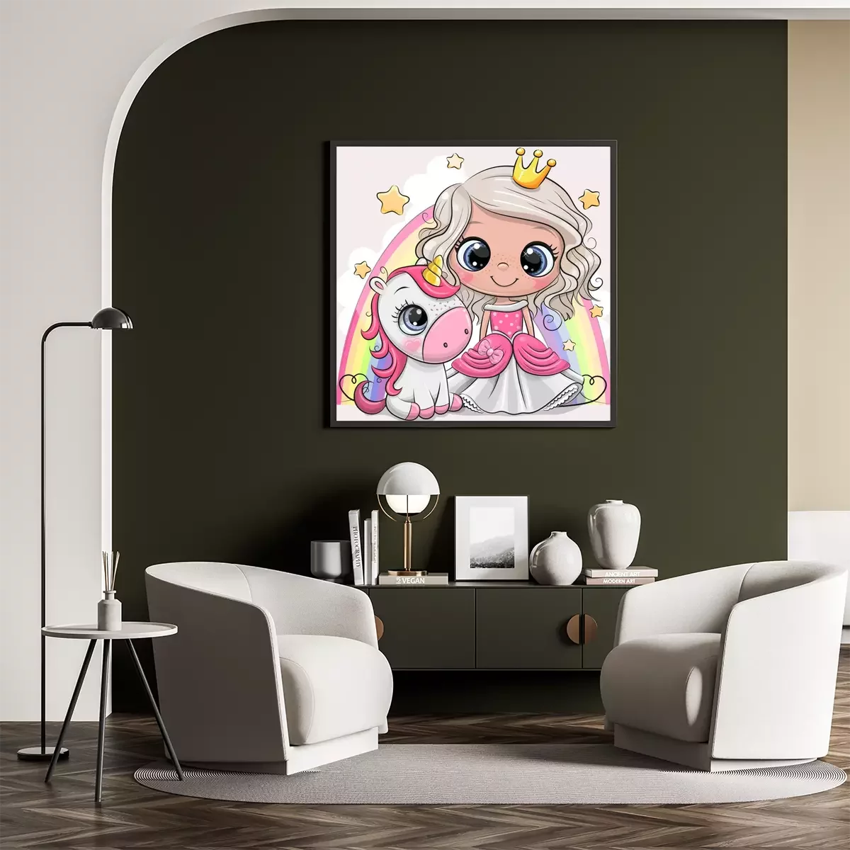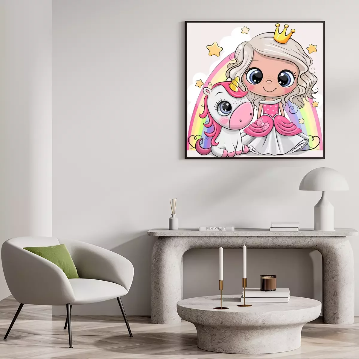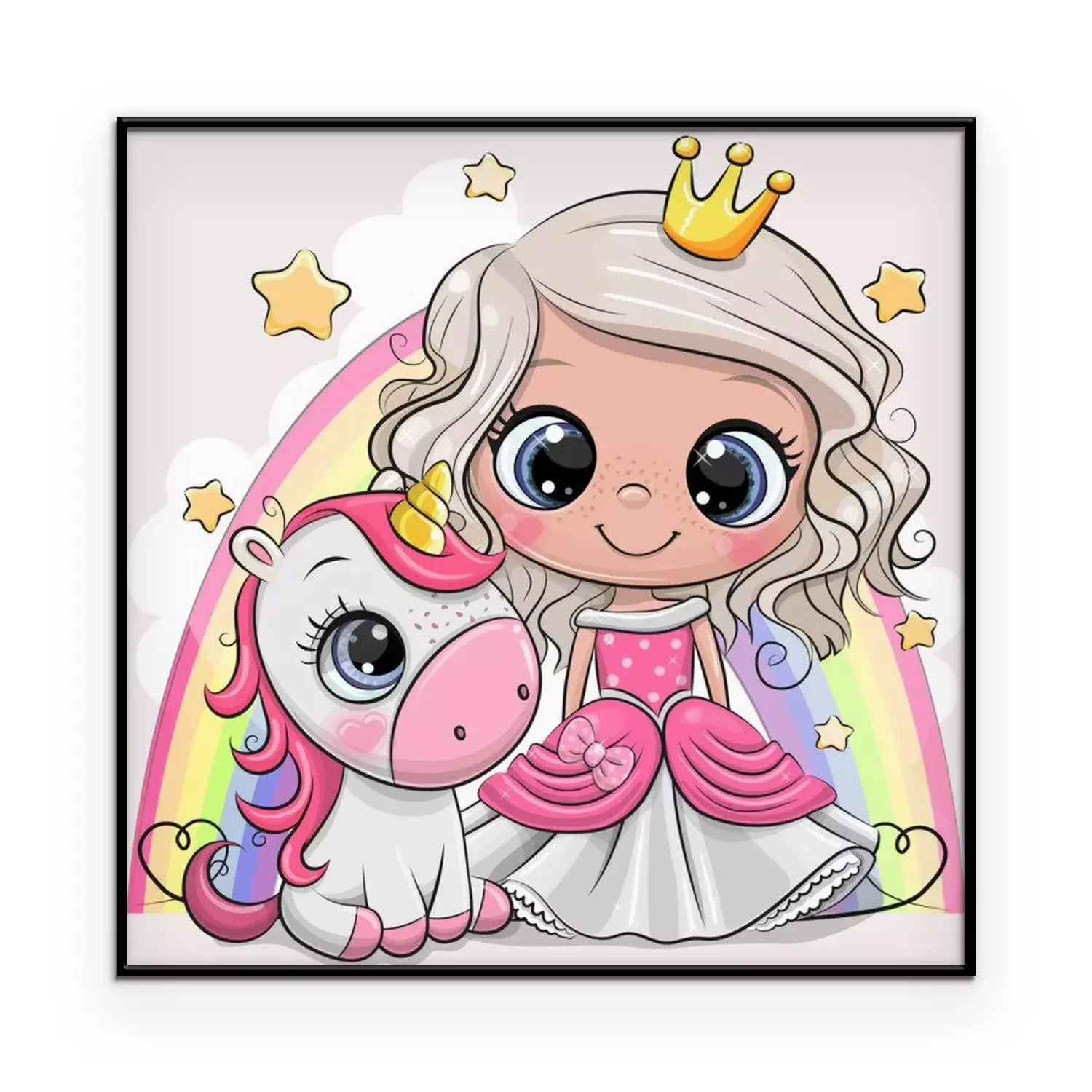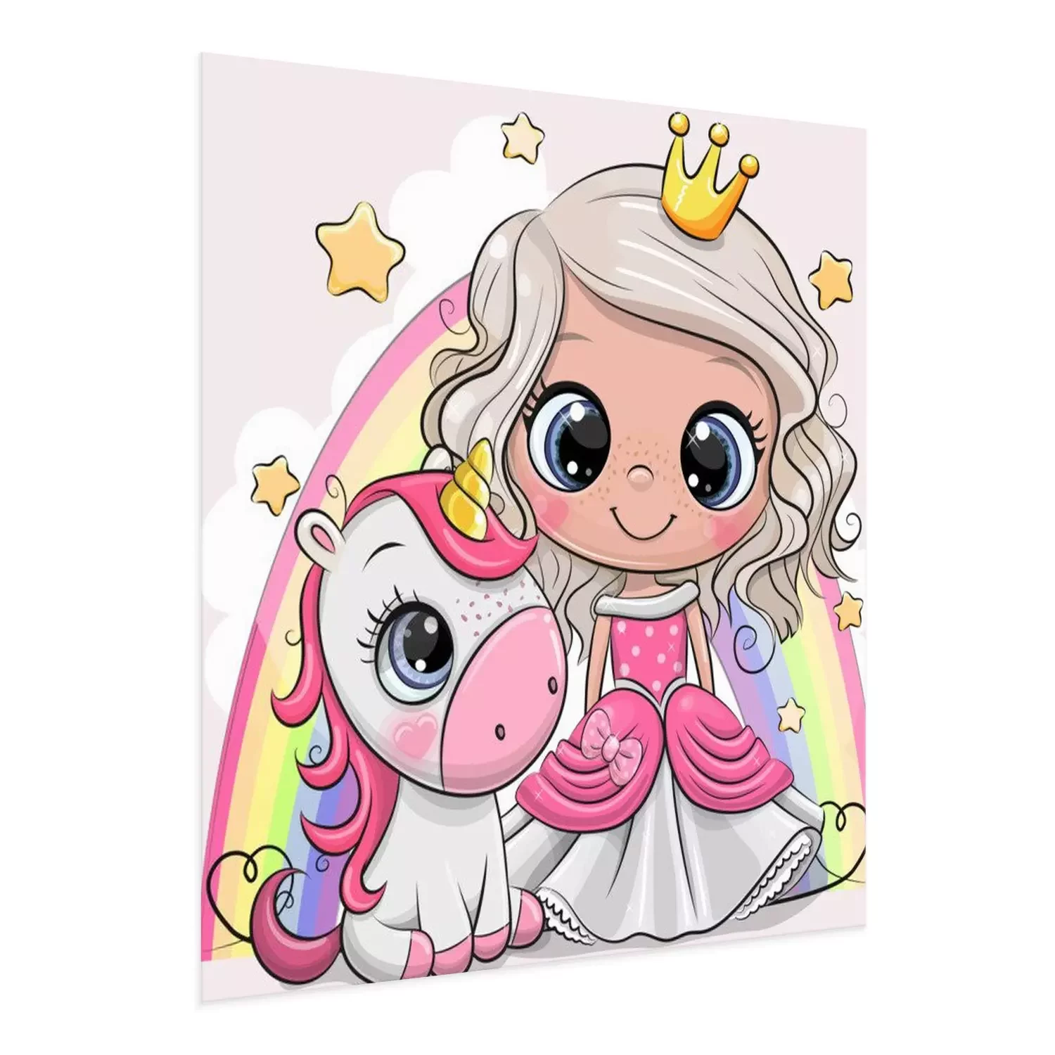 Poster : Une princesse et une licorne sur fond d'arc-en-ciel multicolore