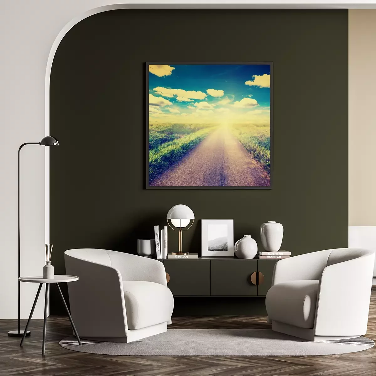 Poster  Une route de campagne traversant de vastes champs