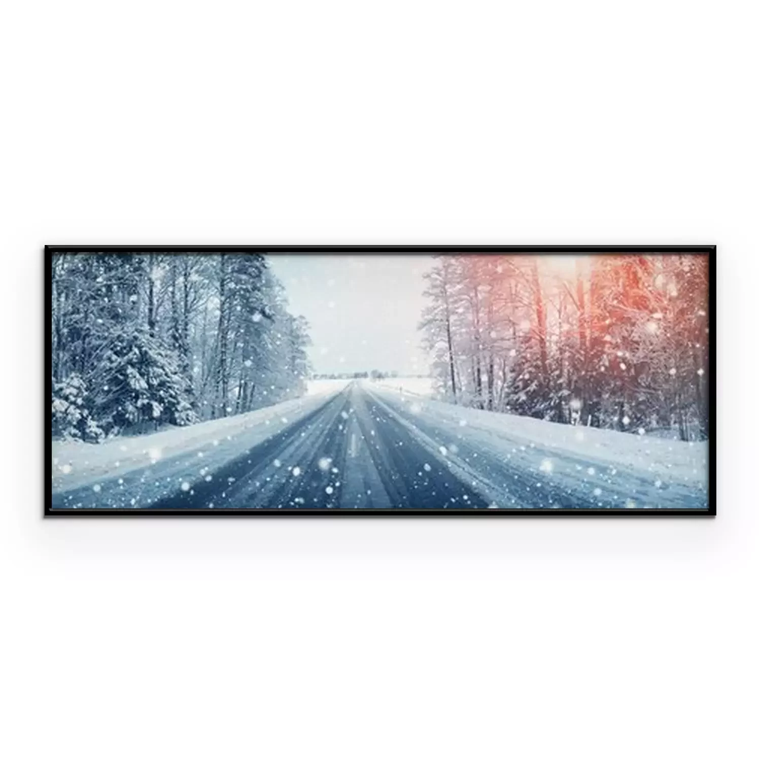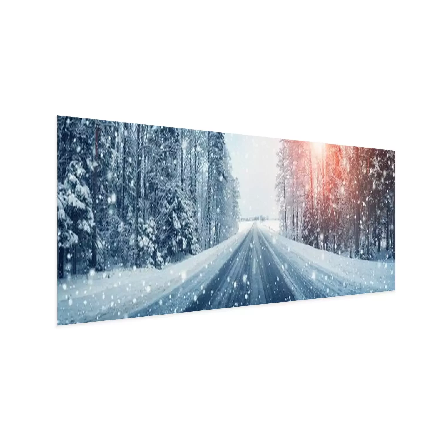 Poster : Une route droite coupant à travers une forêt d'hiver