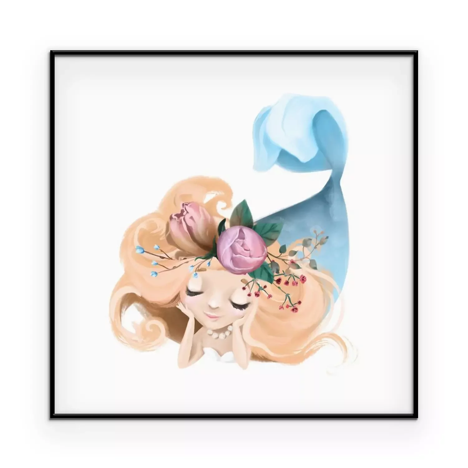 Poster : Une sirène avec une queue bleue et des fleurs dans les cheveux
