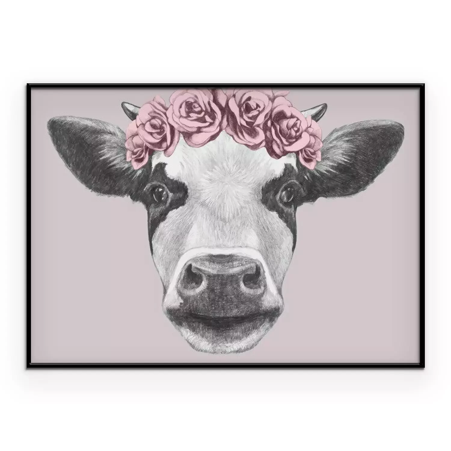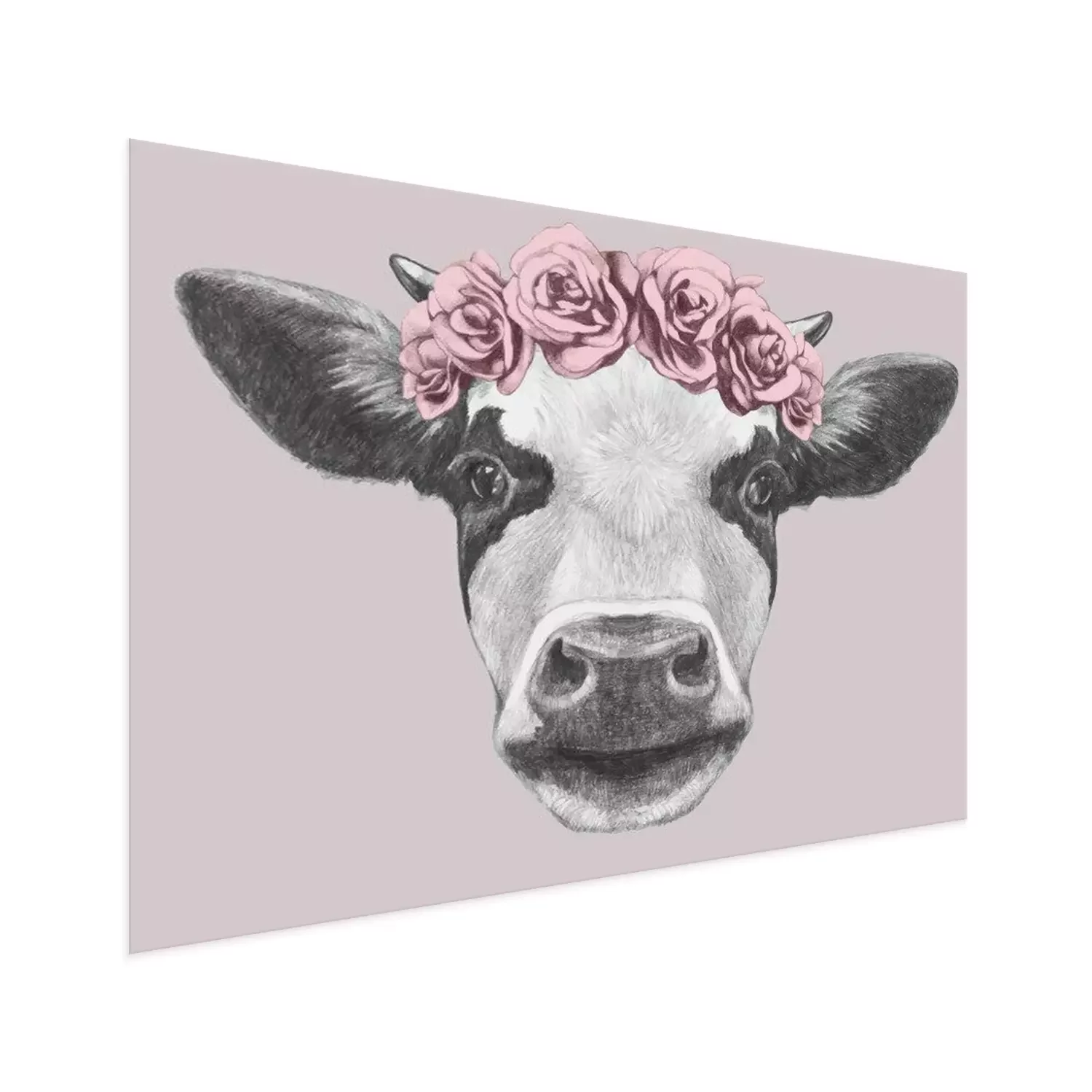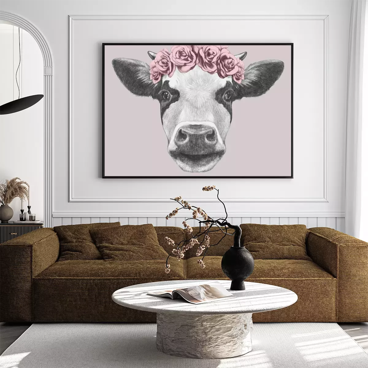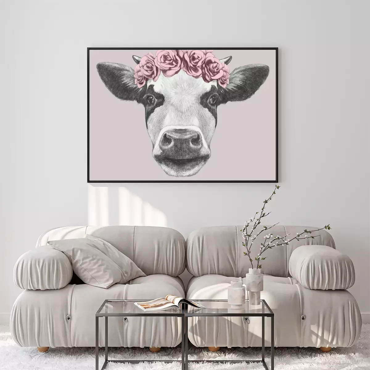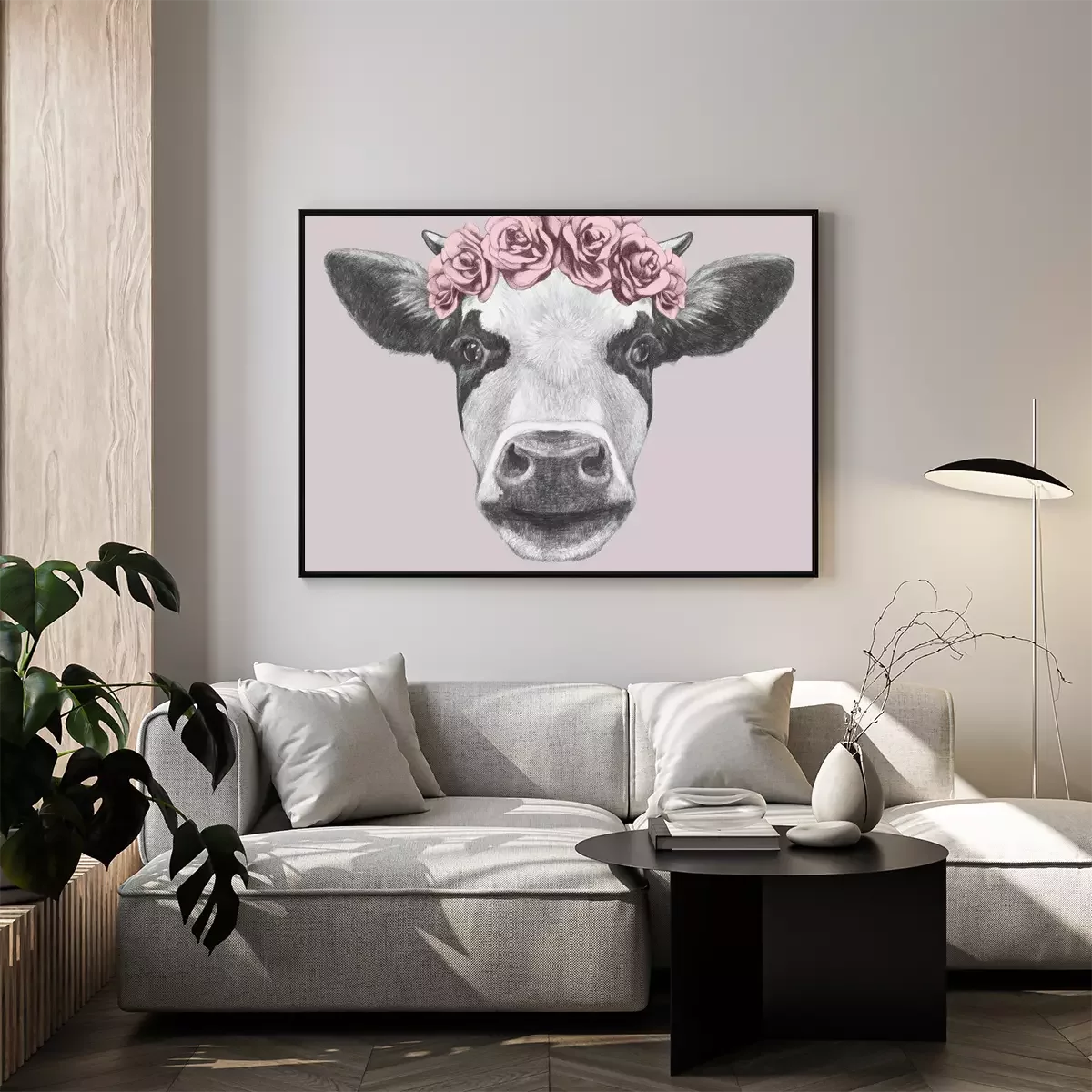 Poster  Vache avec une couronne de fleurs sur fond rose version dessin animé