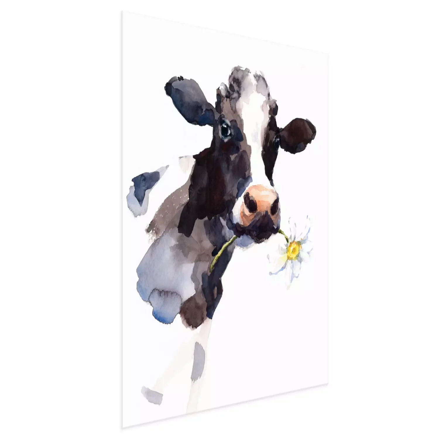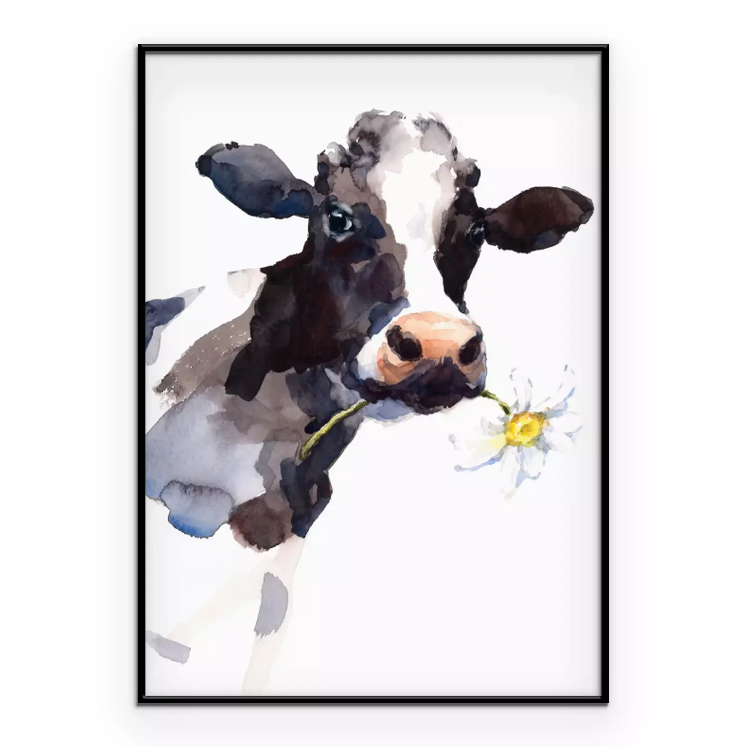 Poster  Vache noire et blanche avec une fleur dans sa bouche aquarelle