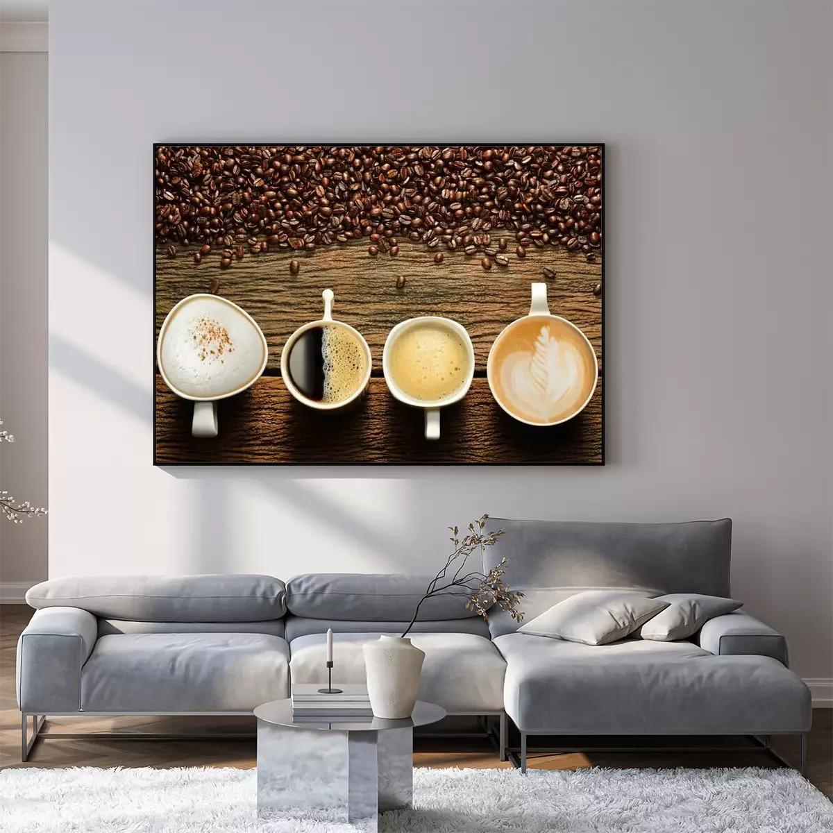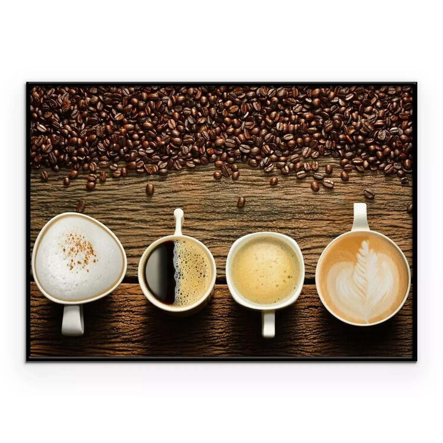 Poster  Variété de tasses de café et les fèves sur table en bois ancien