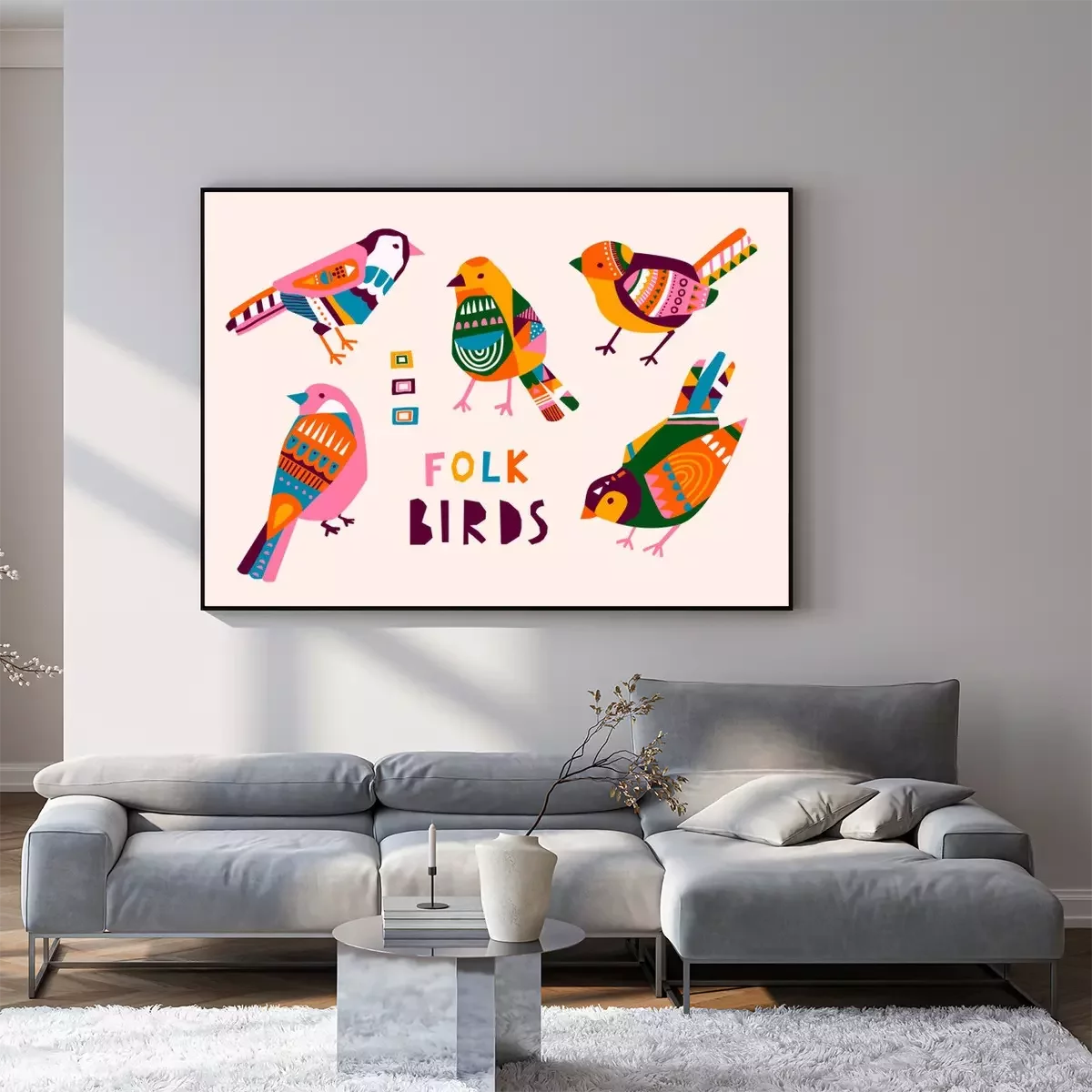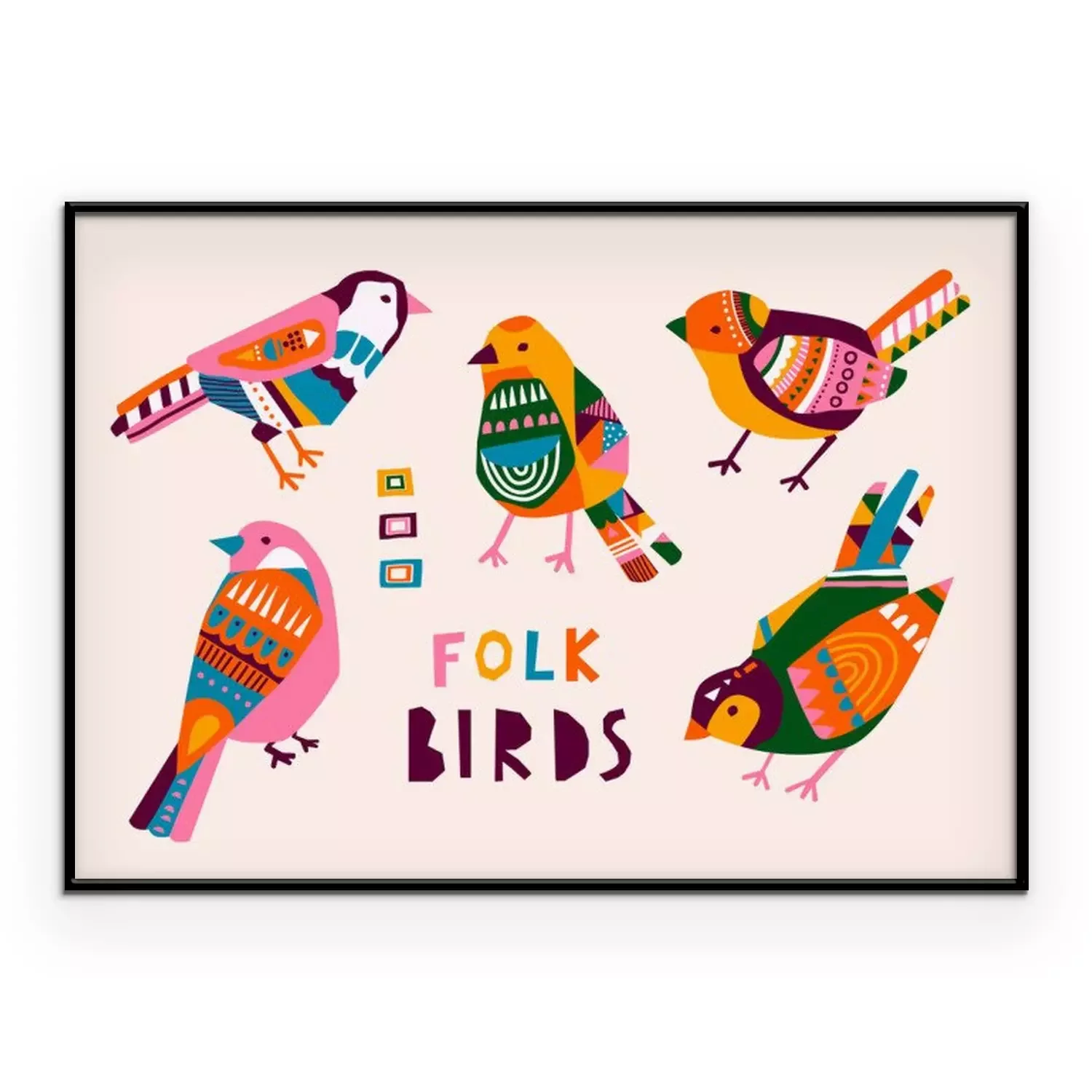 Poster  Various birds with different folk ornaments. Paper cut scandinavian style. Flat design. Hand drawn colored vector set. Modern trendy illustration. All elements are isolated