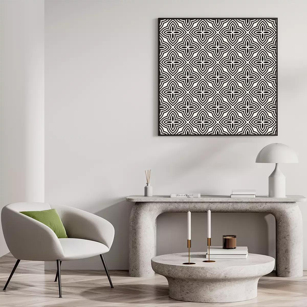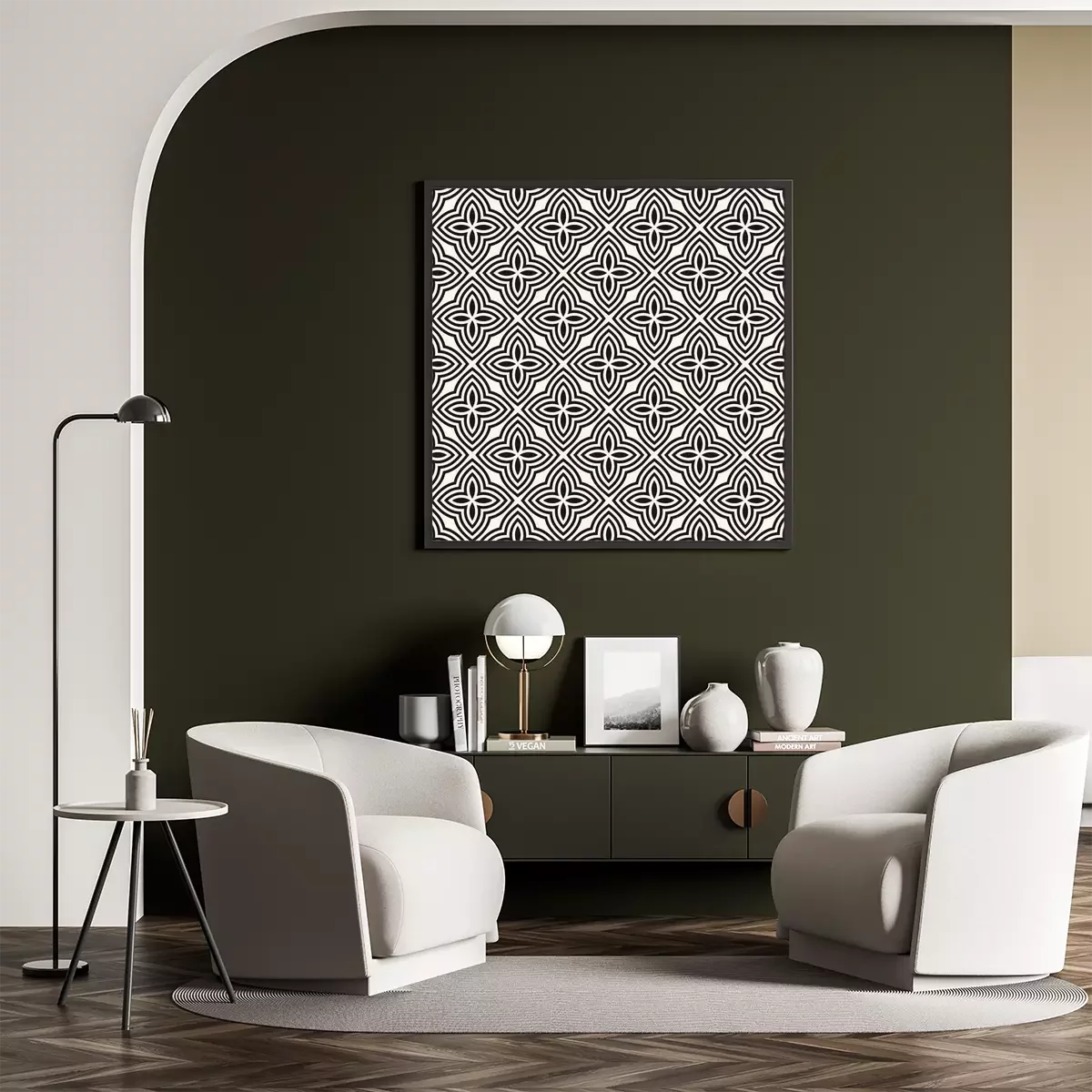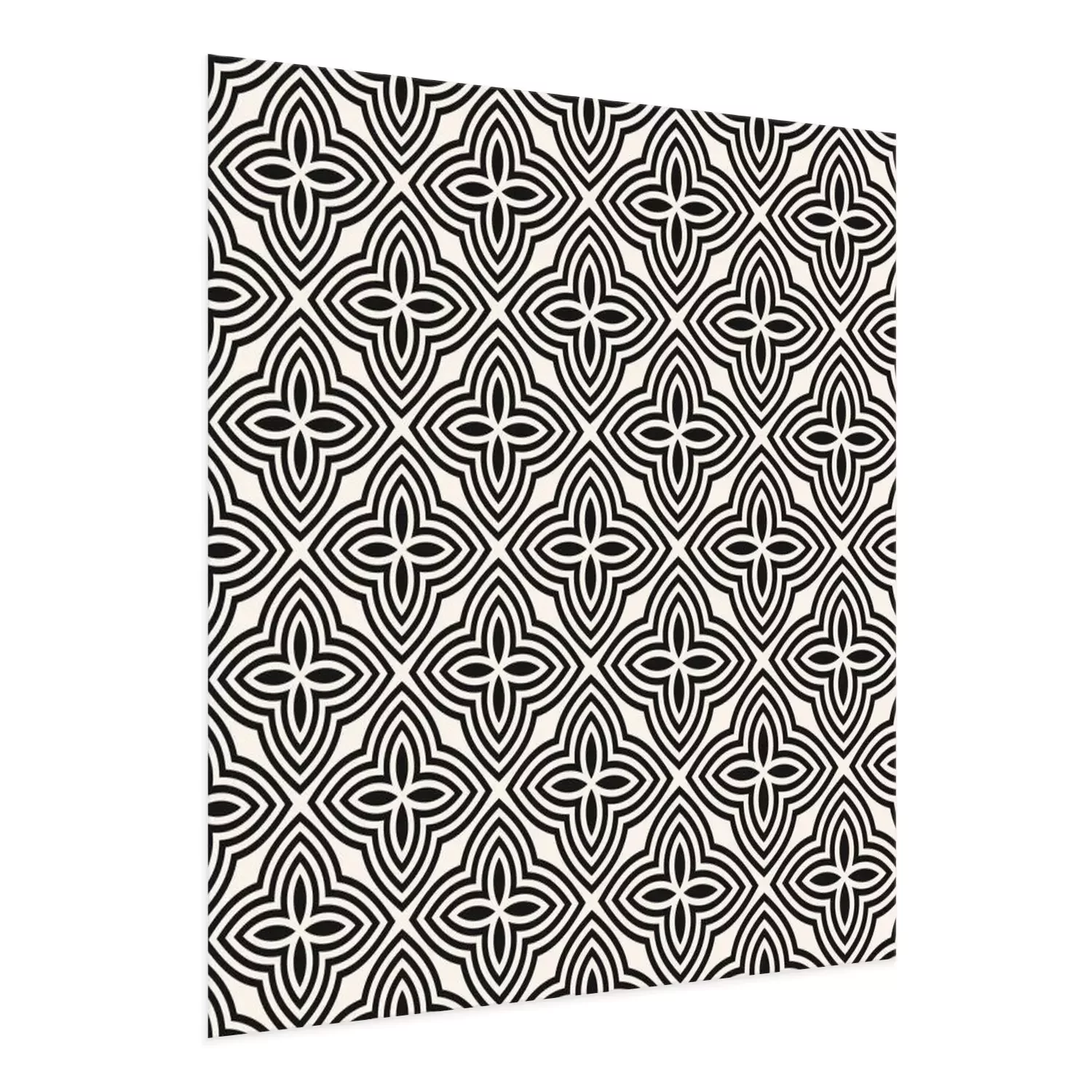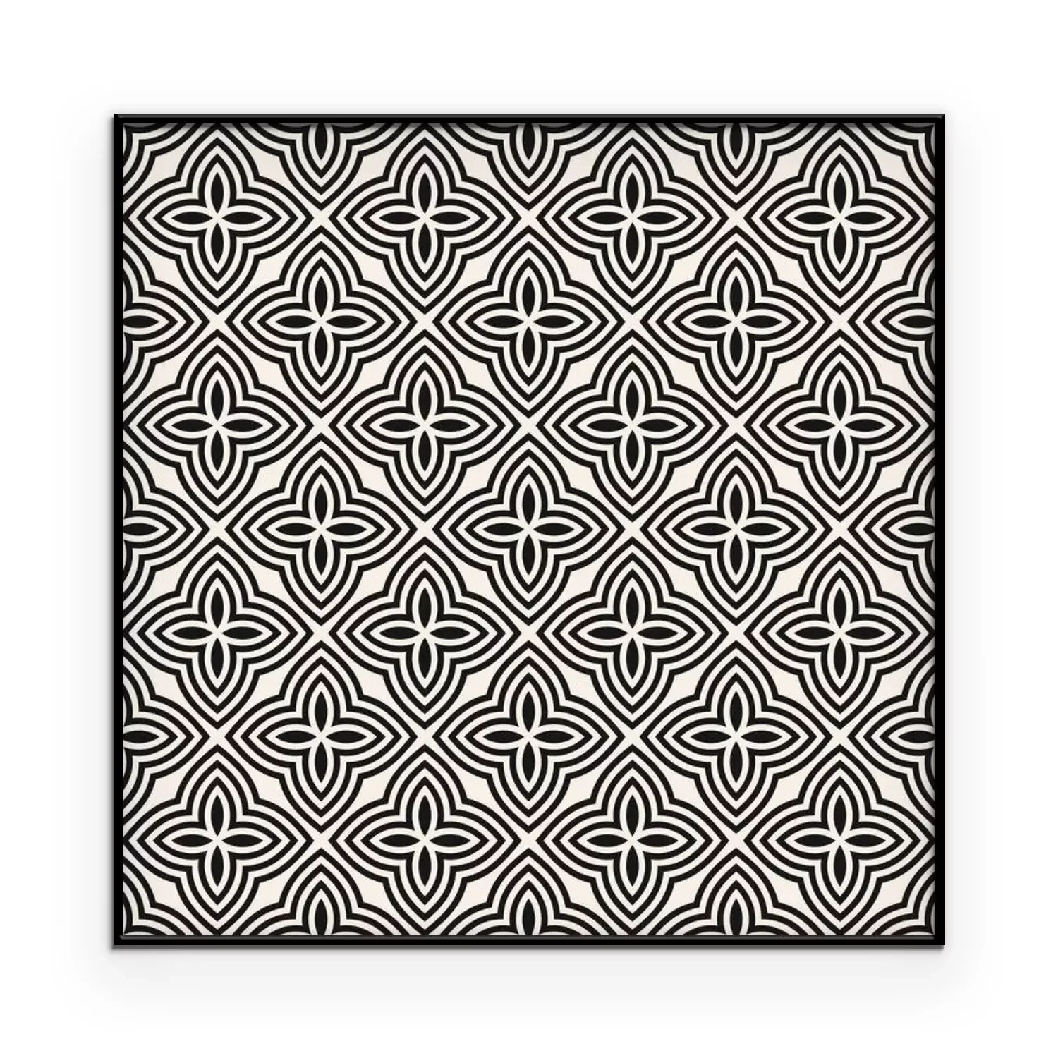 Poster  Vector floral seamless pattern. Abstract black and white geometric ornament with flowers in oriental style. Elegant mosaic background. Simple monochrome ornamental texture. Endless repeatable design