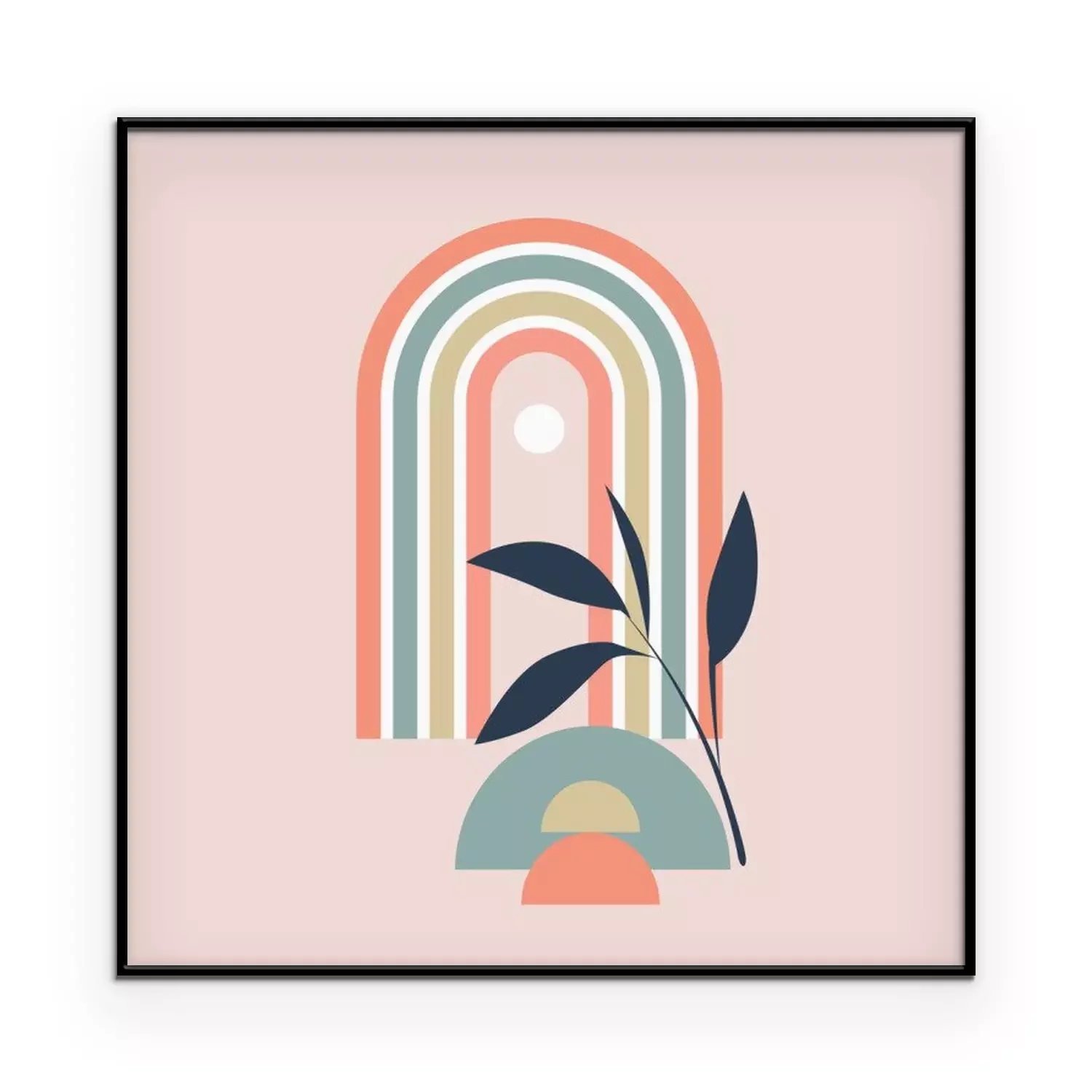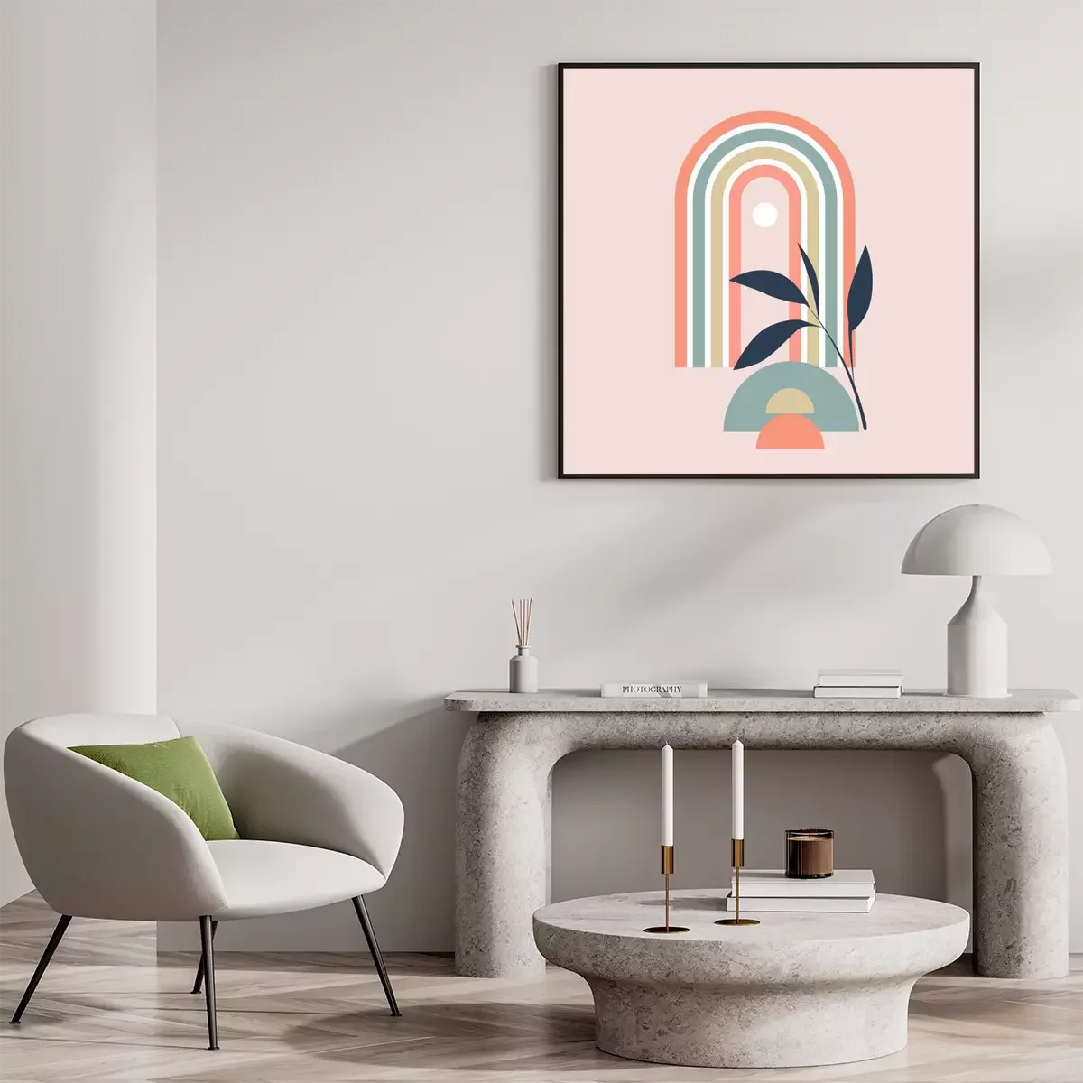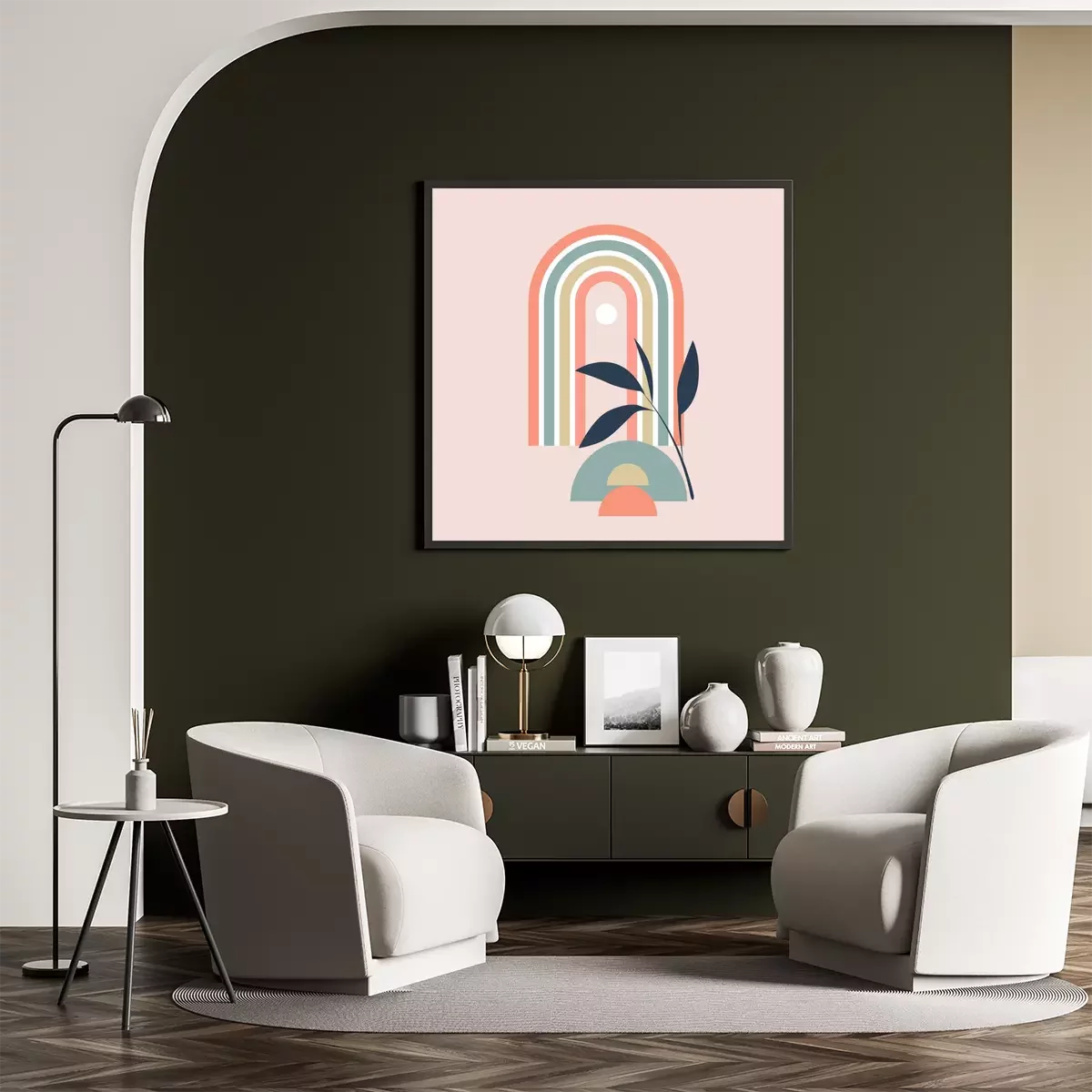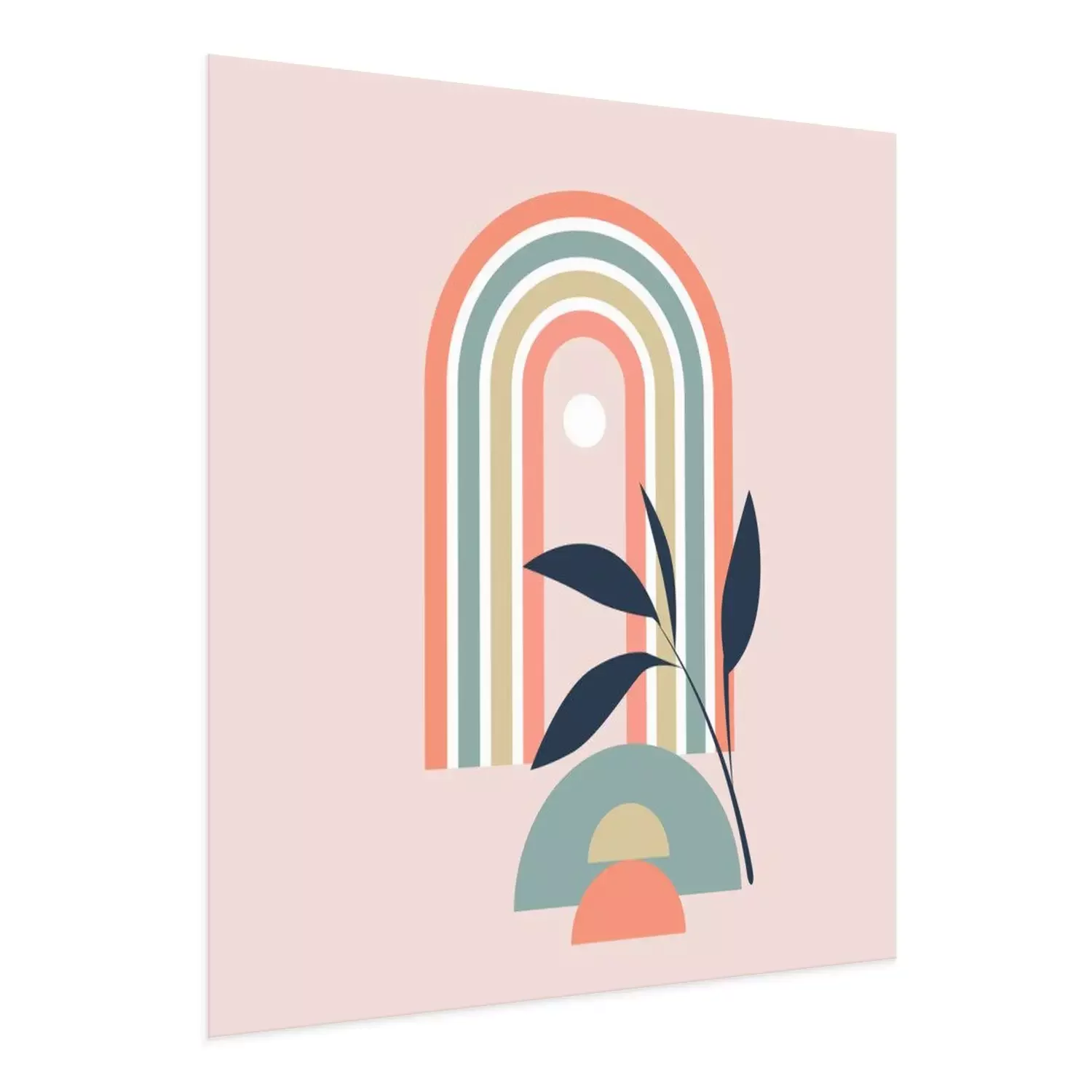 Poster : vector illustration of pastel rainbow with geometric element and plant sprig on pink background, boho style