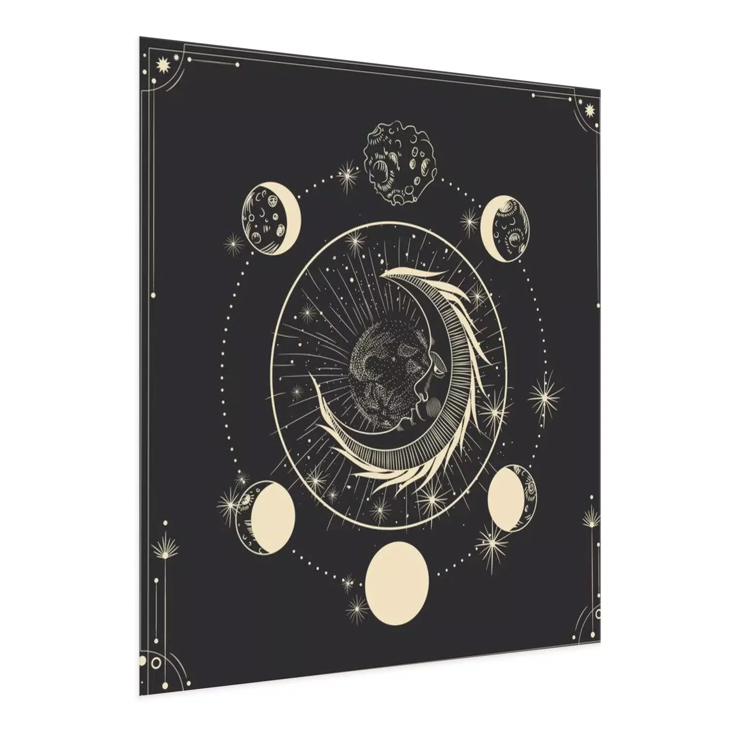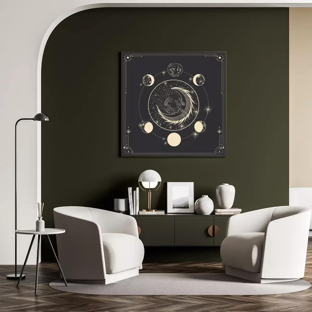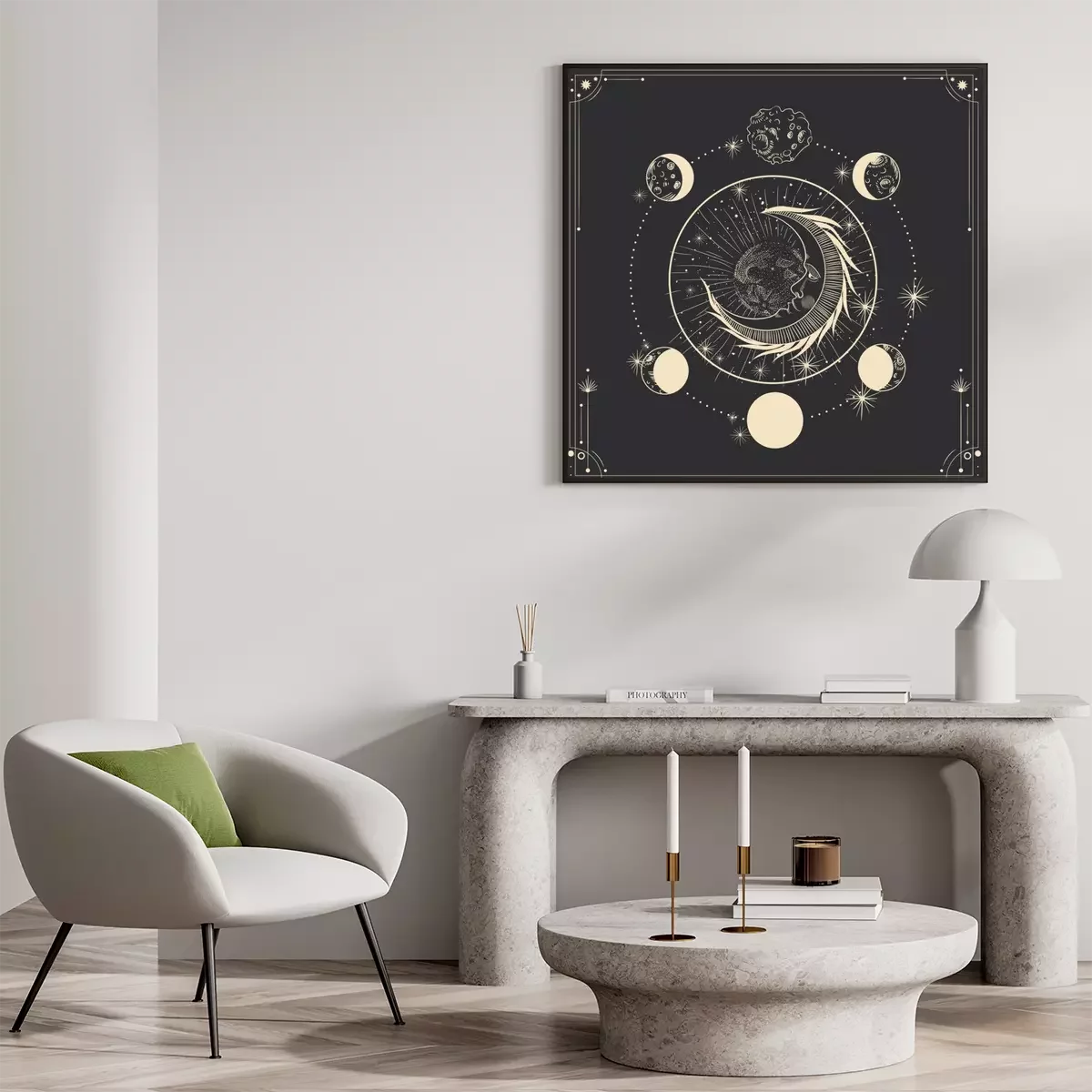 Poster  Vector illustration set of moon phases. Different stages of moonlight activity in vintage engraving style. Zodiac Signs