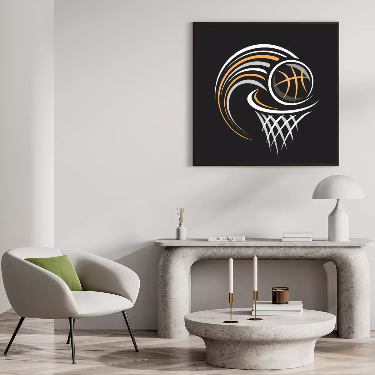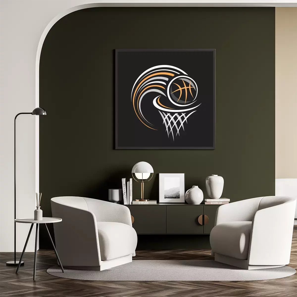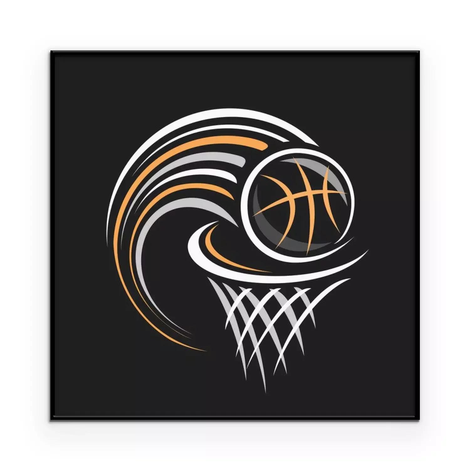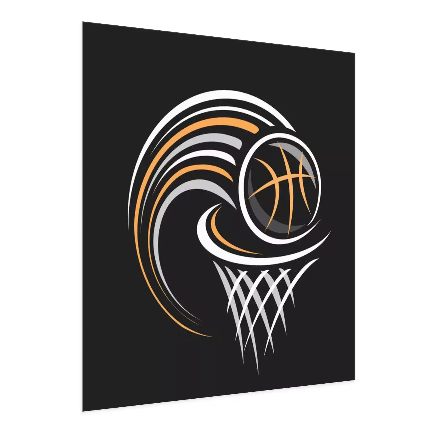 Poster : Vector logo for Basketball, decorative badge with basketball ball flying on trajectory in basket with net on black background, sports chalk sketch on blackboard.