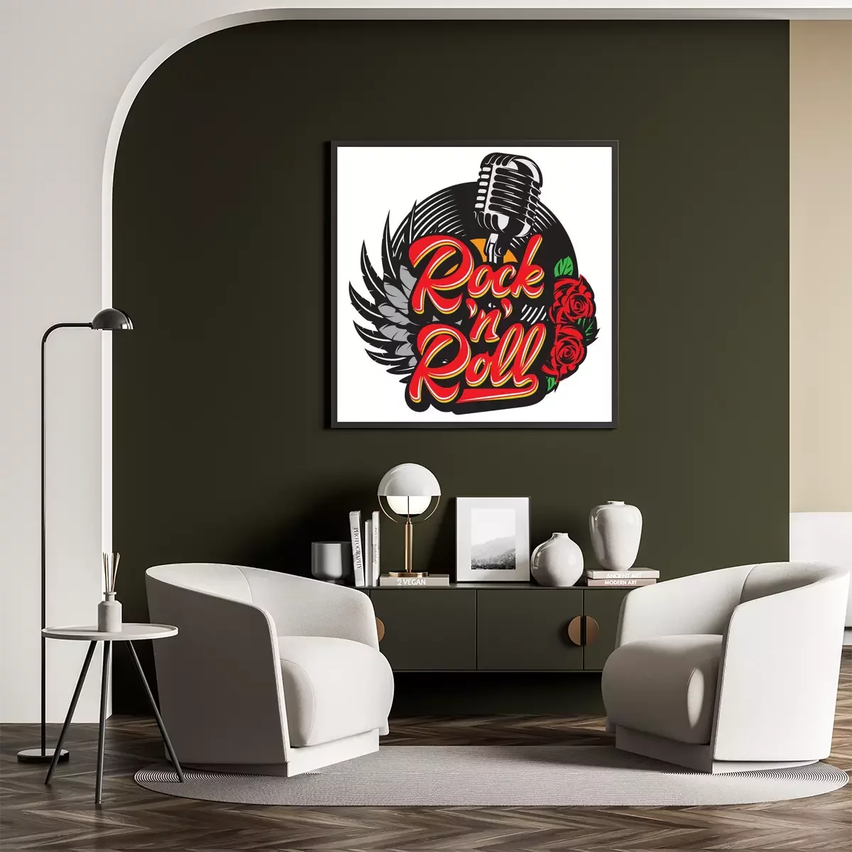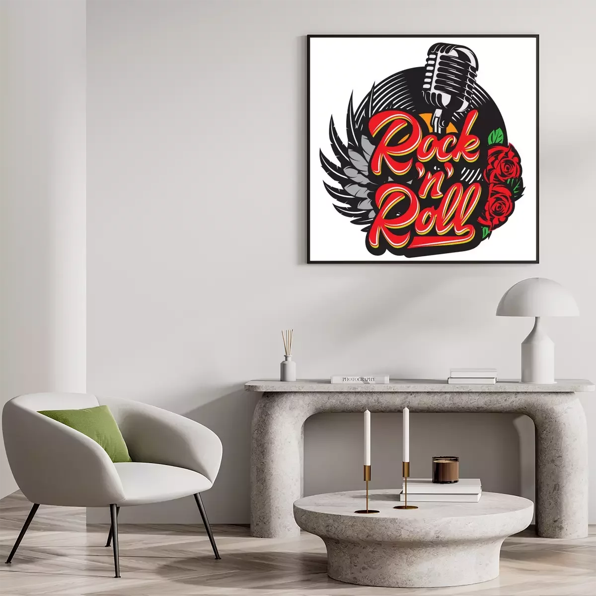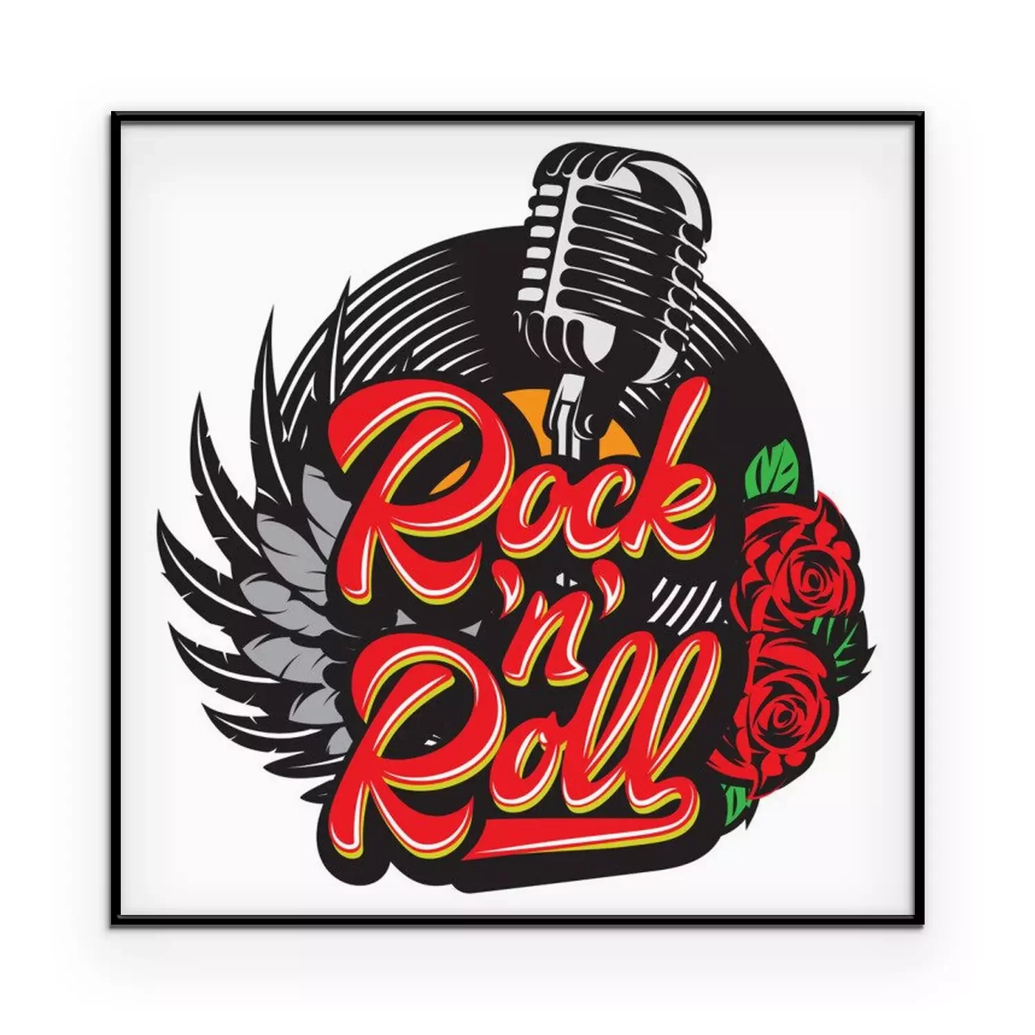 Poster  Vector stylish print template on the theme of rock with microphone, wing, vinyl, rose