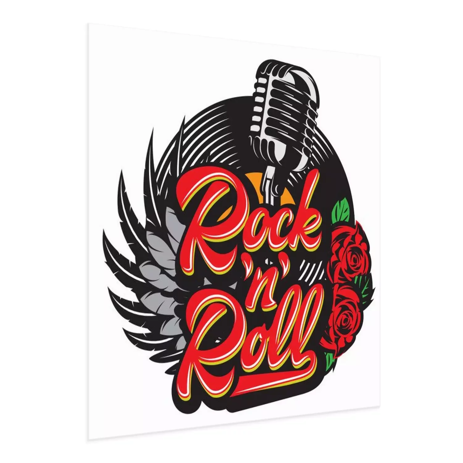 Poster : Vector stylish print template on the theme of rock with microphone, wing, vinyl, rose