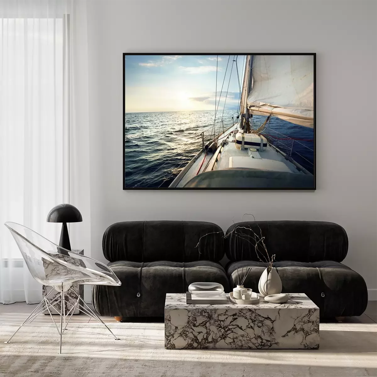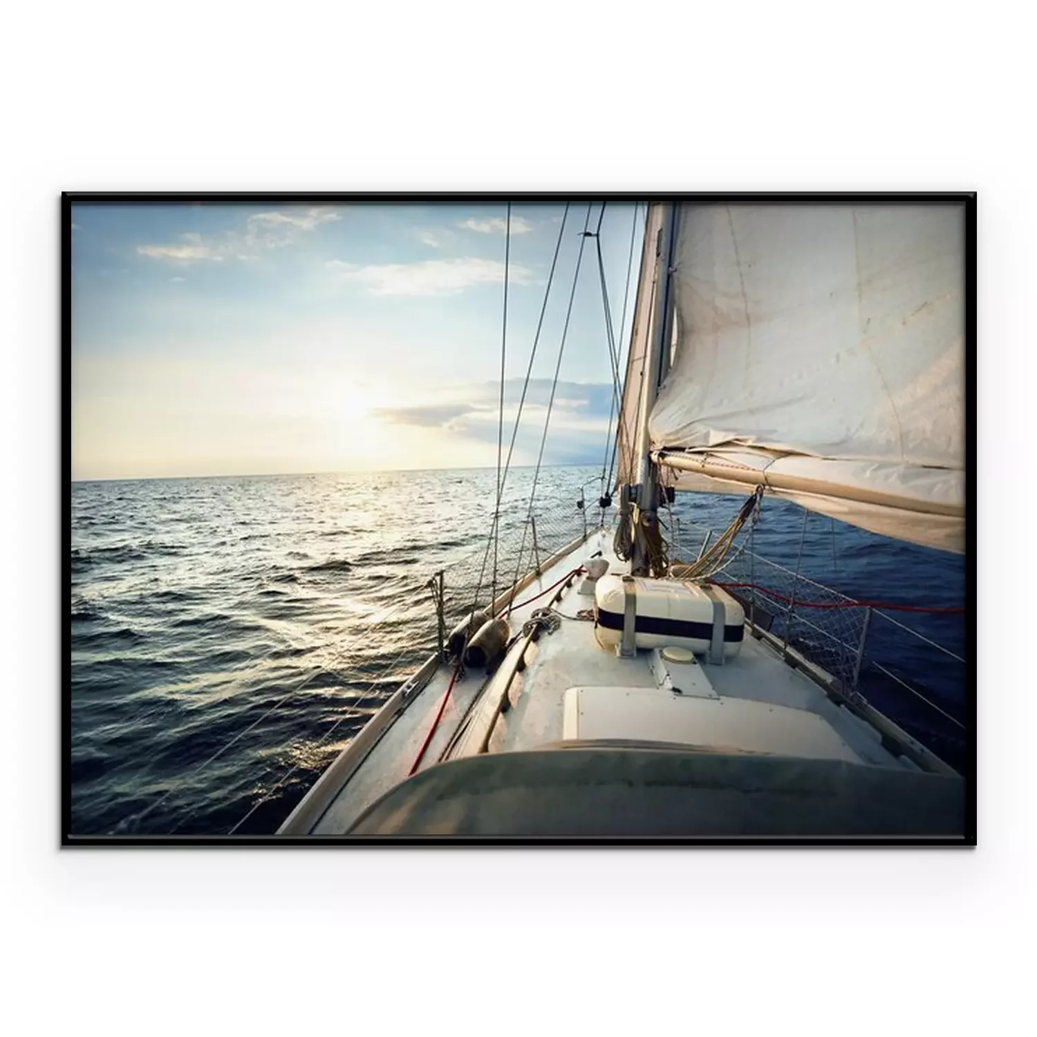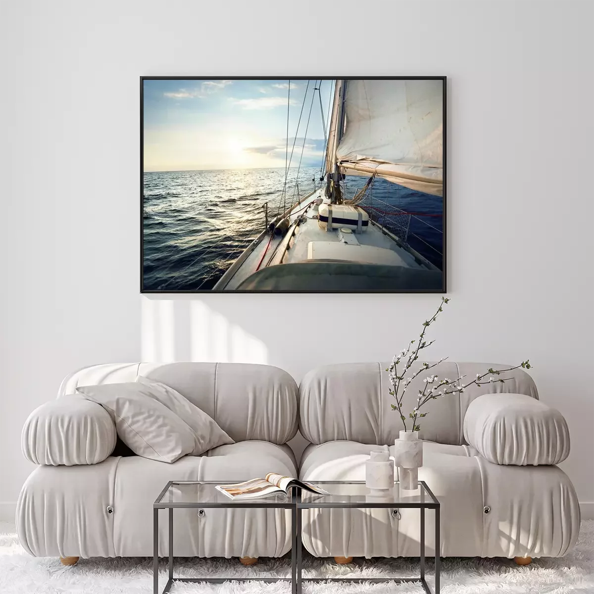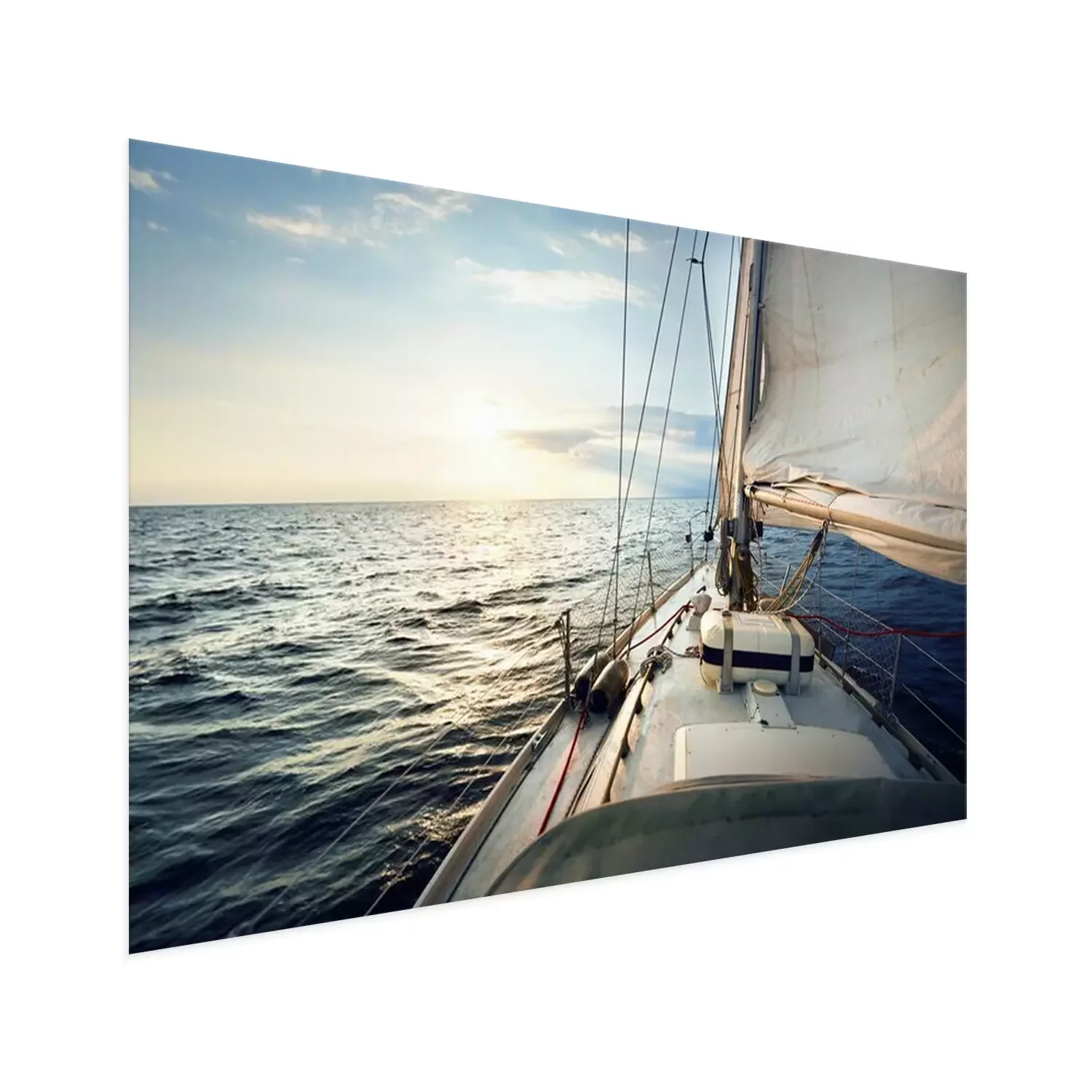 Poster  View from the deck to the bow of a sail yacht tilted in a wind on a sunset