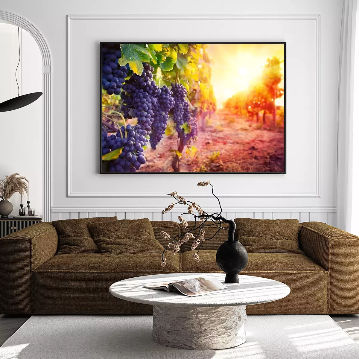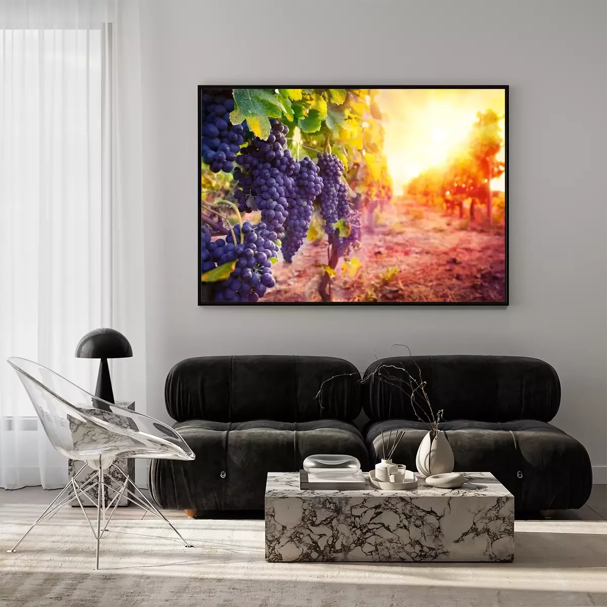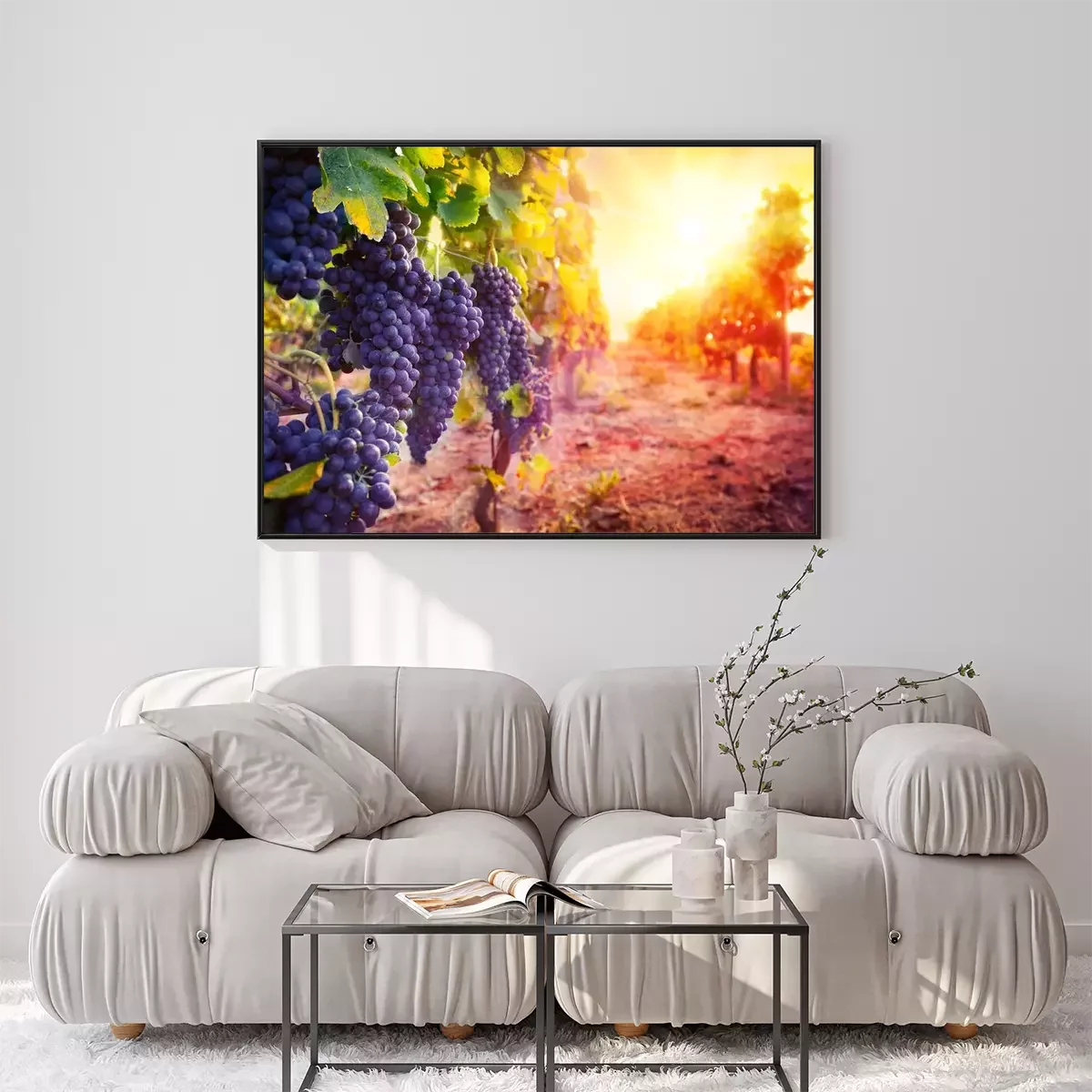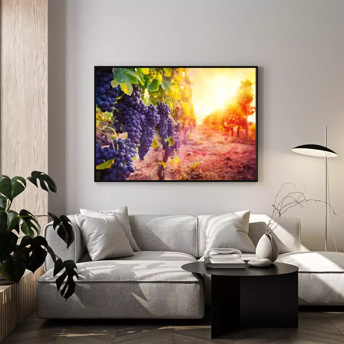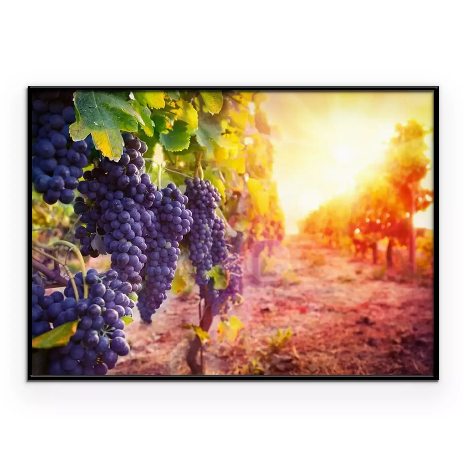 Poster  vigne avec des raisins mûrs dans la campagne au coucher du soleil