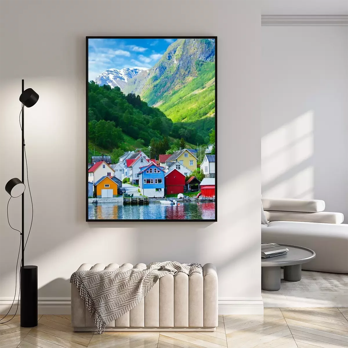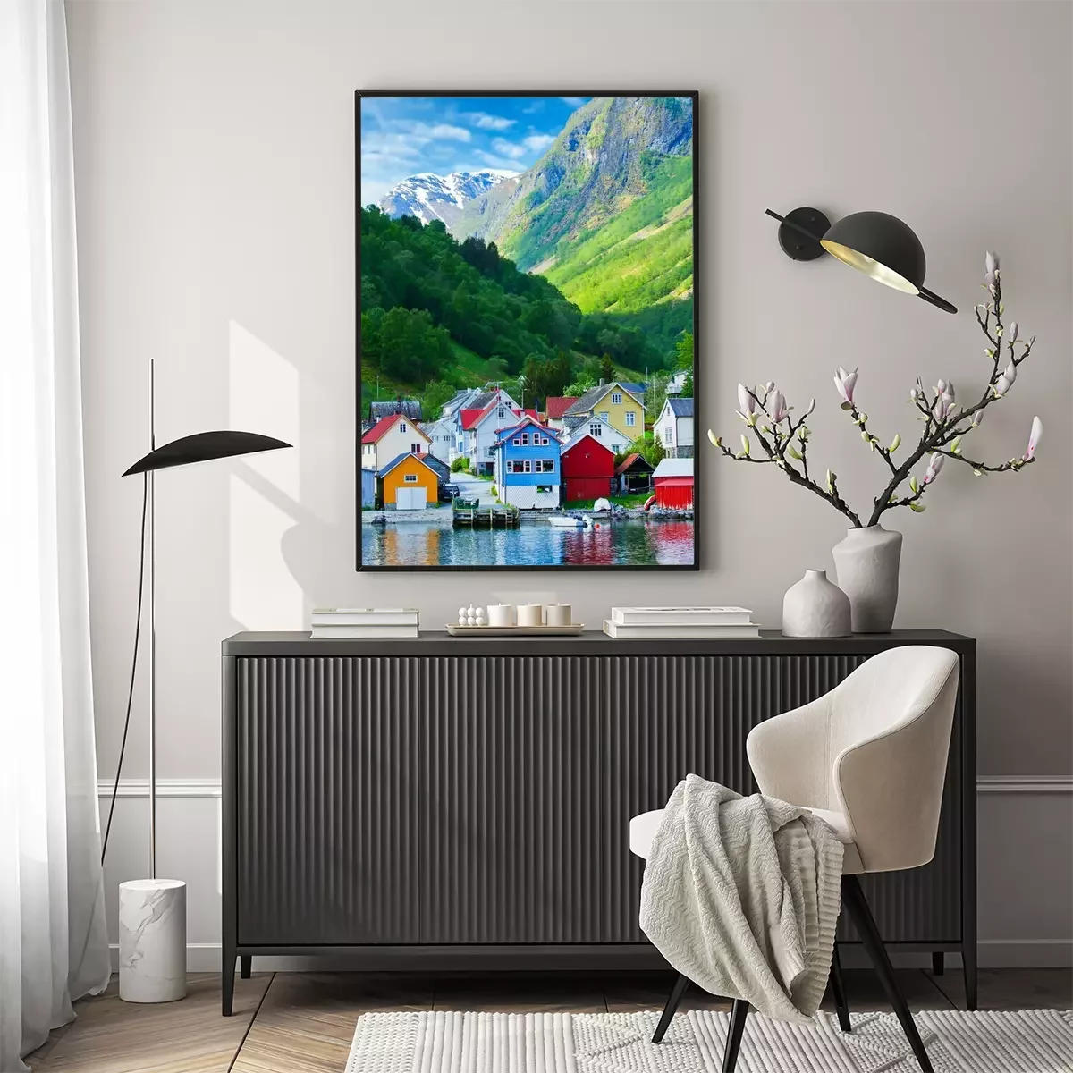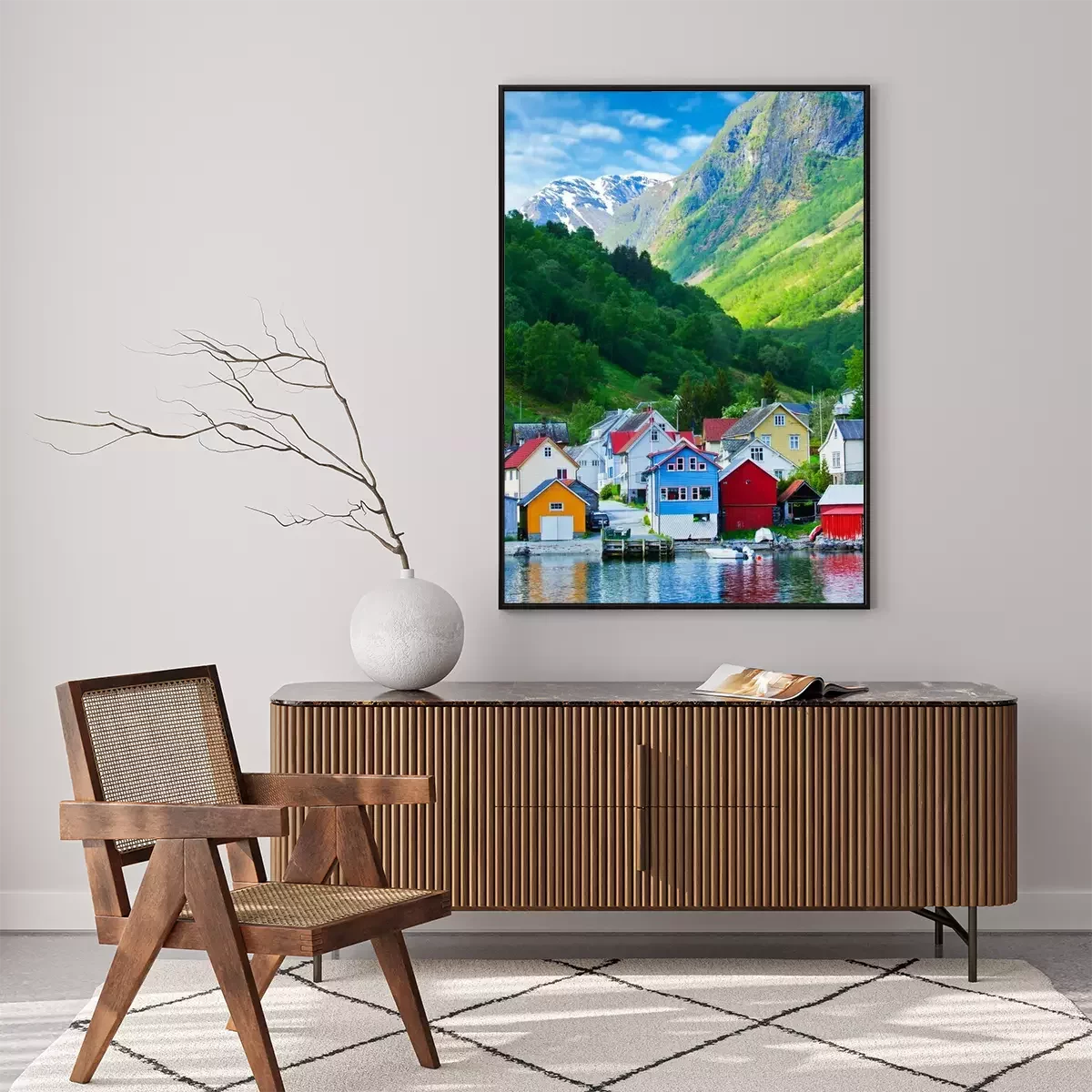 Poster  Village et vue mer sur les montagnes dans le fjord de Geiranger, Norvège