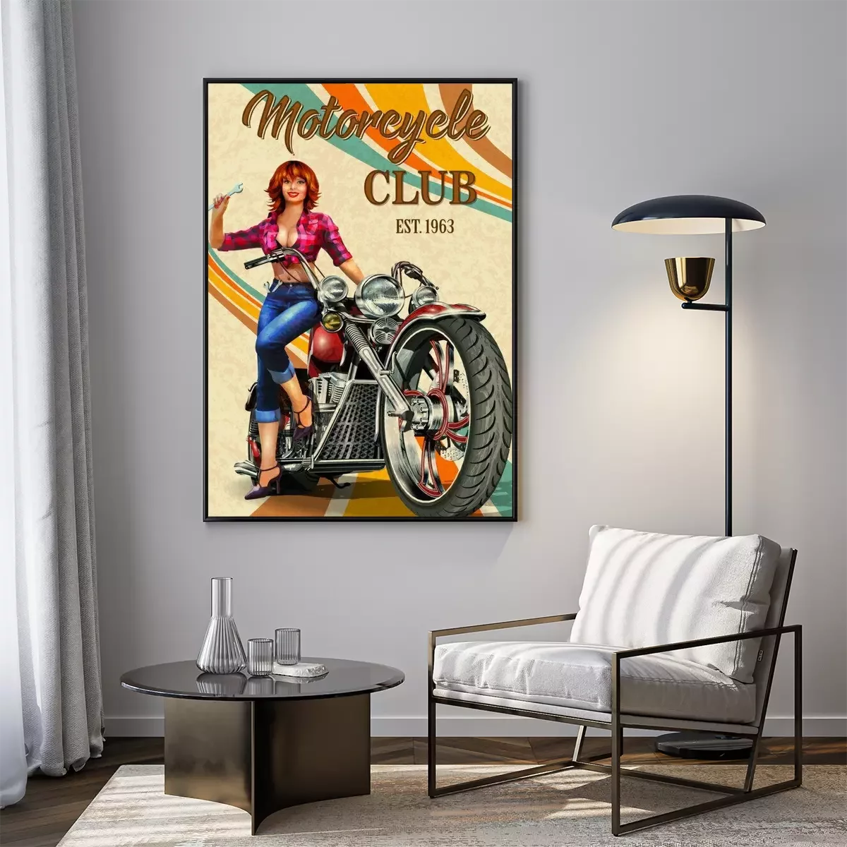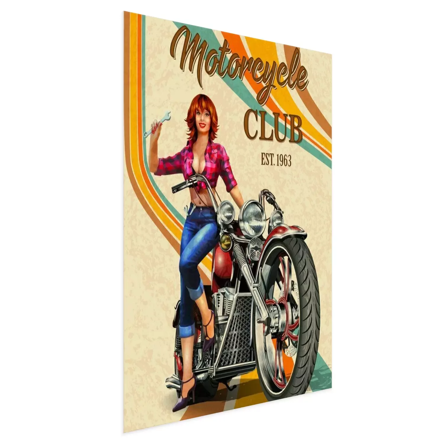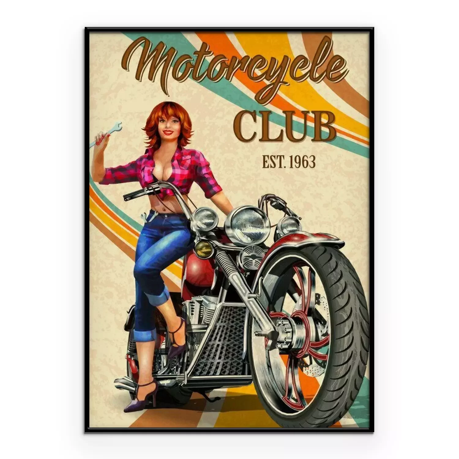 Poster  Vintage Motorcycles poster with sexy girl  sitting on retro motorcycle.