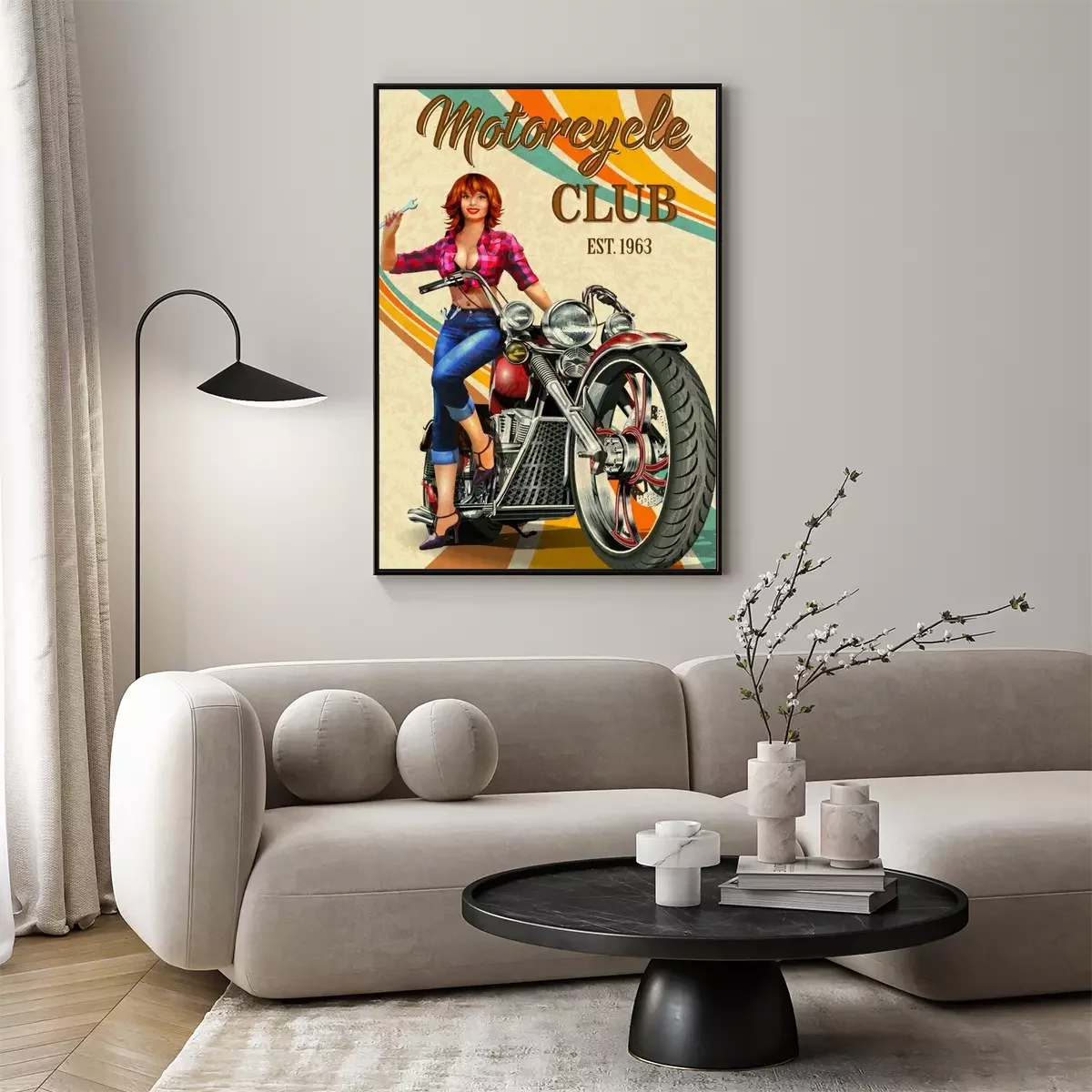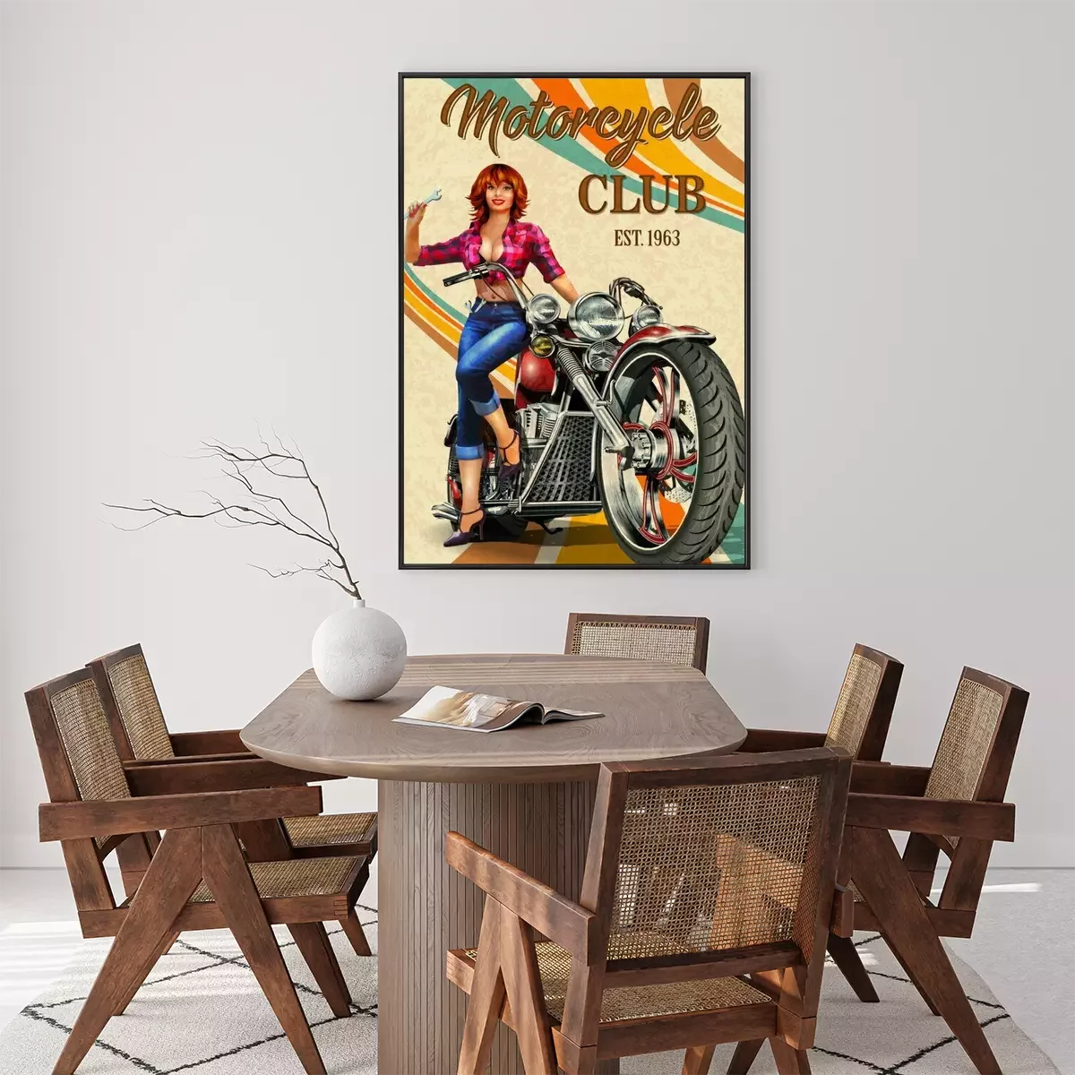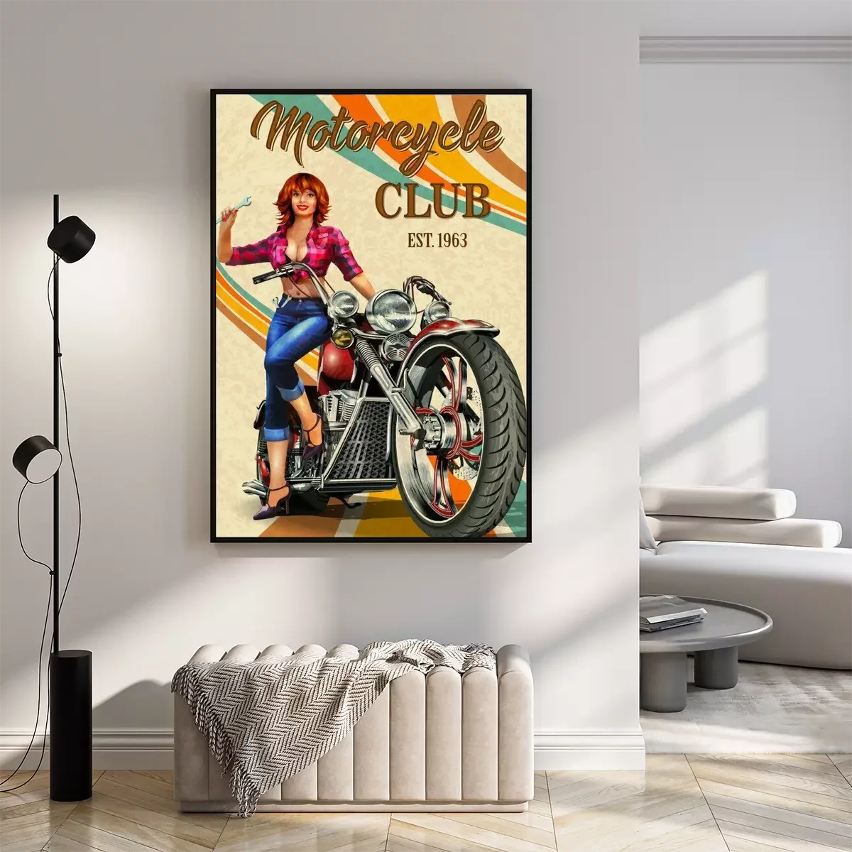 Poster  Vintage Motorcycles poster with sexy girl  sitting on retro motorcycle.