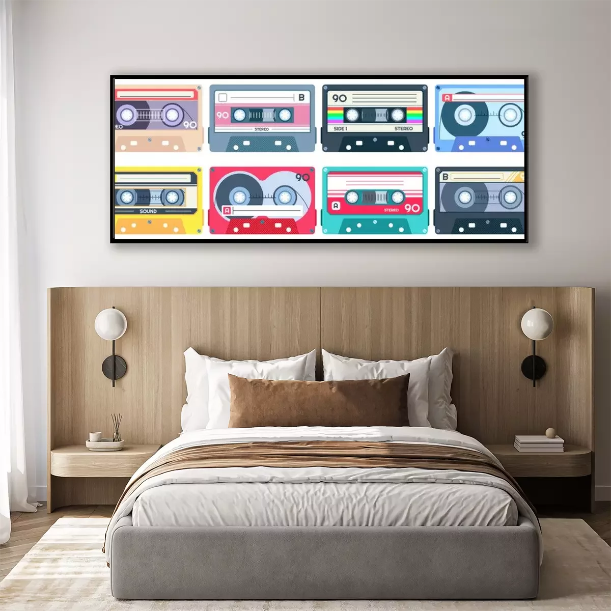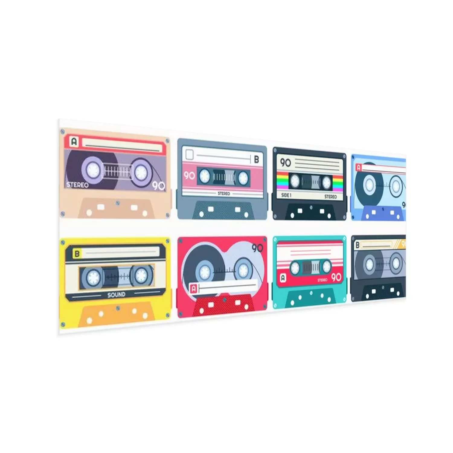Poster  Vintage tape cassette. Retro mixtape, 1980s pop songs tapes and stereo music cassettes. 90s hifi disco dance audiocassette, analogue player record cassette. Isolated symbols vector set