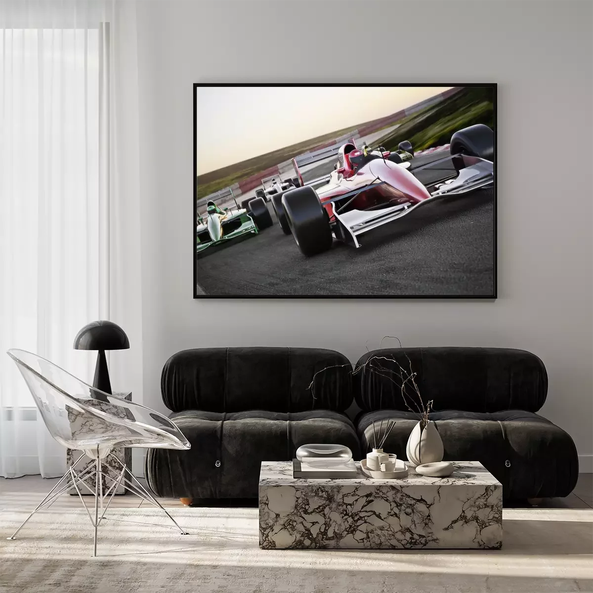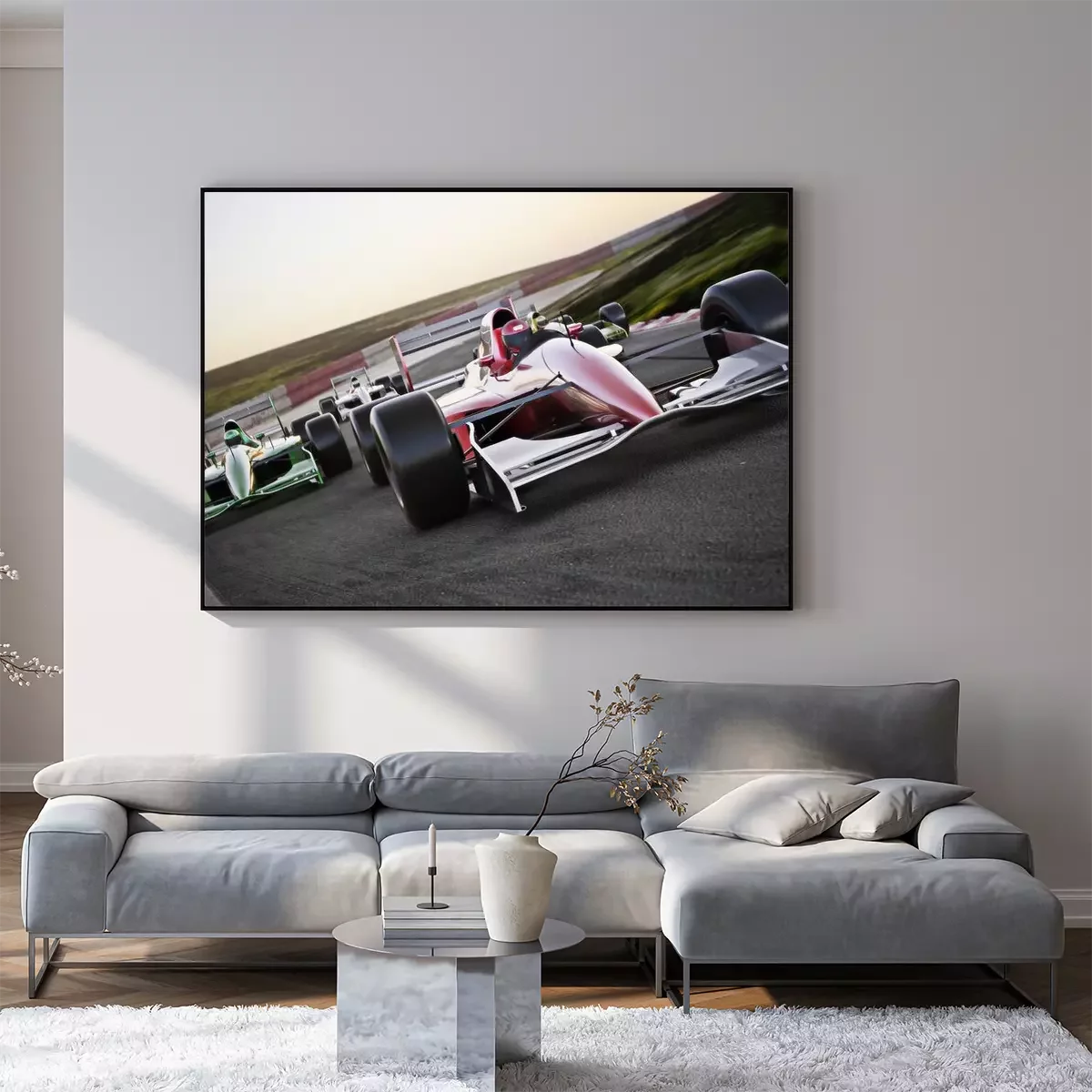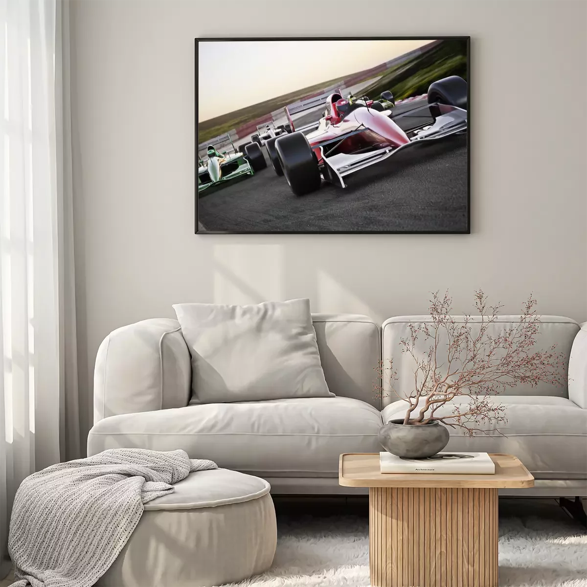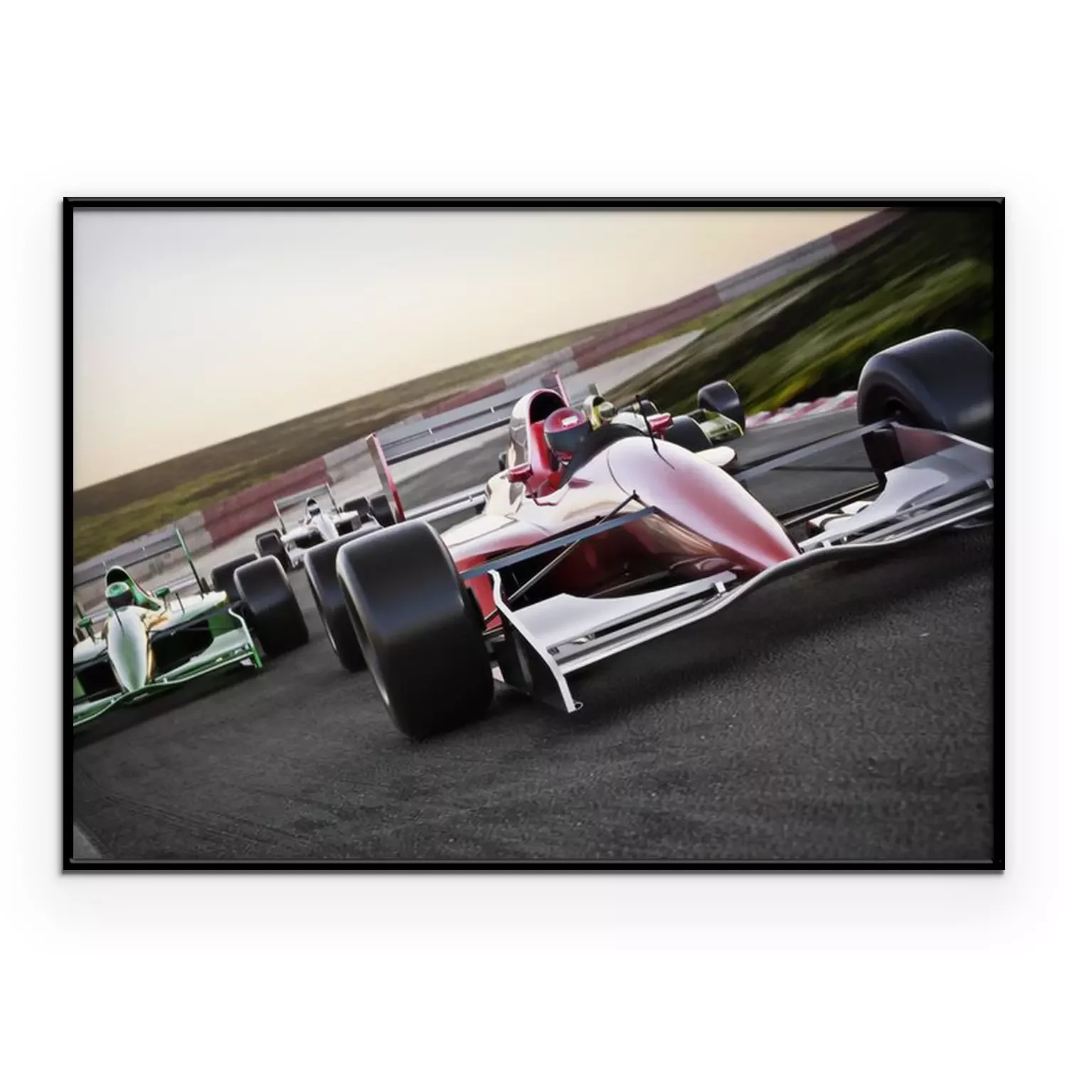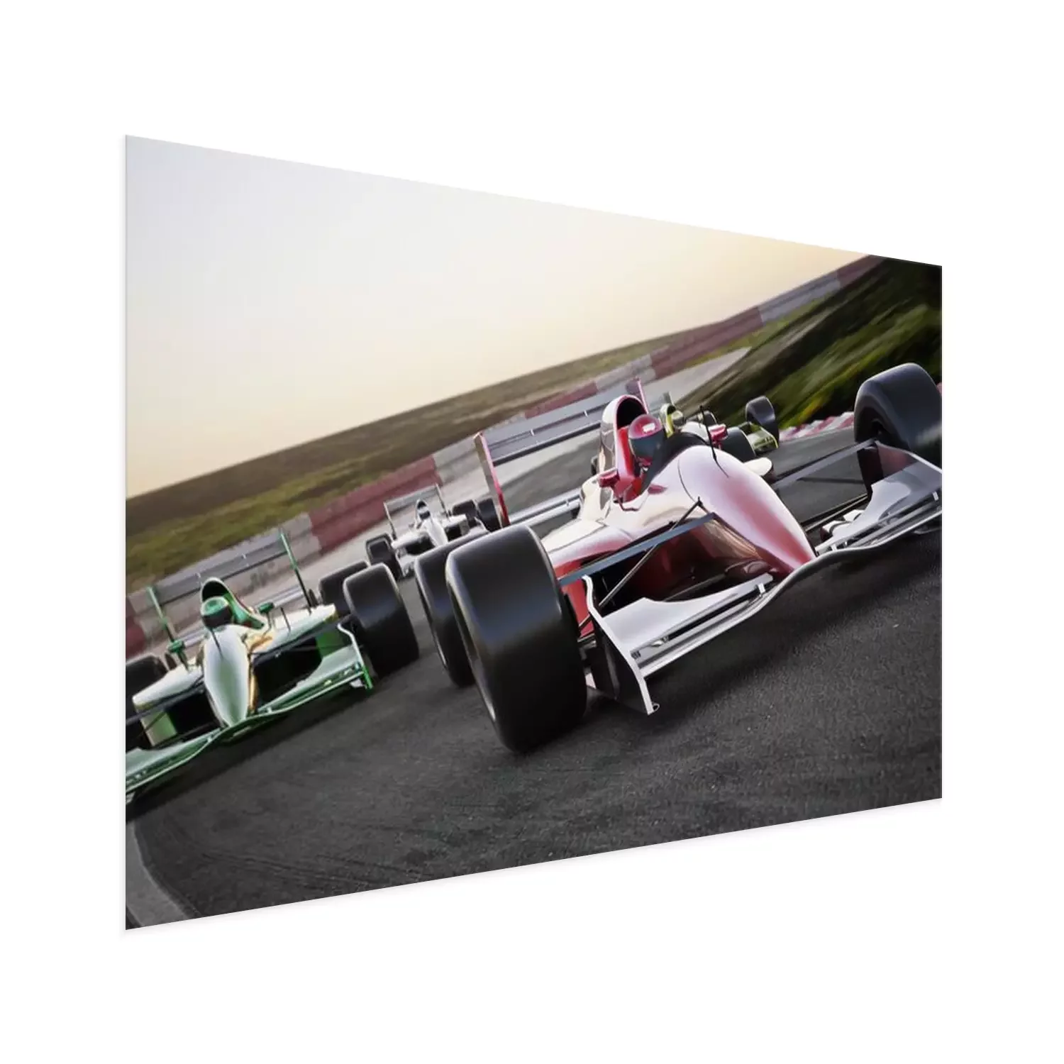 Poster  Voiture de course rouge close up vue de face sur une piste en tête du peloton