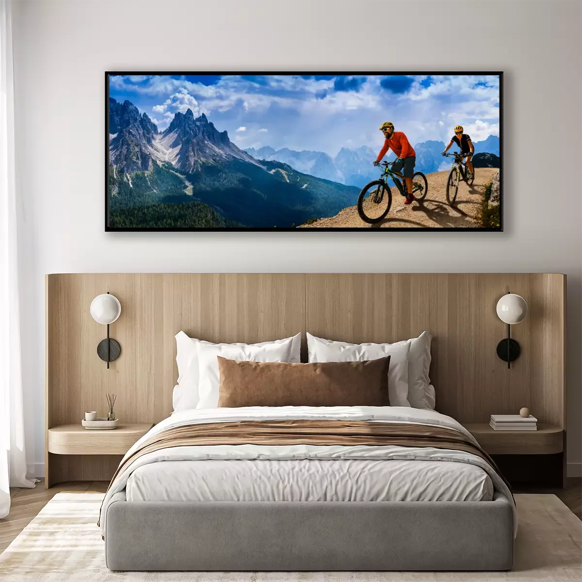 Cycling woman and man riding on bikes in Dolomites mountains landscape. Couple cycling MTB enduro trail track. Outdoor sport activity.