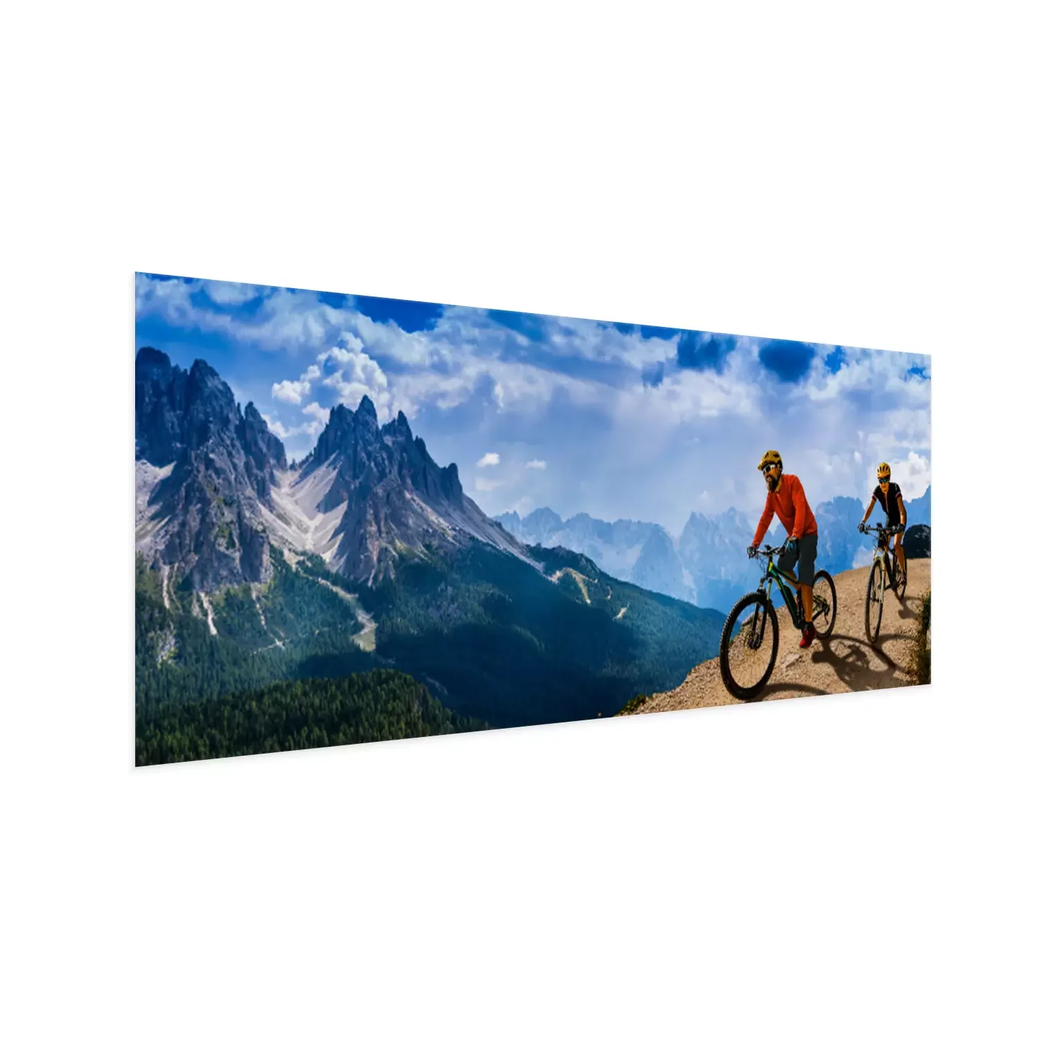 Cycling woman and man riding on bikes in Dolomites mountains andscape. Couple cycling MTB enduro trail track. Outdoor sport activity.