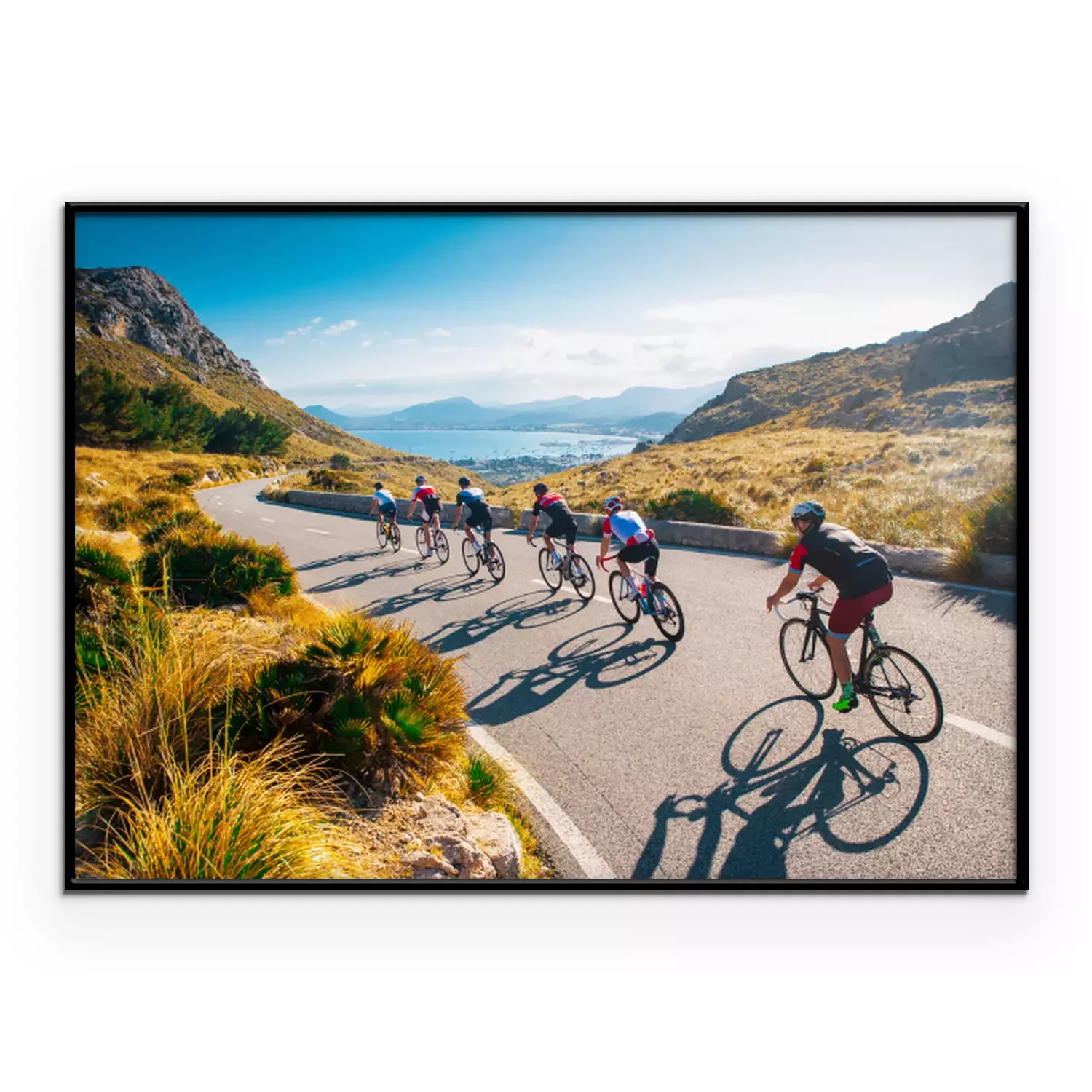 Group of cyclist ride together on road bicycles in beautiful nature. Sunset light, sea in background.