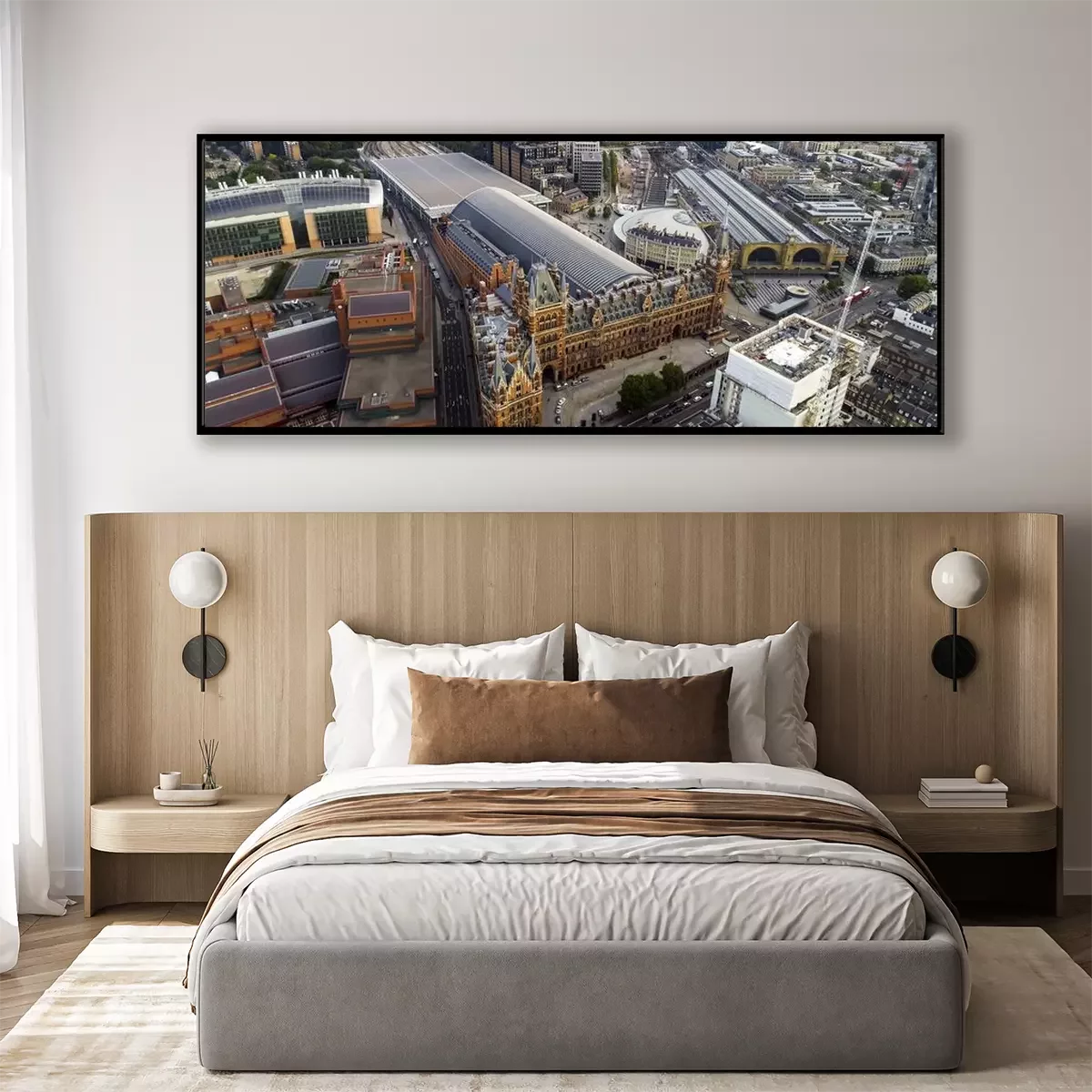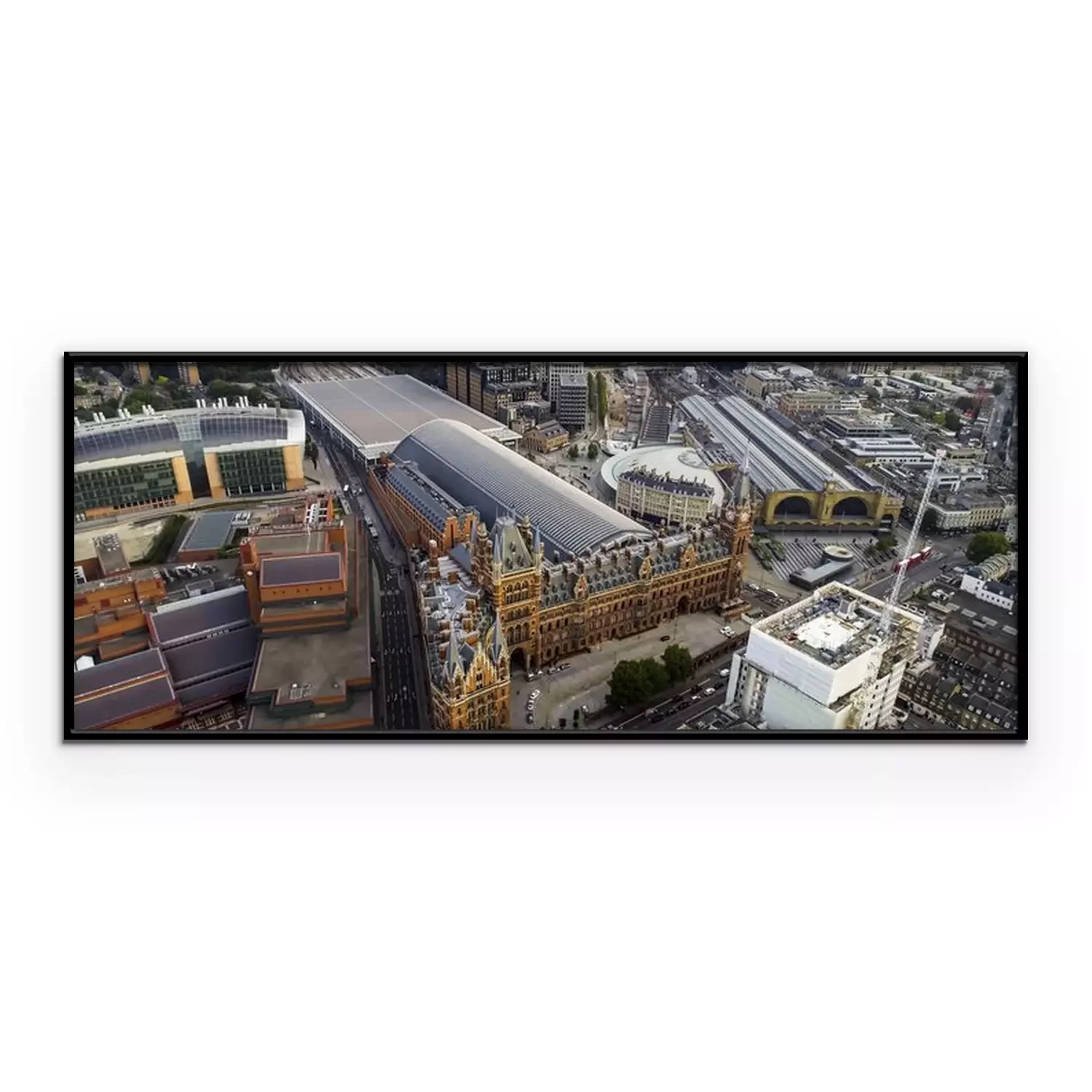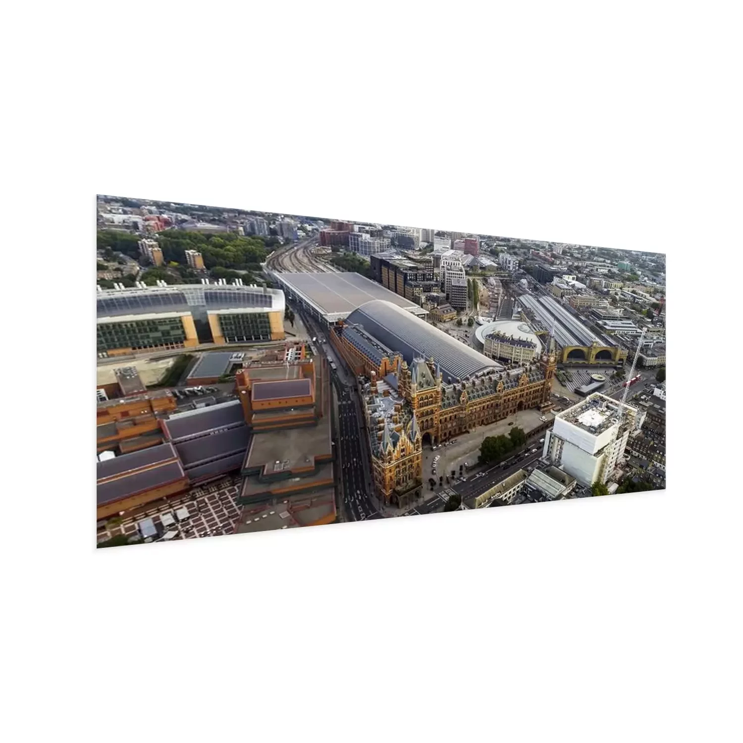 Poster  Vue aérienne de l'architecture iconique et des stations de chemin de fer Kings Cross et St Pancras à Londres, Royaume-Uni