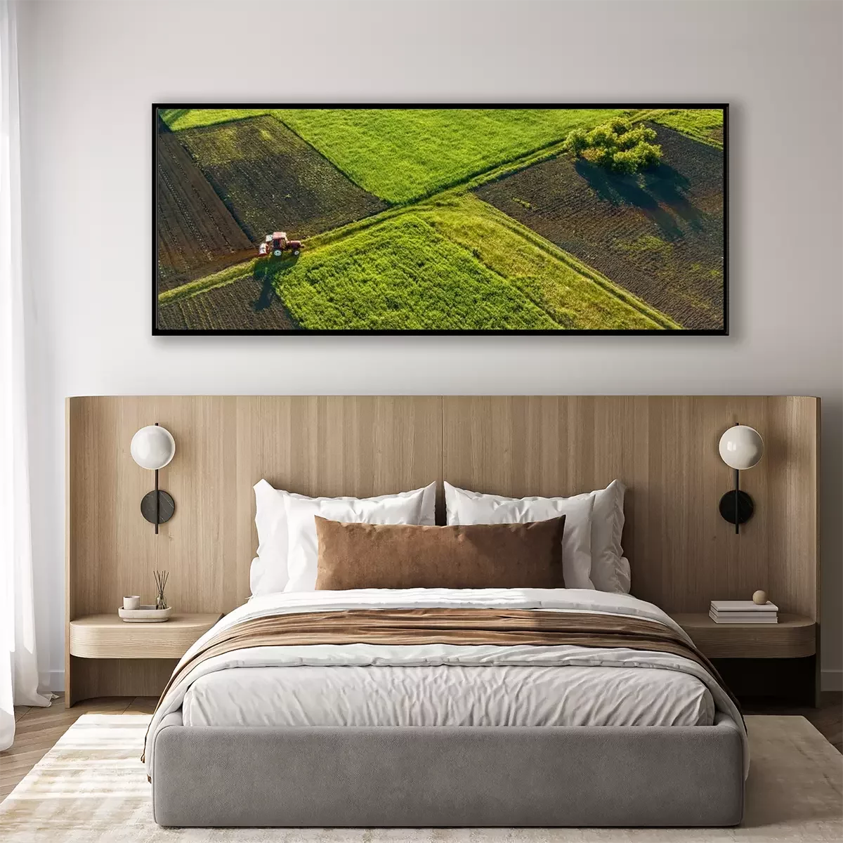 Poster : Vue aérienne du drone, vue aérienne des champs agricoles avec une route et un tracteur le soir du printemps au coucher du soleil