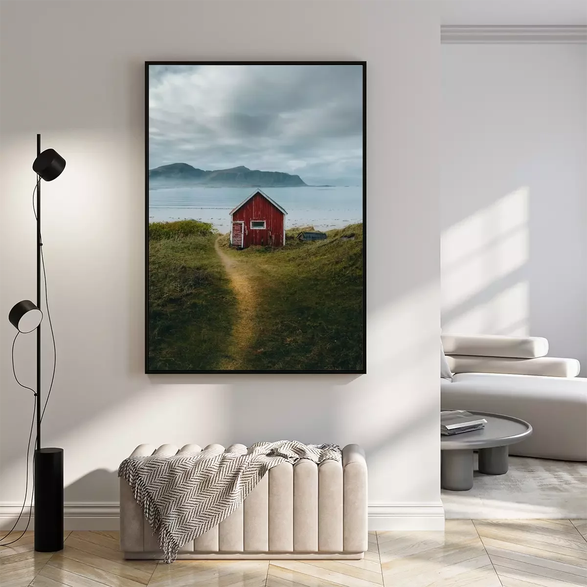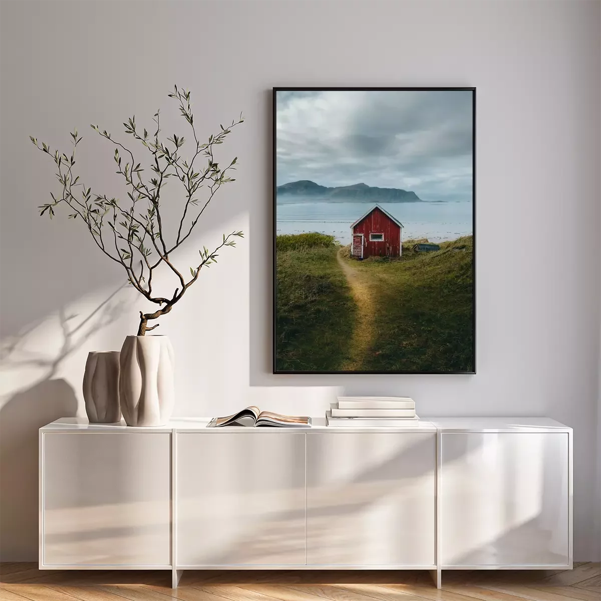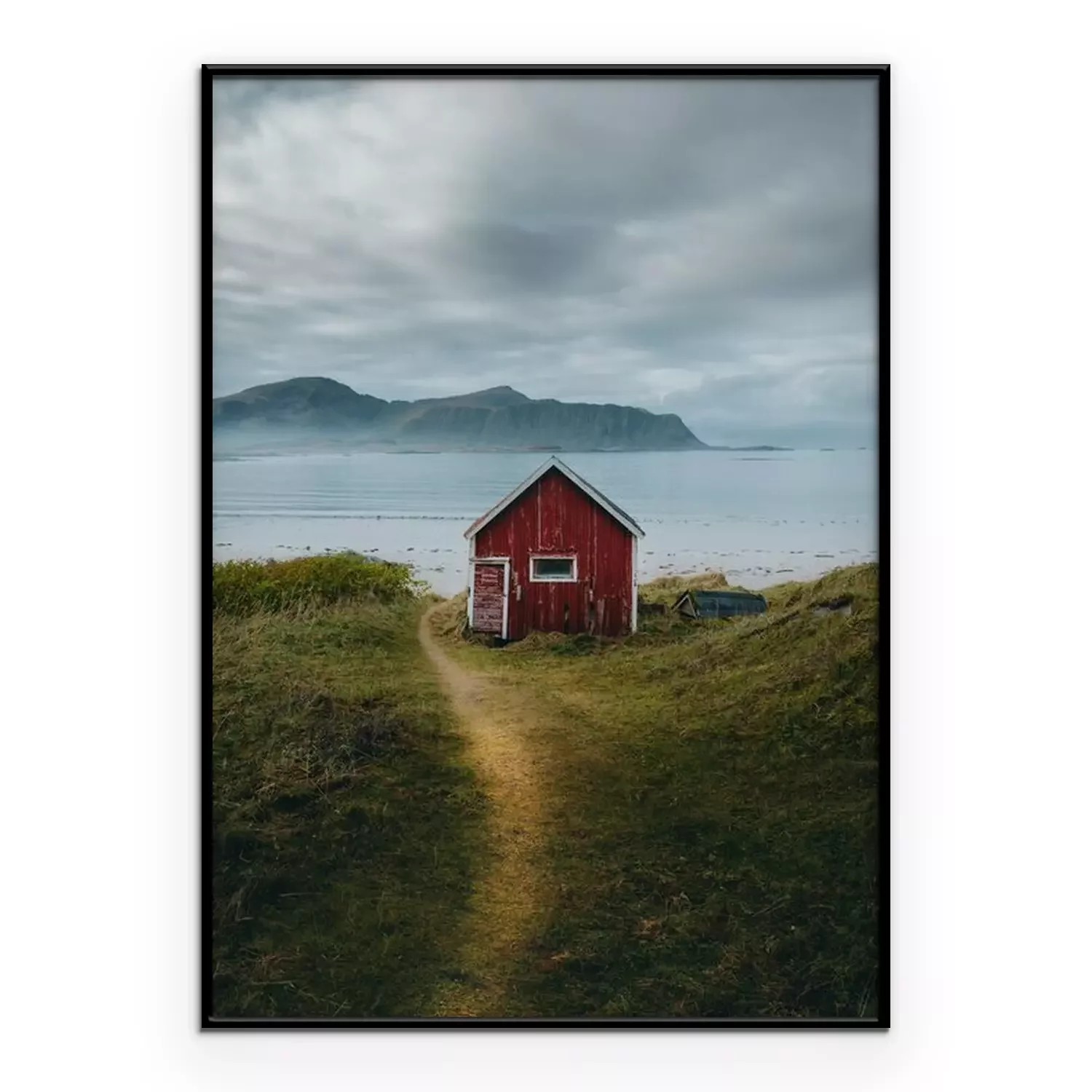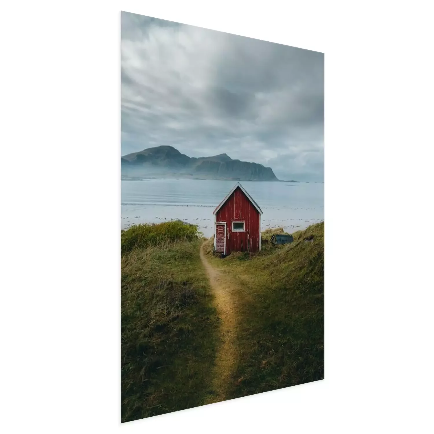 Poster  Vue d'une maison en bois rouge au bord de l'eau