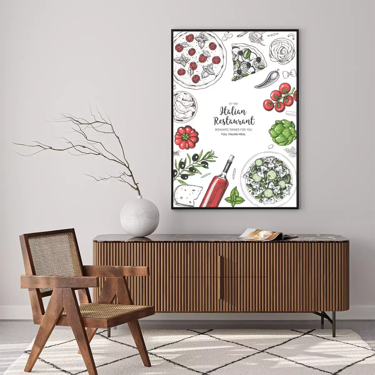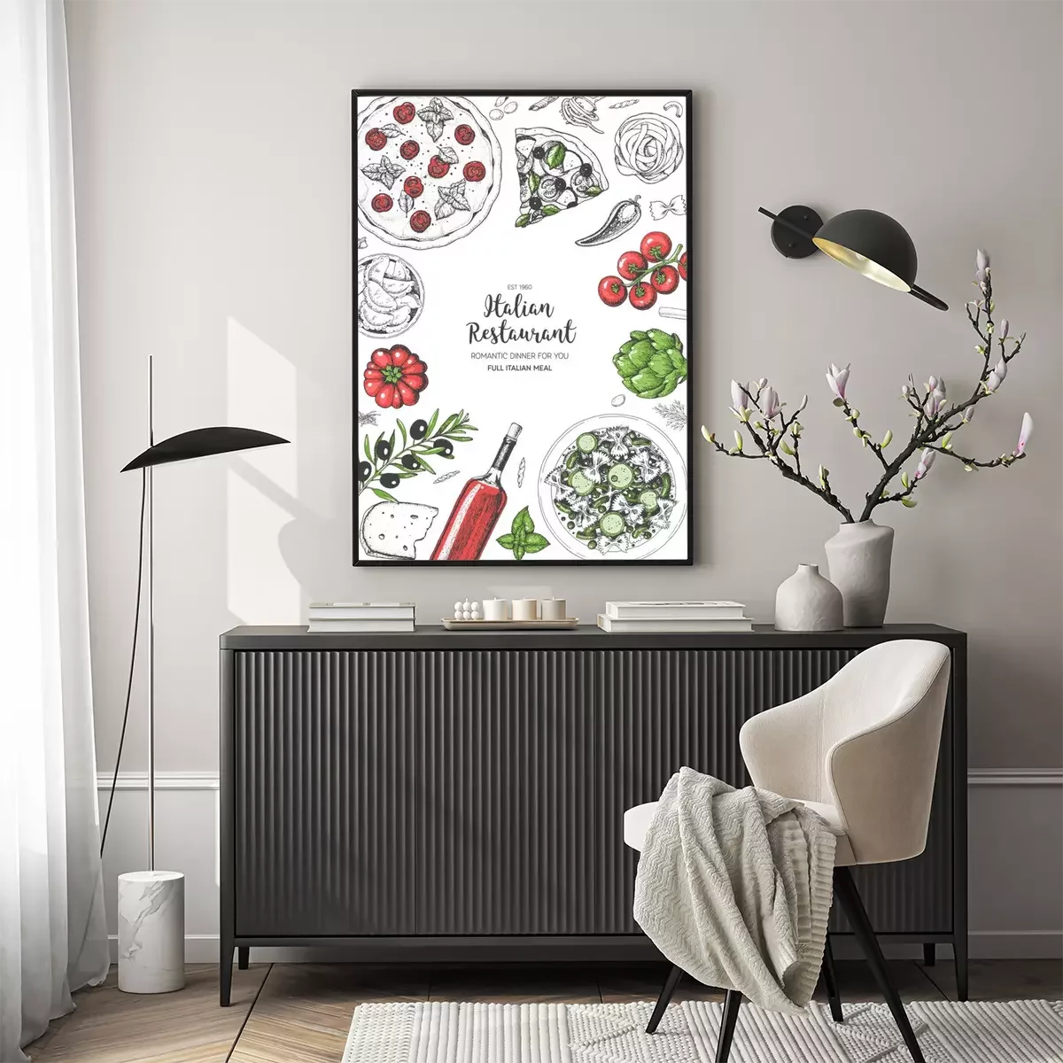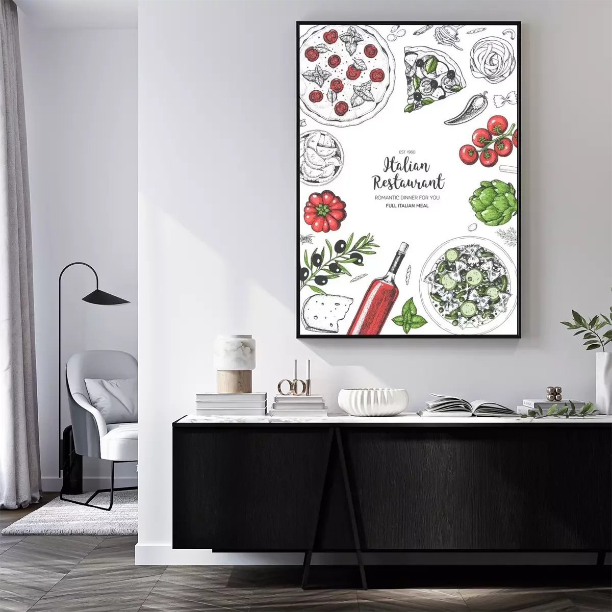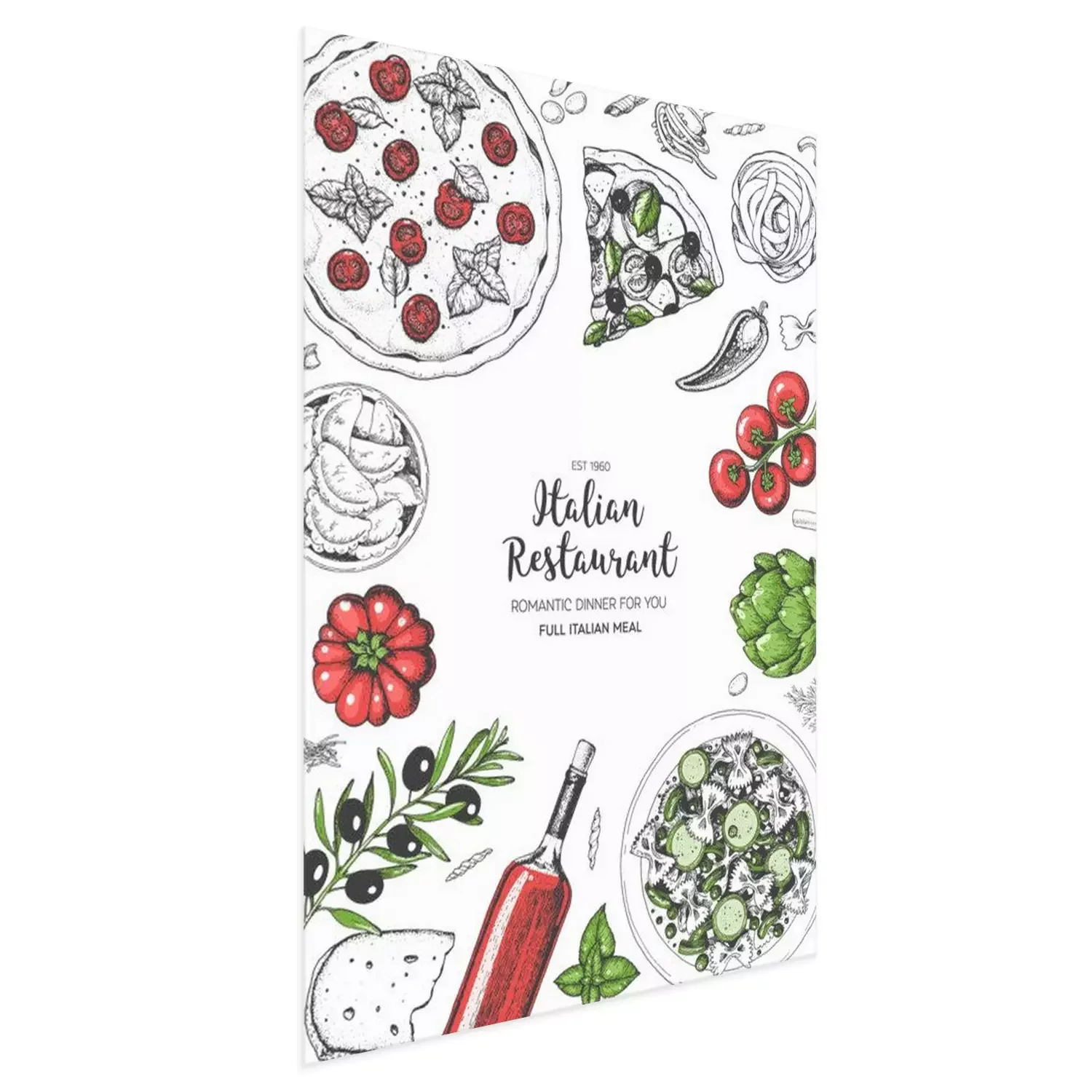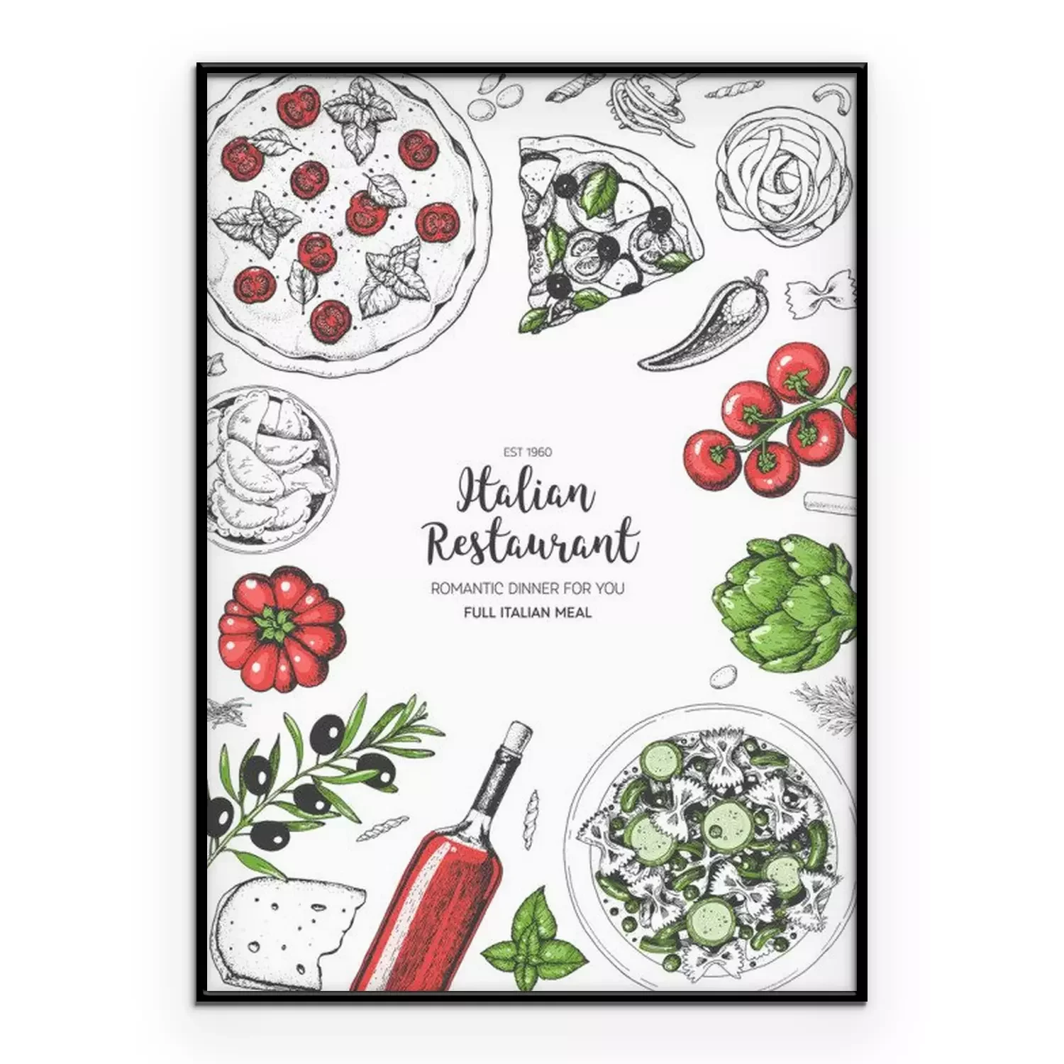Poster  Vue de dessus de cuisine italienne. Un ensemble de plats italiens avec des pâtes et des pizzas. Modèle de conception de menu alimentaire. Illustration vectorielle de croquis dessinés à la main vintage