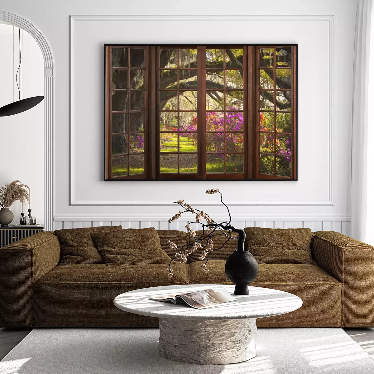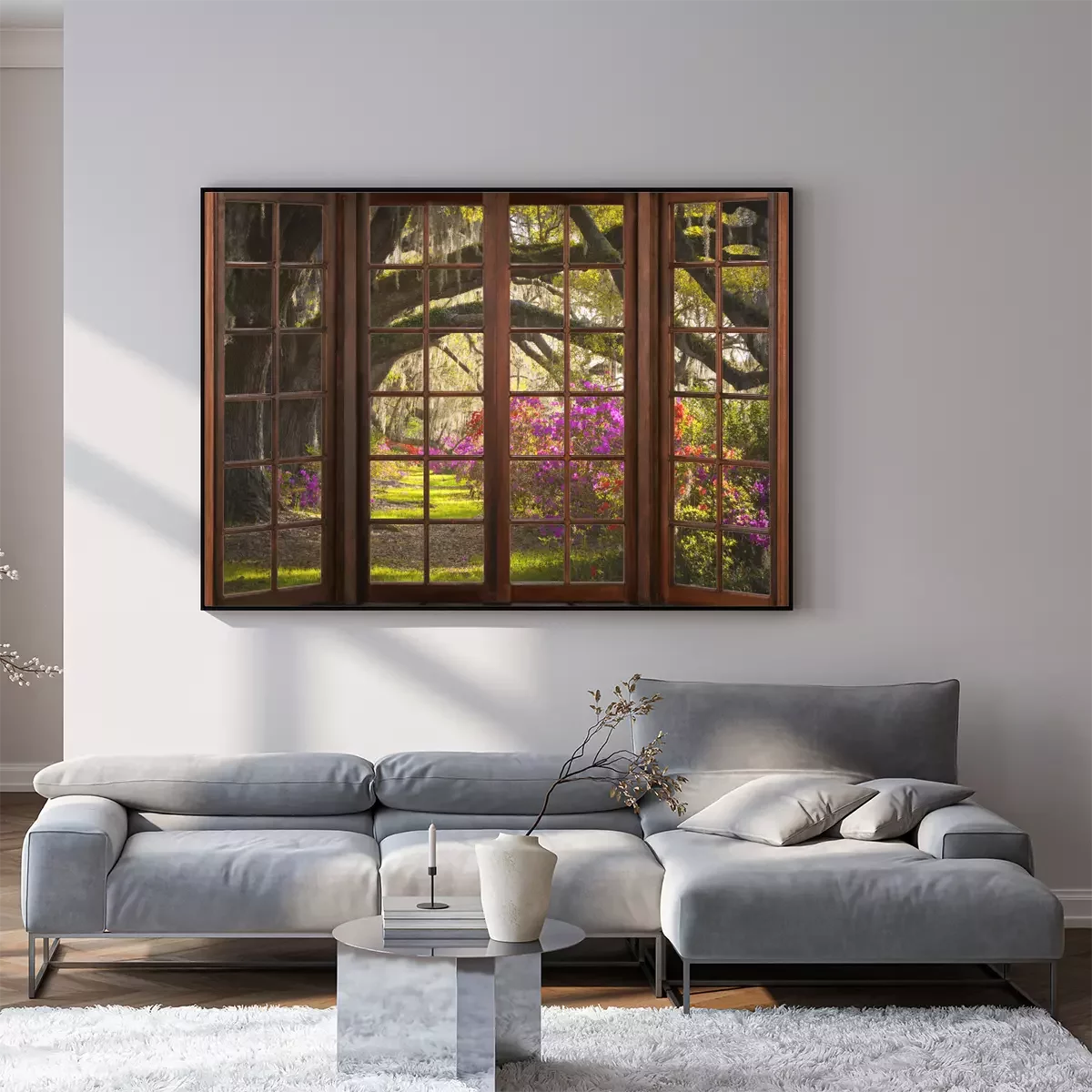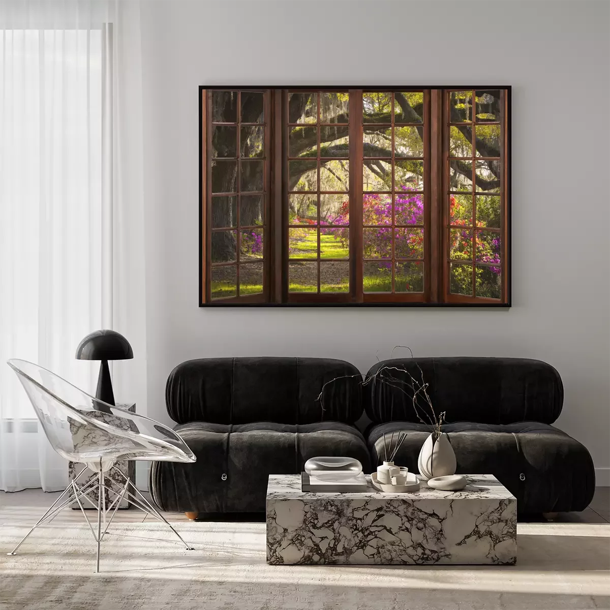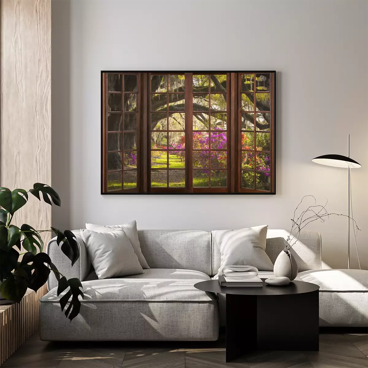 Poster : Vue de la fenêtre 3d. Belle vue sur la nature depuis la fenêtre.