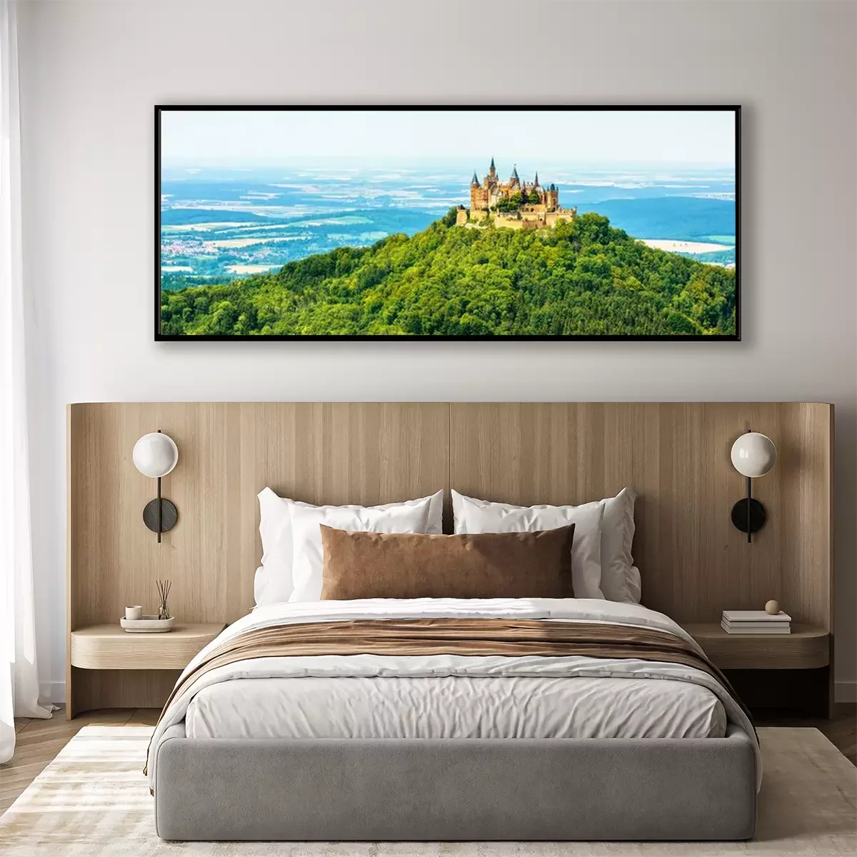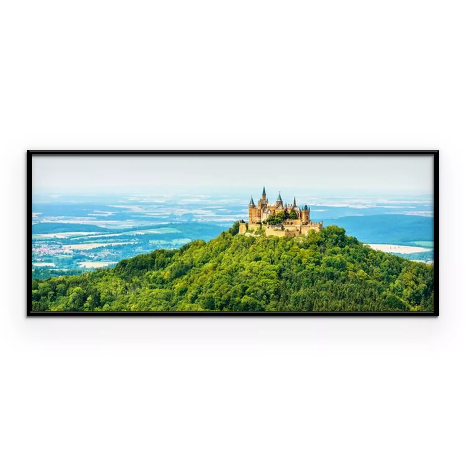 Hohenzollern Castle on mountain top, Germany. This castle is a famous landmark in vicinity of Stuttgart. Scenic view of Burg Hohenzollern in summer. Landscape of Swabian Alps with Gothic castle.