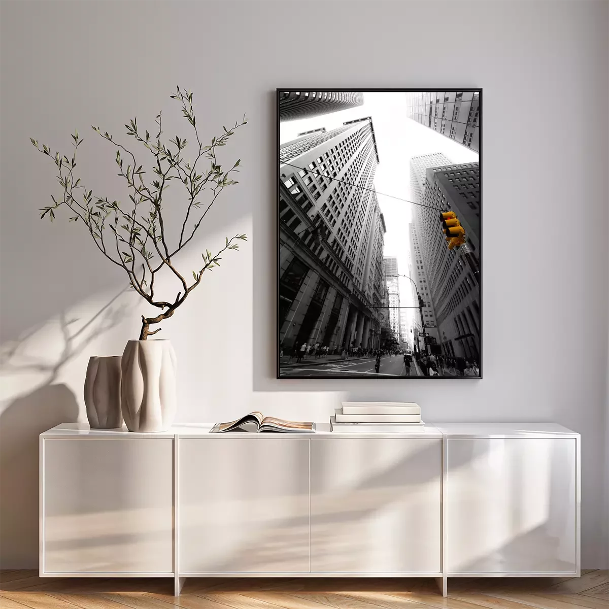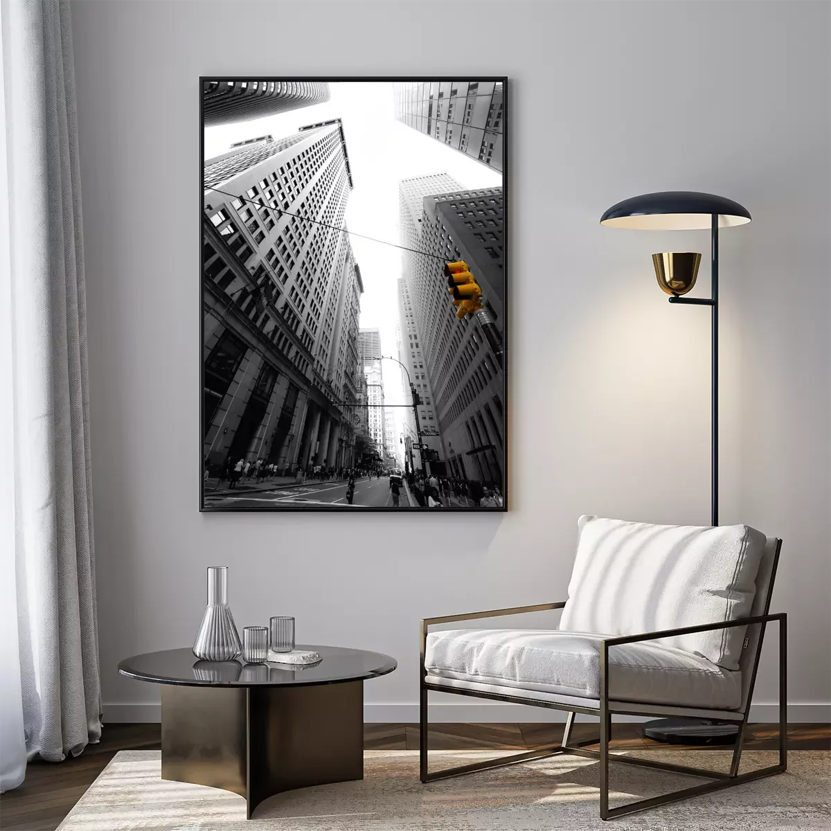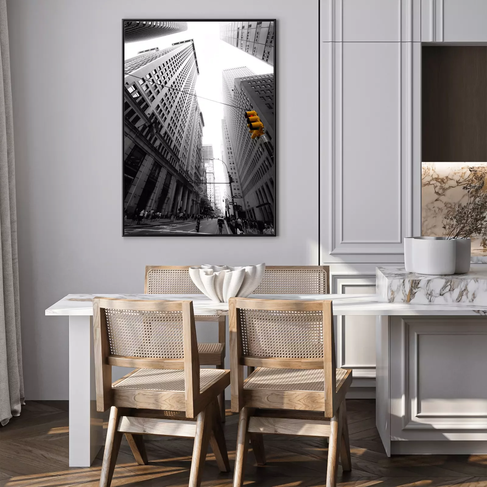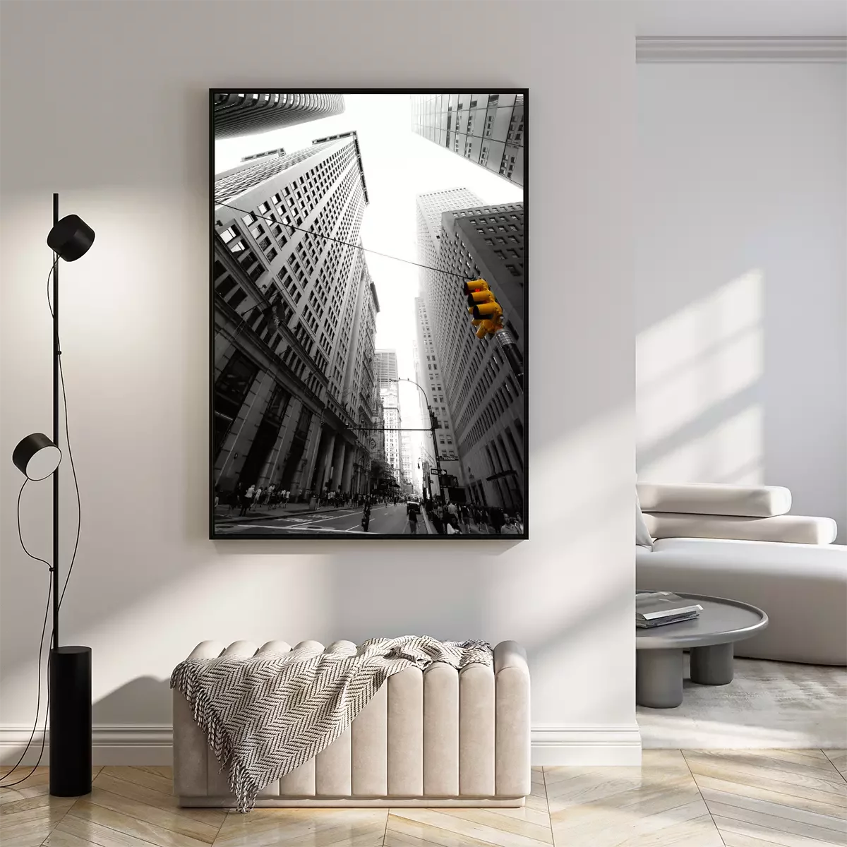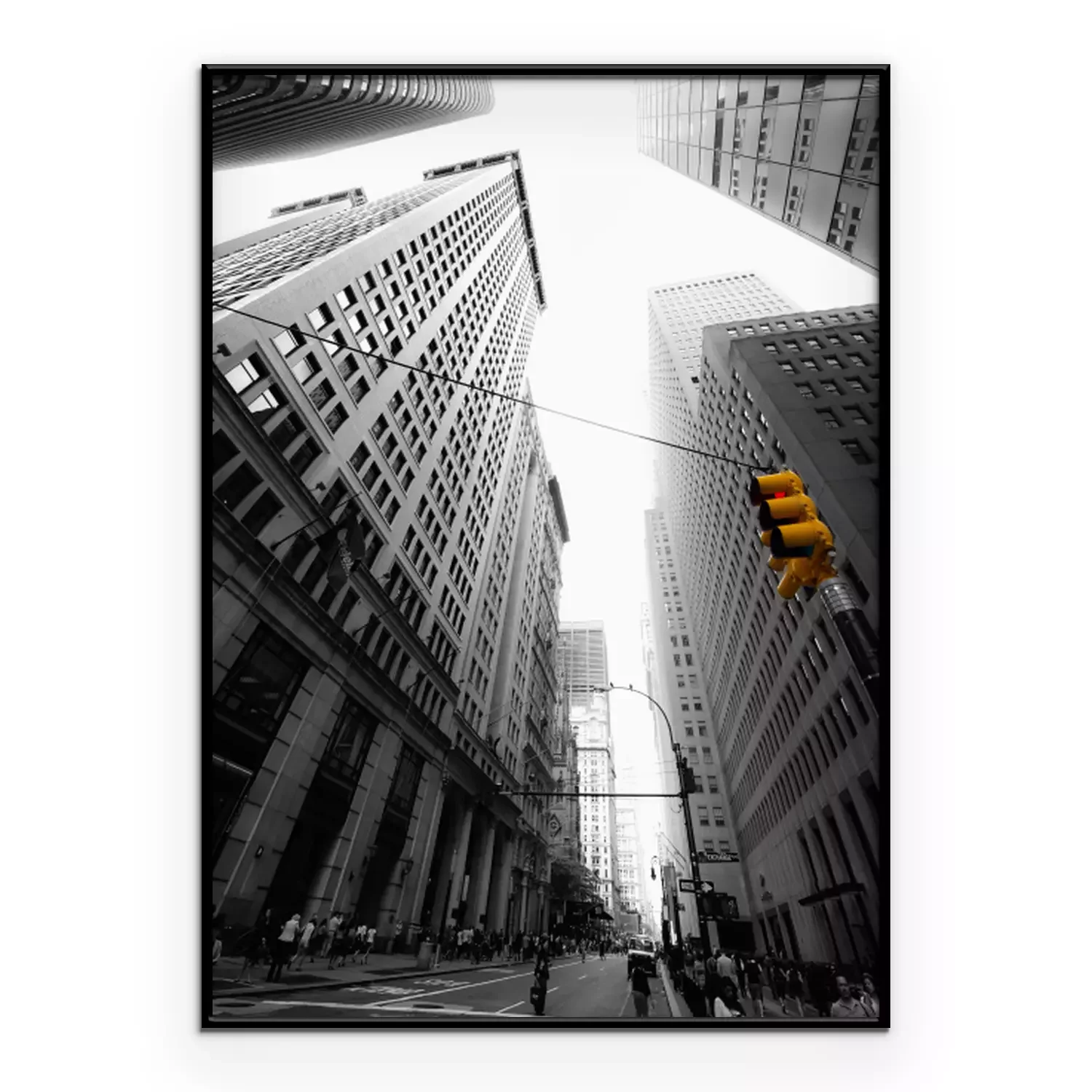 Poster  Vue urbaine en noir et blanc avec un accent jaune