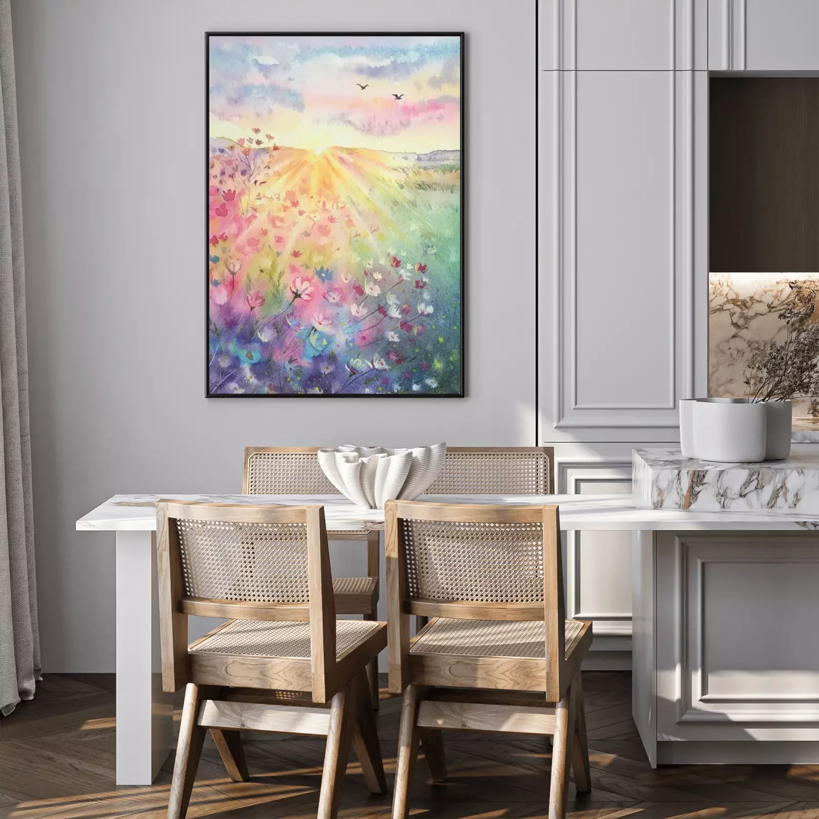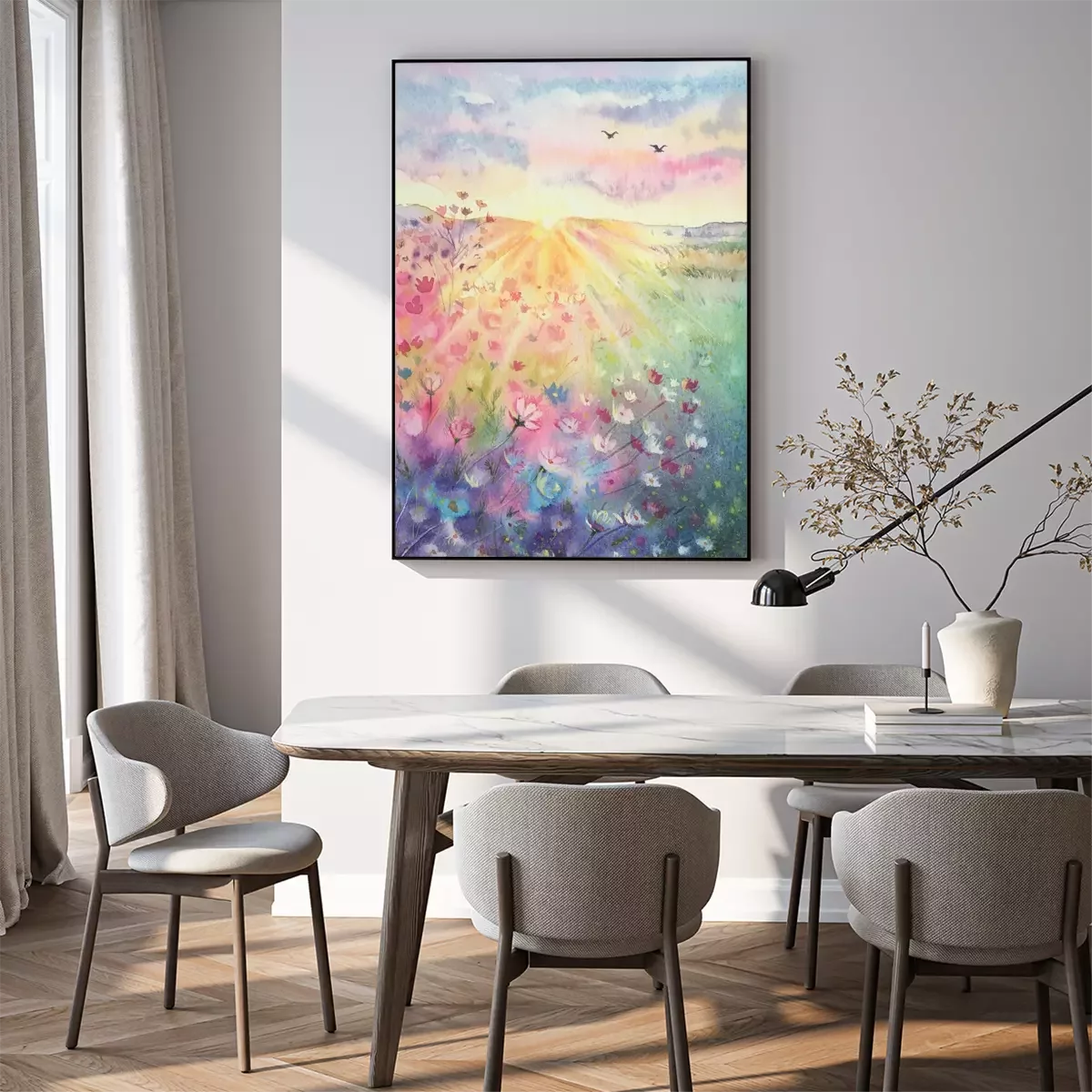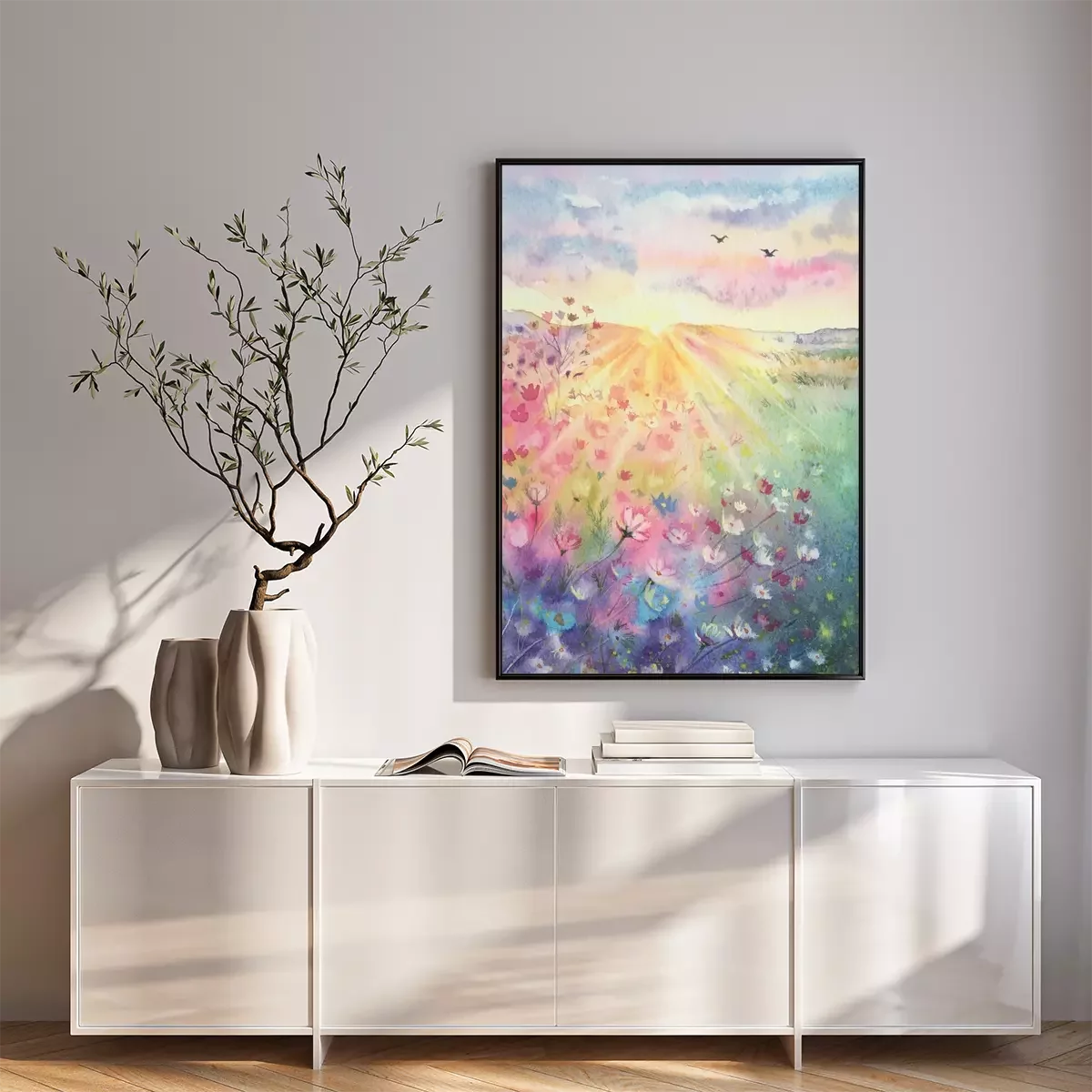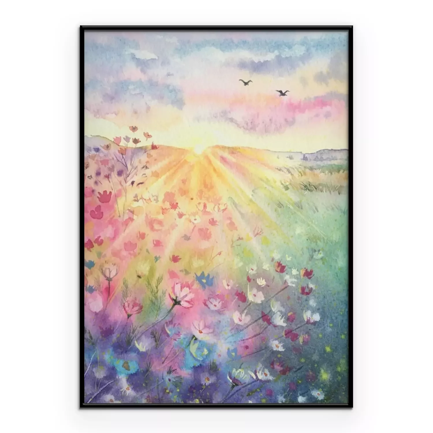 Poster : Watercolor beautiful rural landscape with sunrise and blossoming meadow. Purple, white flowers flowering on spring field. Happy new day concept. Vertical view, copy-space. Template for designs , card.
