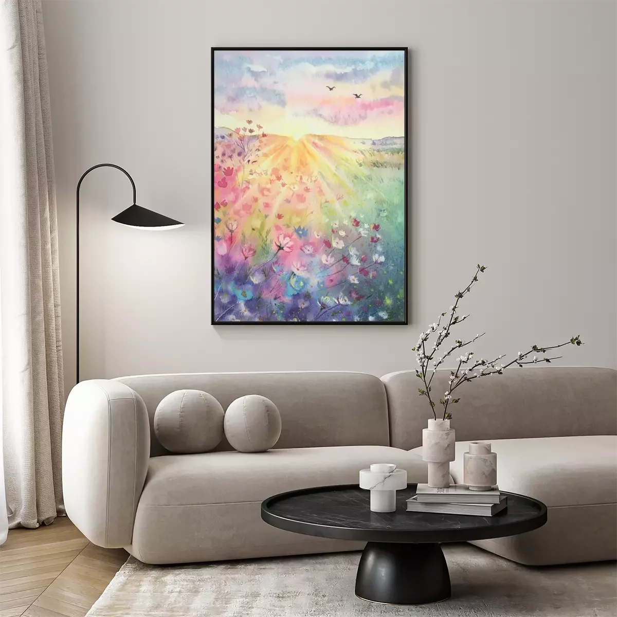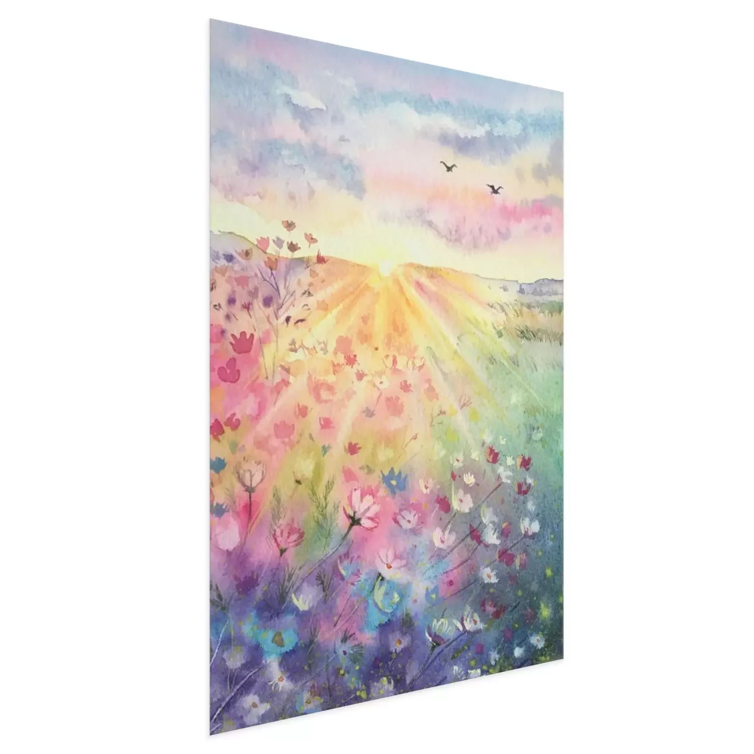 Poster  Watercolor beautiful rural landscape with sunrise and blossoming meadow. Purple, white flowers flowering on spring field. Happy new day concept. Vertical view, copy-space. Template for designs , card.