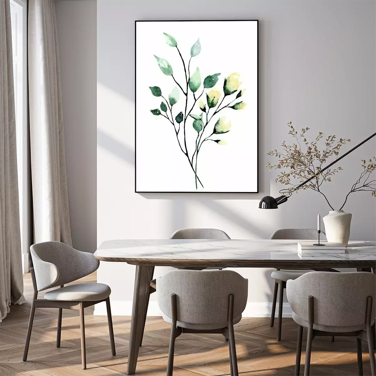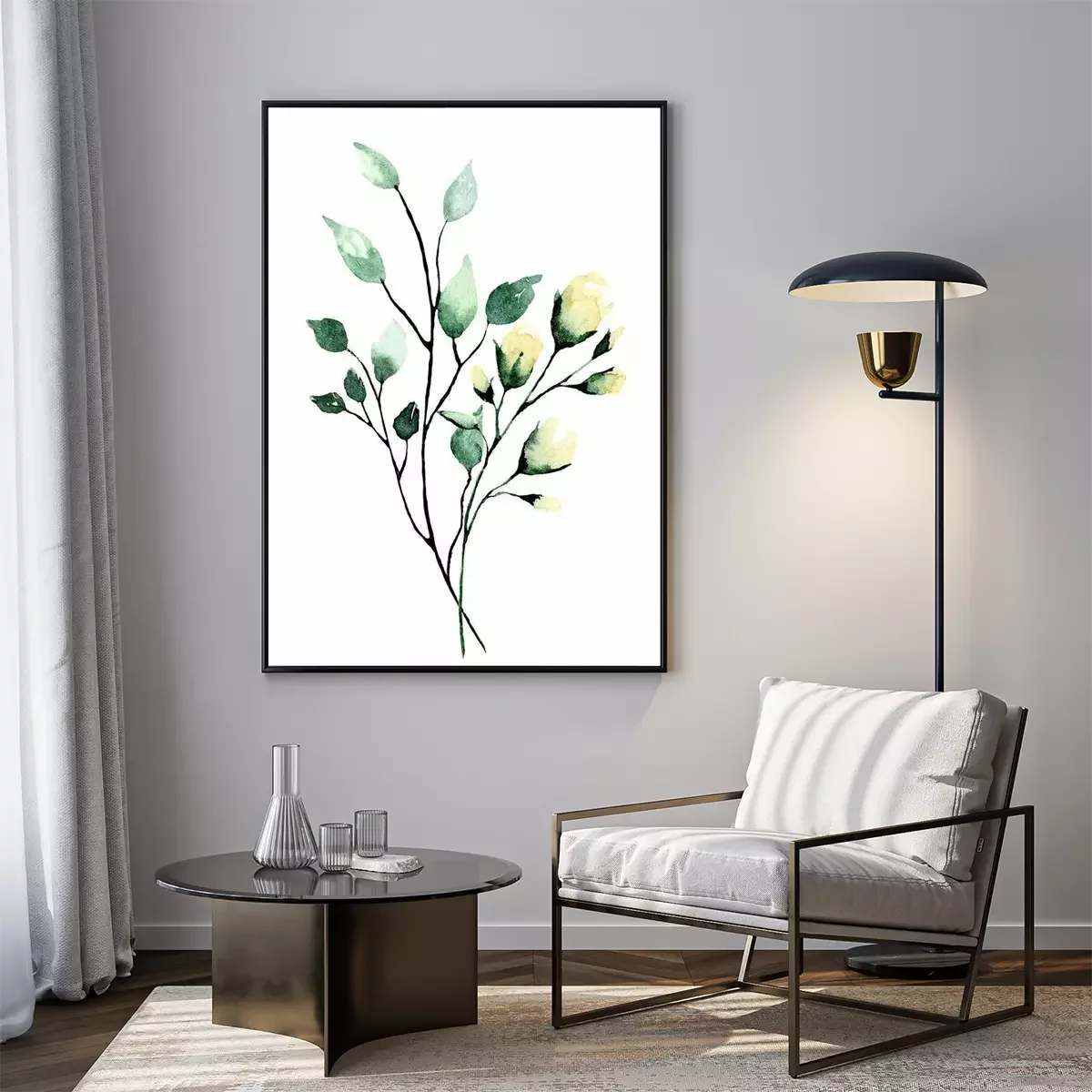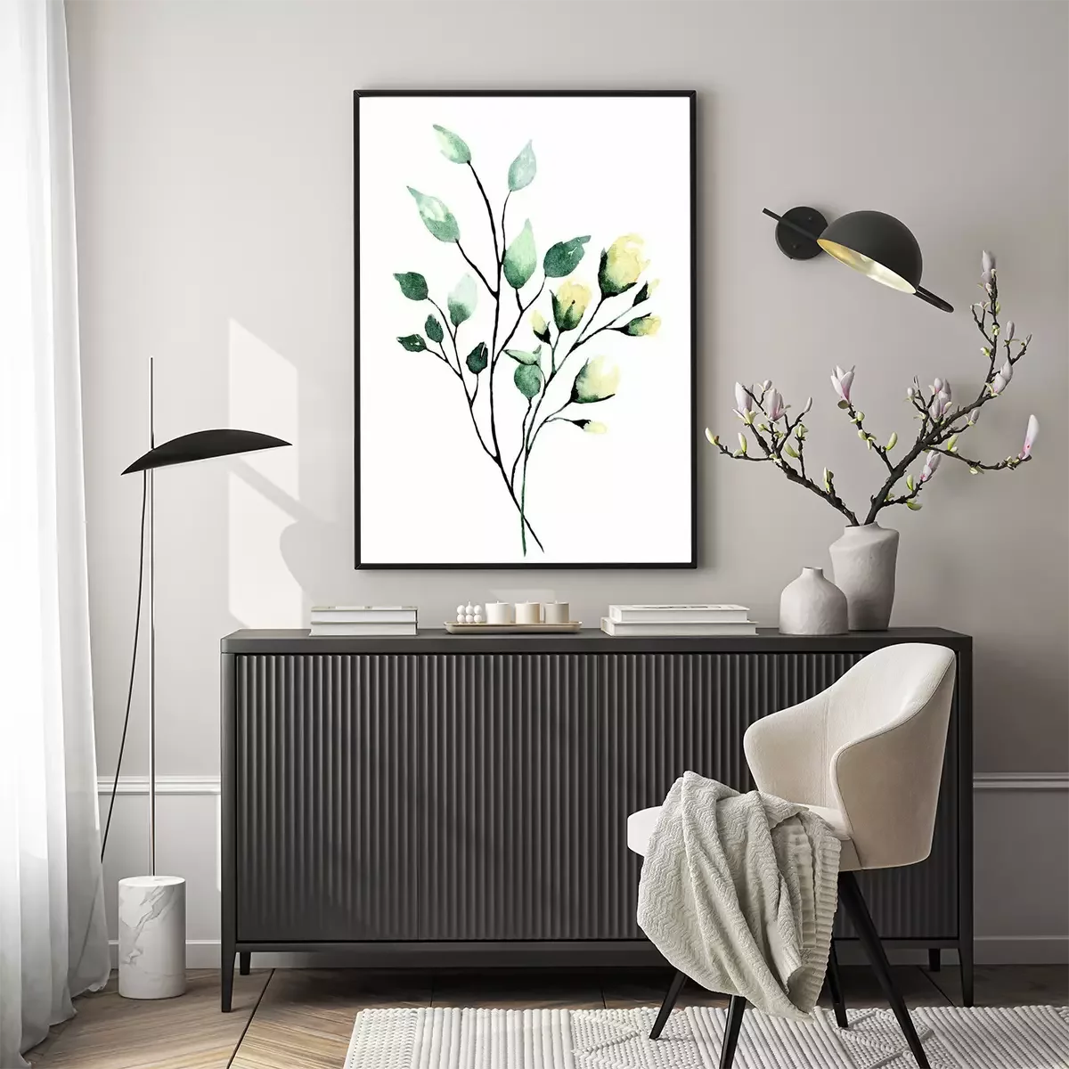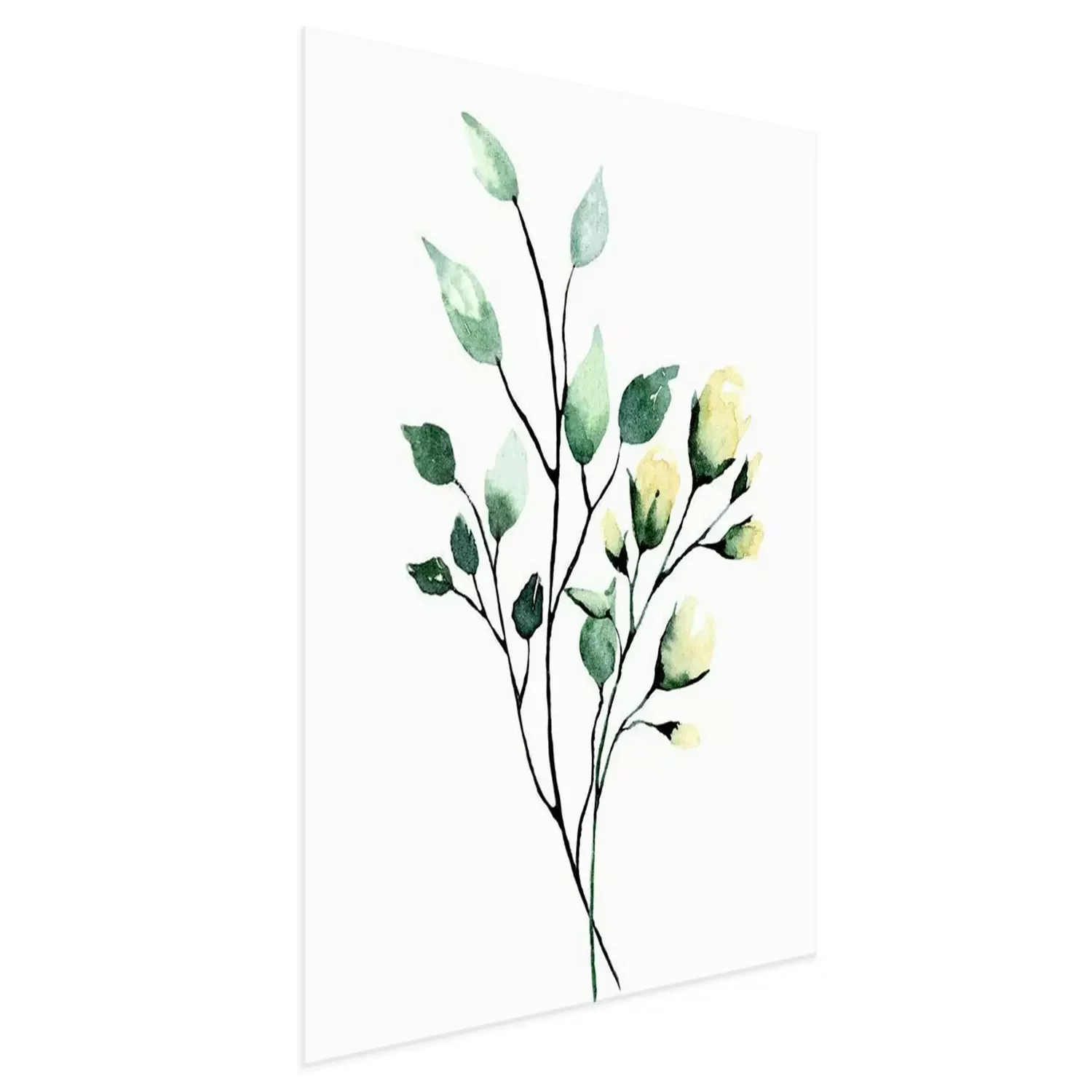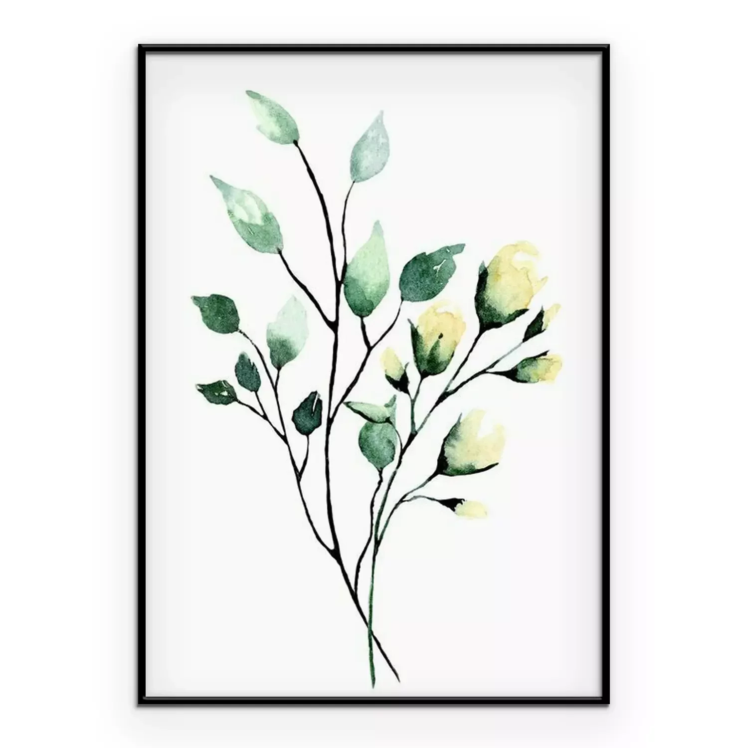 Poster  Watercolor branch with green leaves and flowers roses. Hand painting floral illustration. Leaf, plant isolated on white background.
