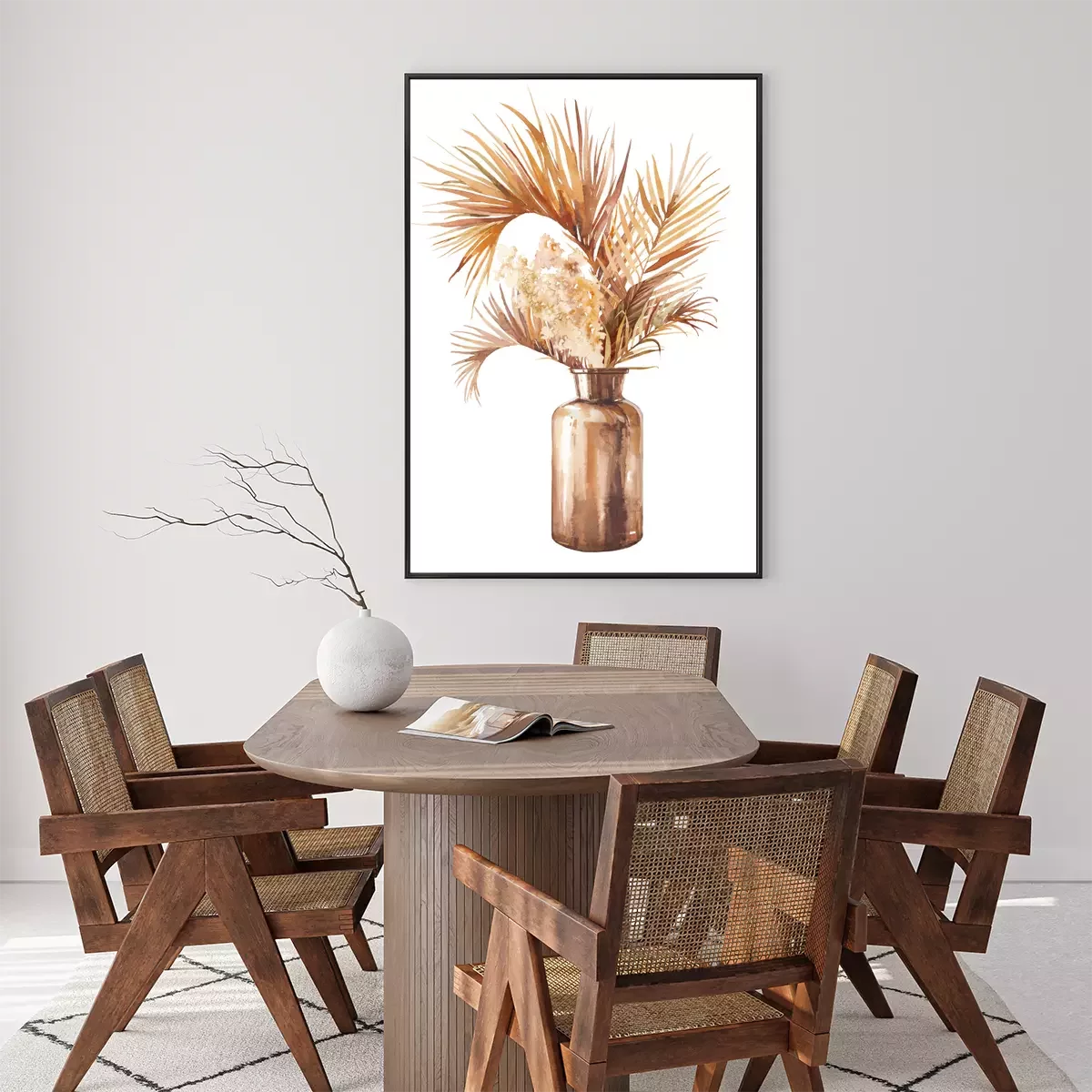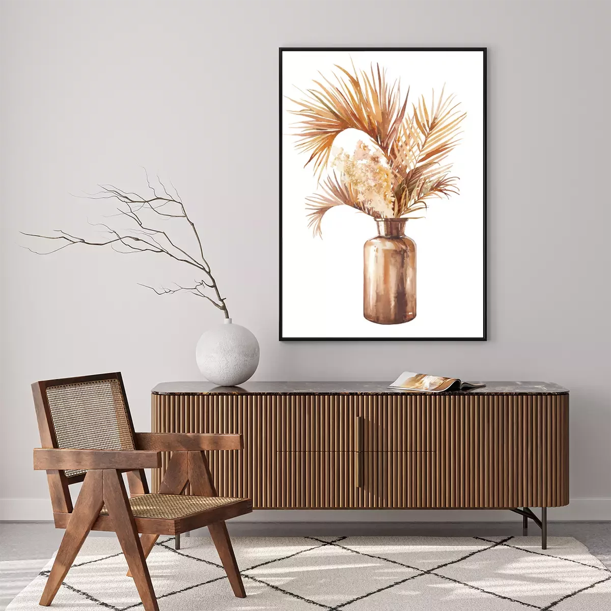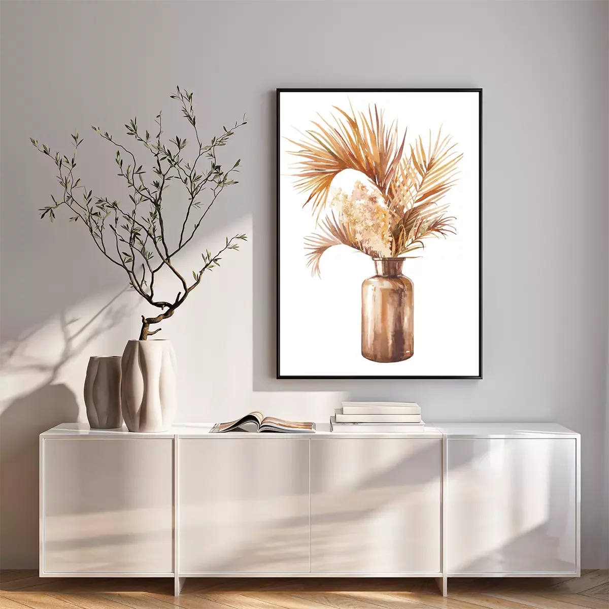 Poster  Watercolor dried tropical plants bouquet in glass bottle. Boho chic home decor. Isolated illustration on white background
