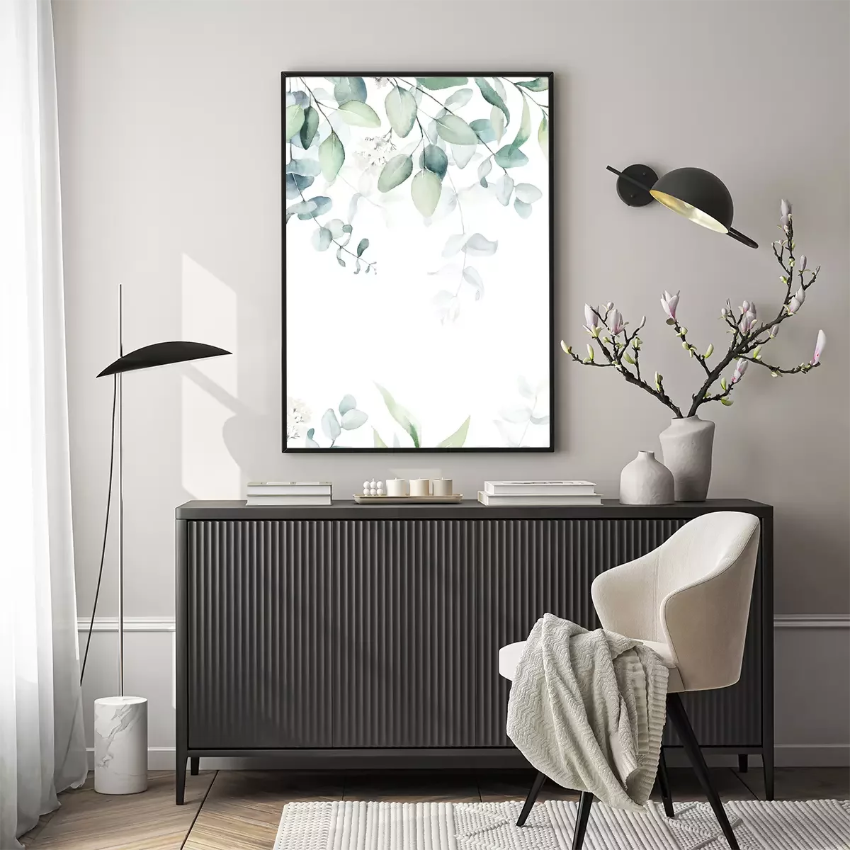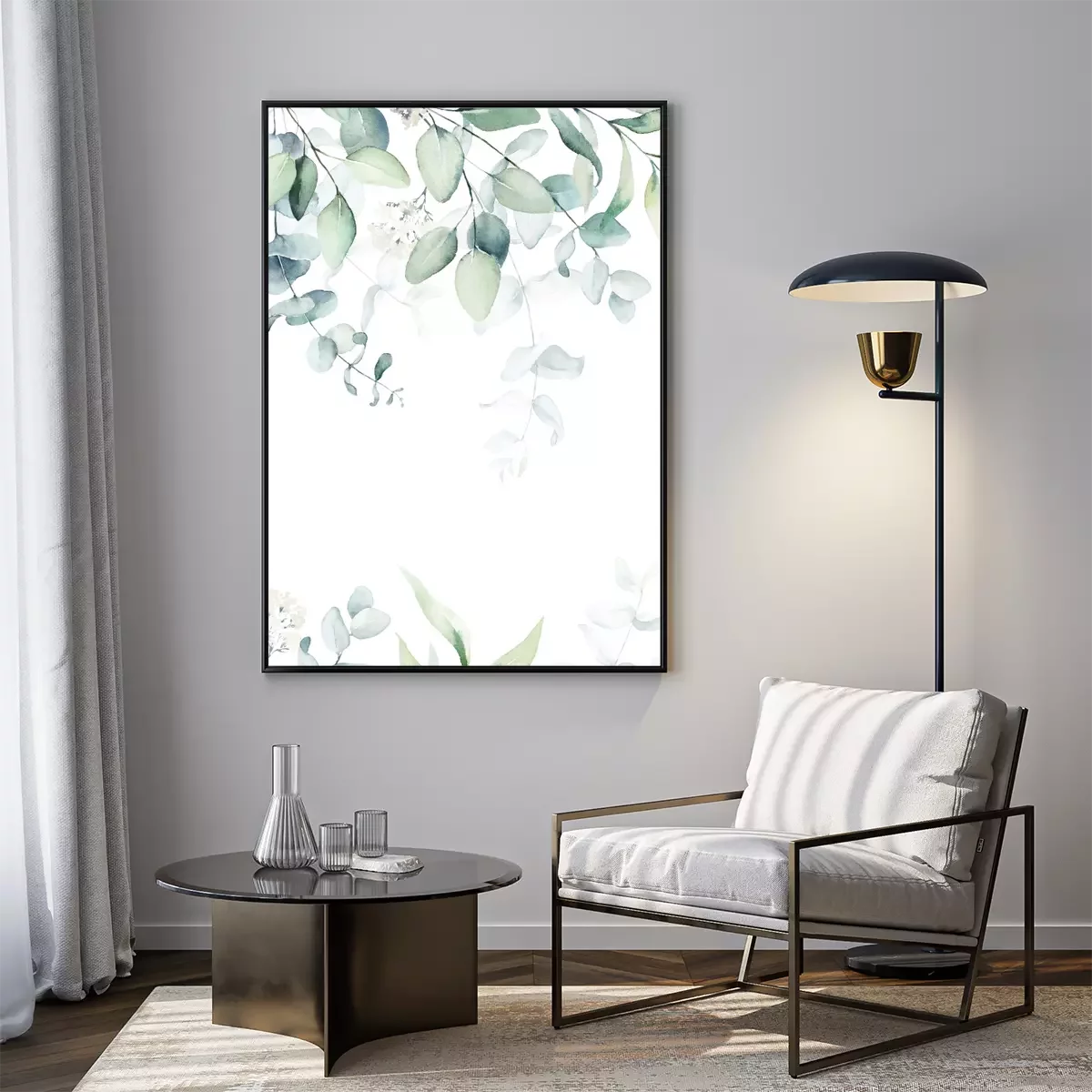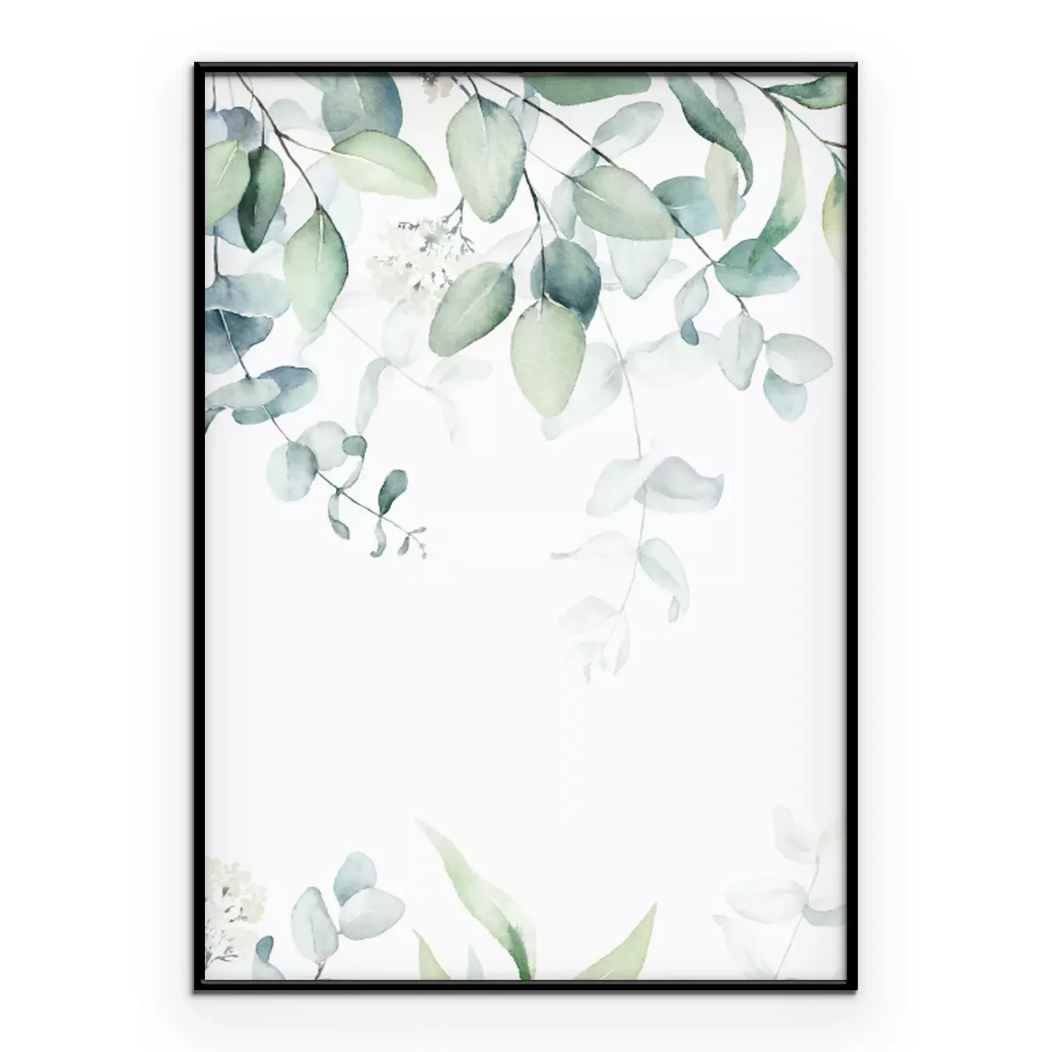 Poster  Watercolor floral illustration with green branches & leaves - frame / border, for wedding stationary, greetings, wallpapers, fashion, background. Eucalyptus, olive, green leaves, etc.