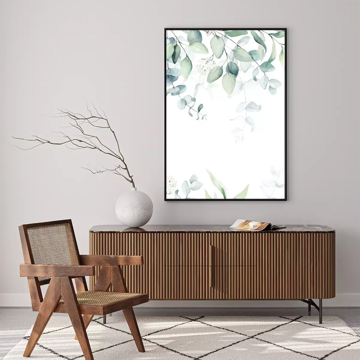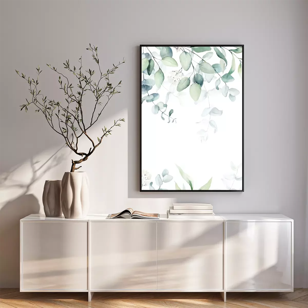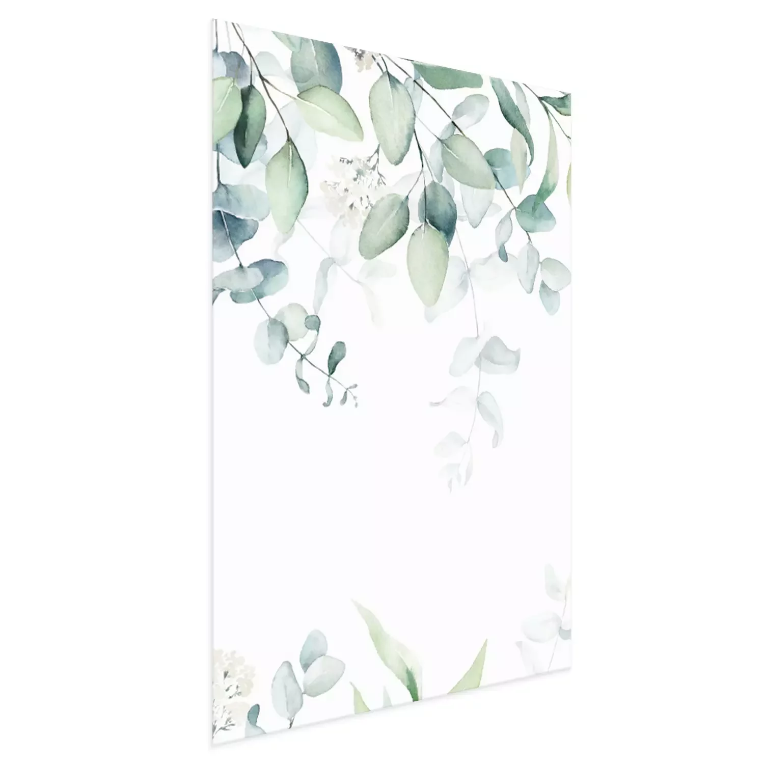 Poster  Watercolor floral illustration with green branches & leaves - frame / border, for wedding stationary, greetings, wallpapers, fashion, background. Eucalyptus, olive, green leaves, etc.