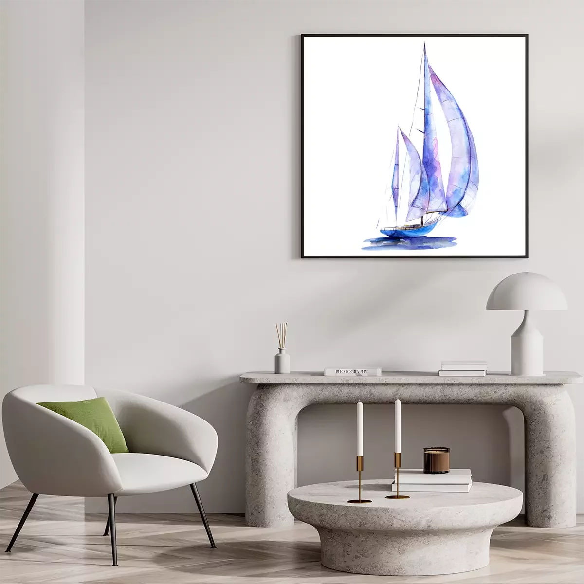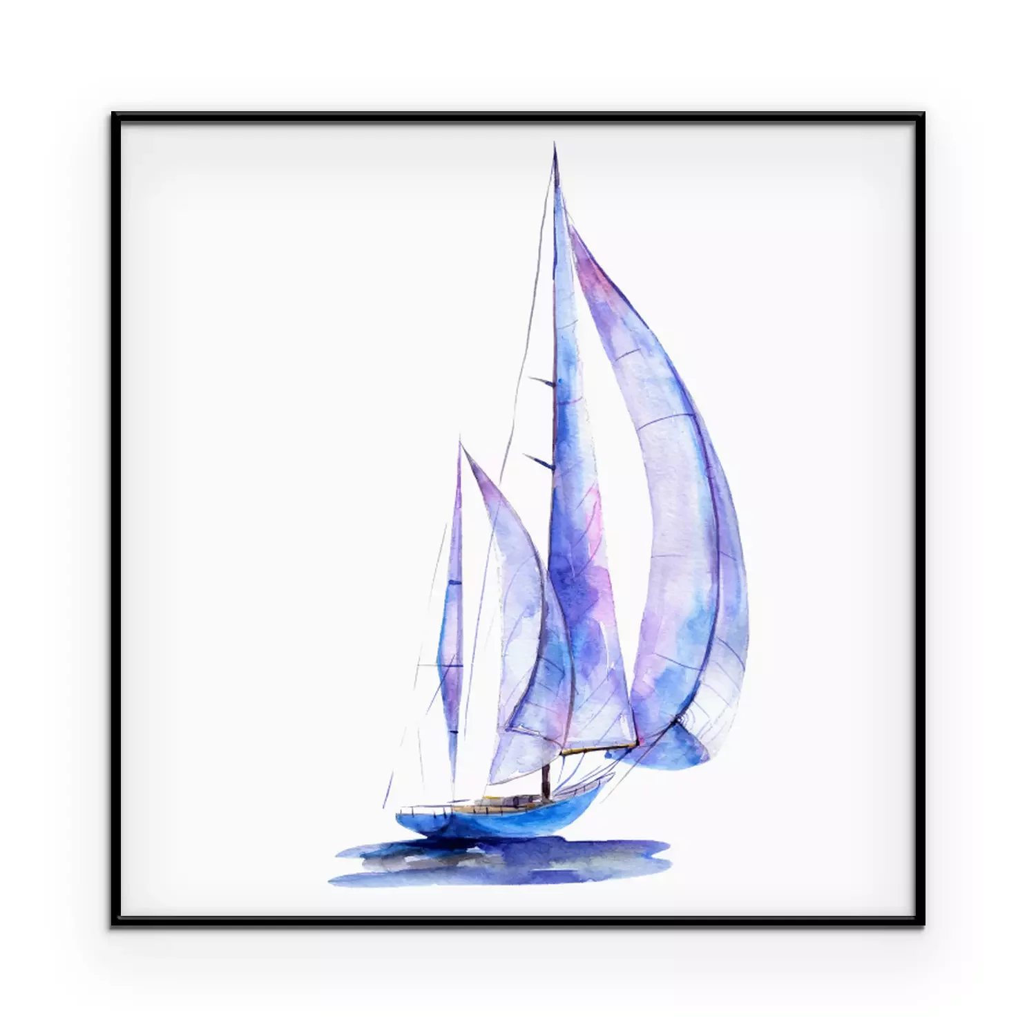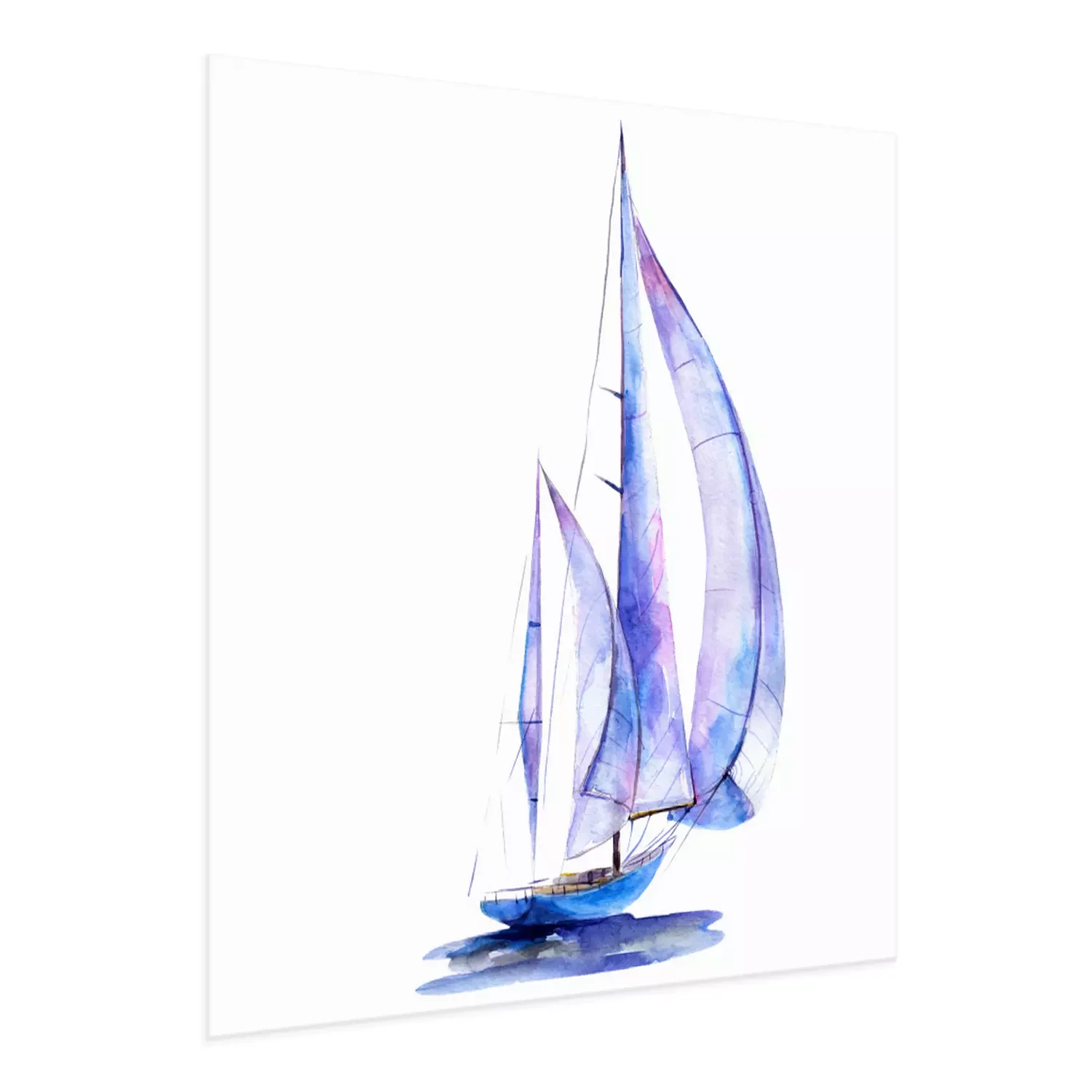 Poster  Watercolor illustration, hand drawn painted sailboat isolated object on white background. Art print boat with blue sails.